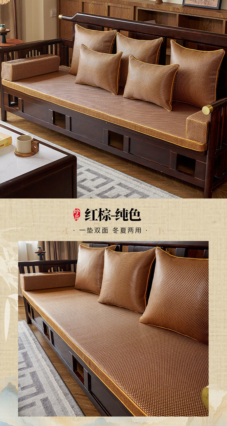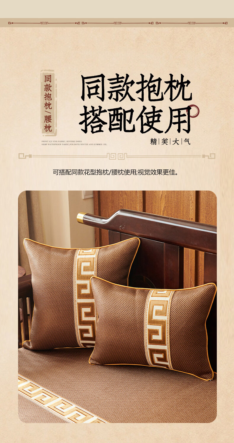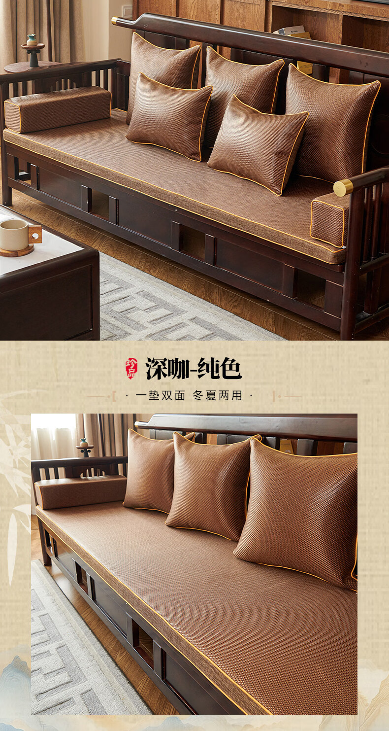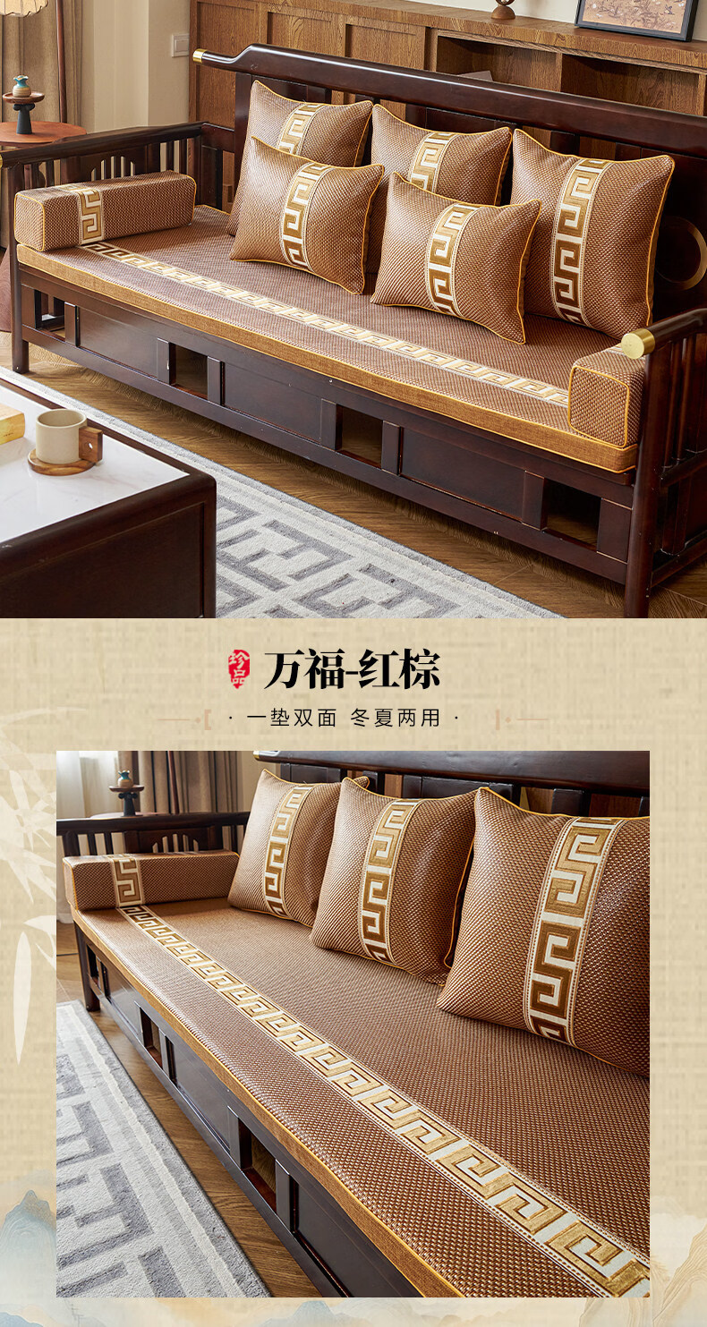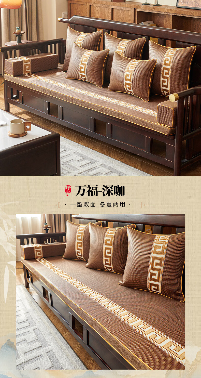 正圣新中式藤席沙发垫四季通用防滑2026年新款夏季藤麻双面沙发海绵垫 万福深咖【一垫双用】 52*55cm单人座【升级50D海绵】