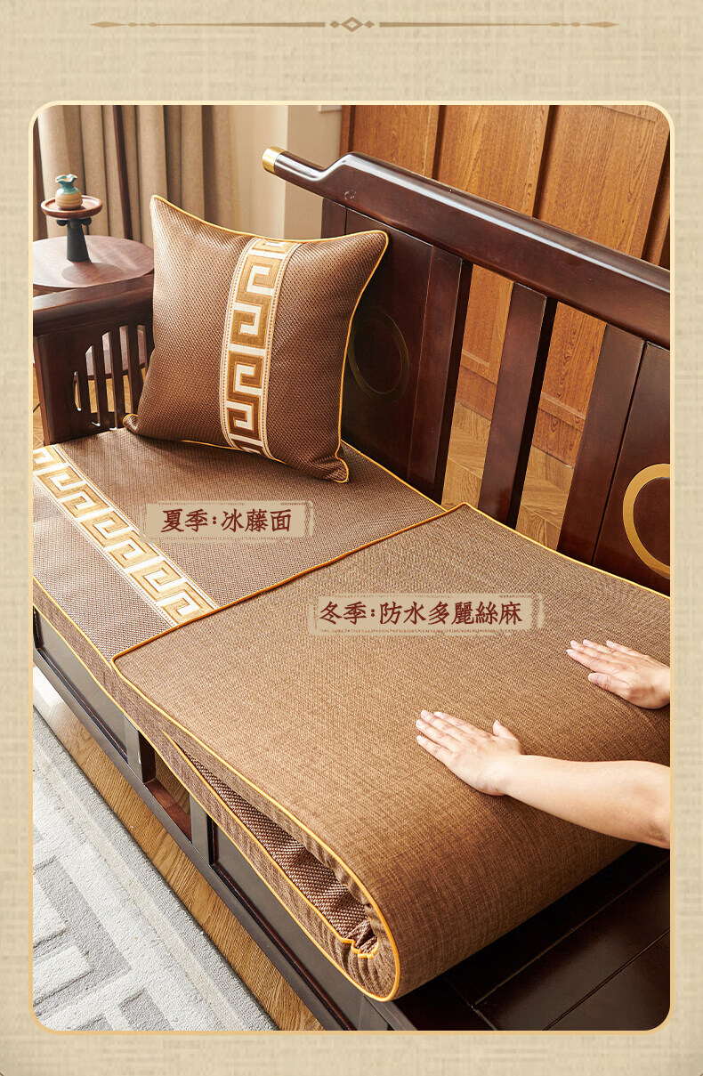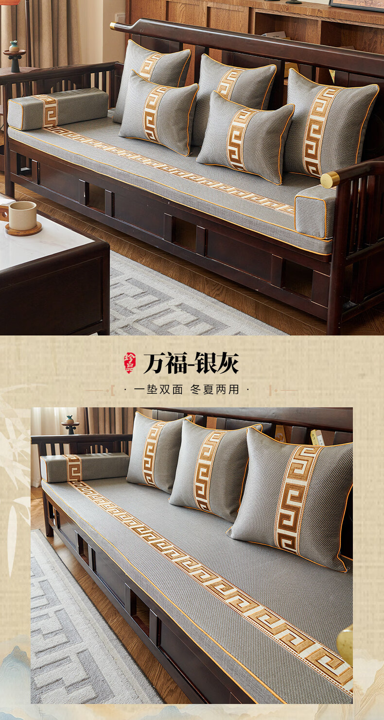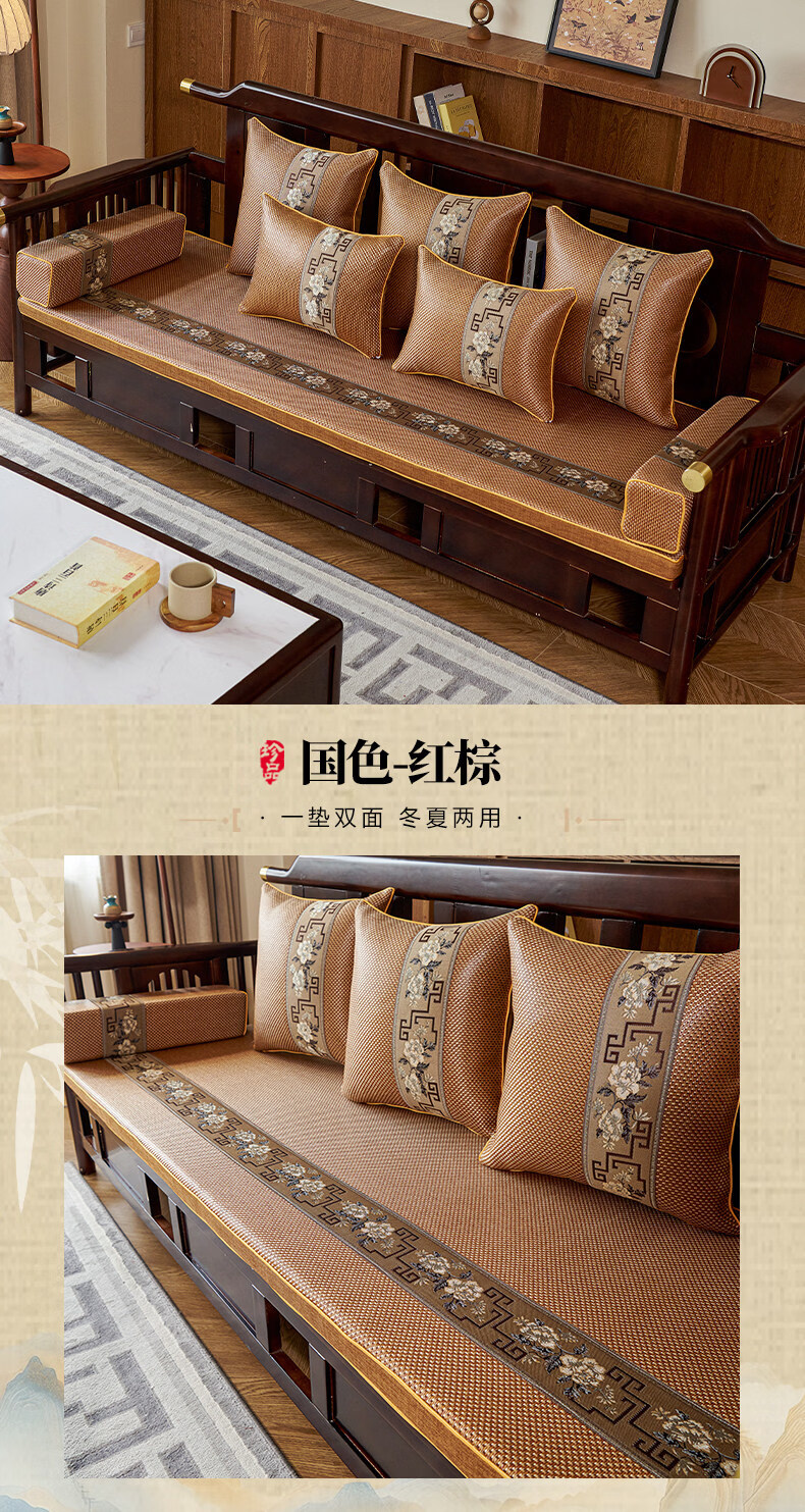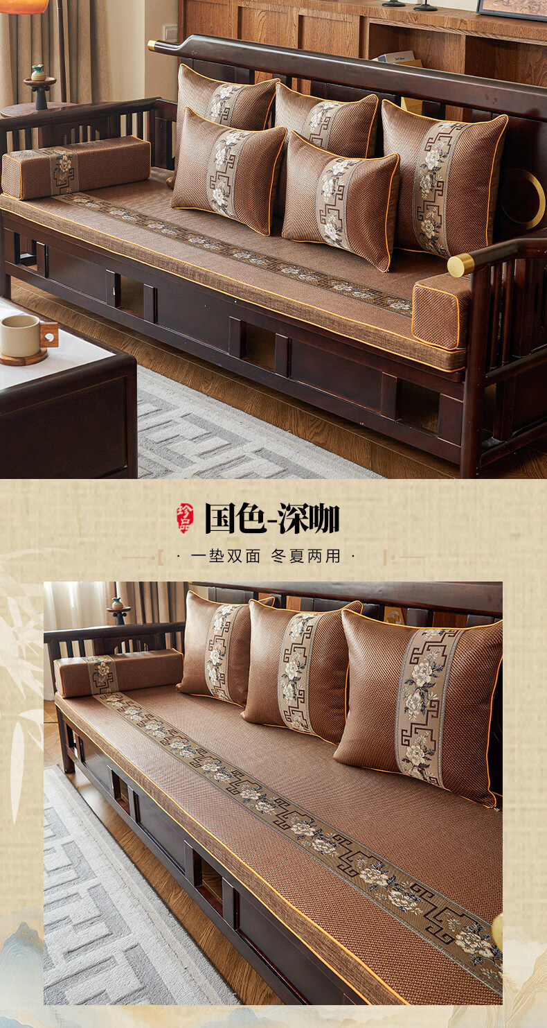 正圣新中式藤席沙发垫四季通用防滑2026年新款夏季藤麻双面沙发海绵垫 万福深咖【一垫双用】 52*55cm单人座【升级50D海绵】