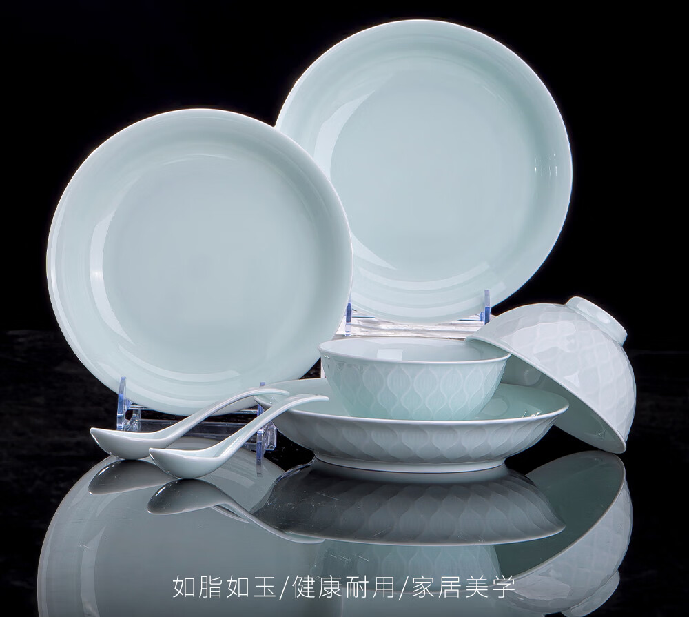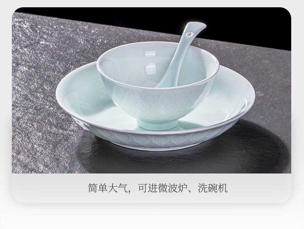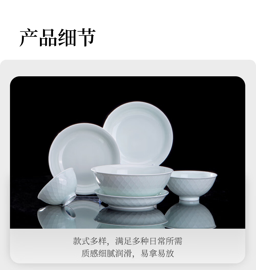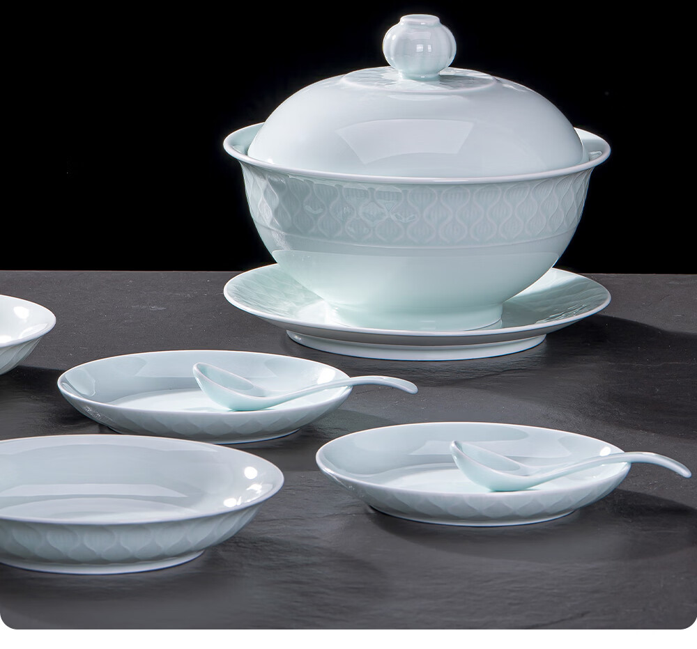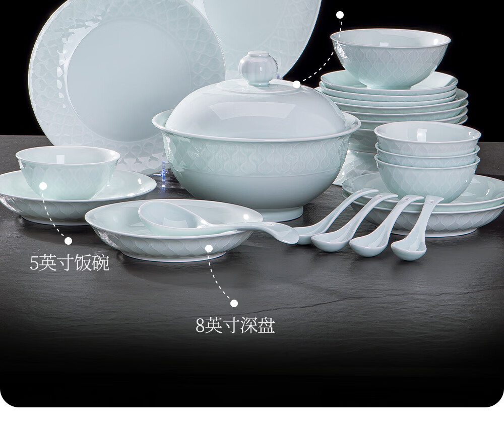 韵之和碗碟盘景德镇原矿釉高岭土高温青瓷餐具浮雕碗具整套家用盘子送礼 国色天香-56件8人食配品锅