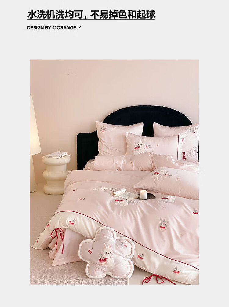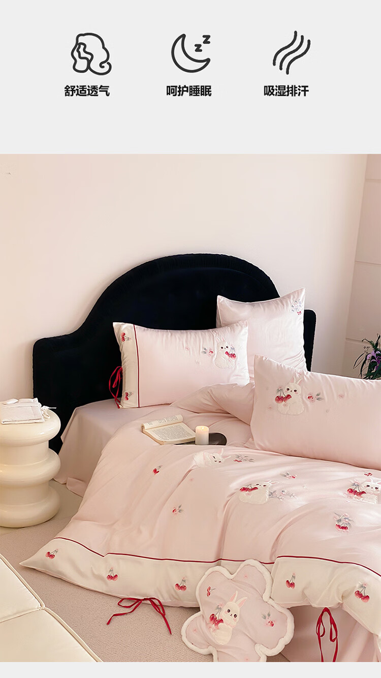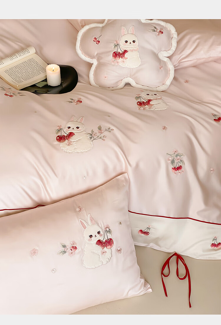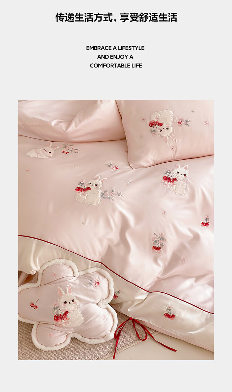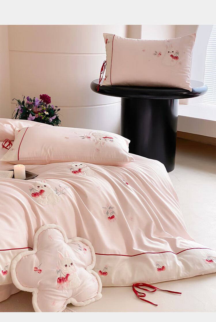 ROLAND LIVE全棉刺绣四件套可爱风纯棉被套床单透气1.8m床亲肤床上用品套件 MX 全棉四件套-樱兔蜜语红色 1.5米床 床单款 【被套200*230cm】