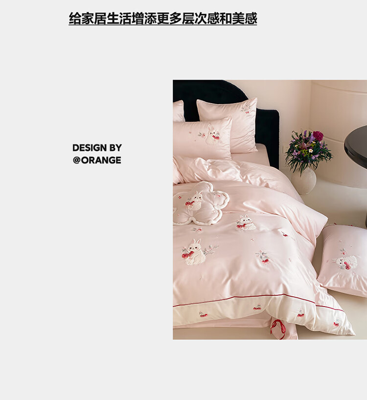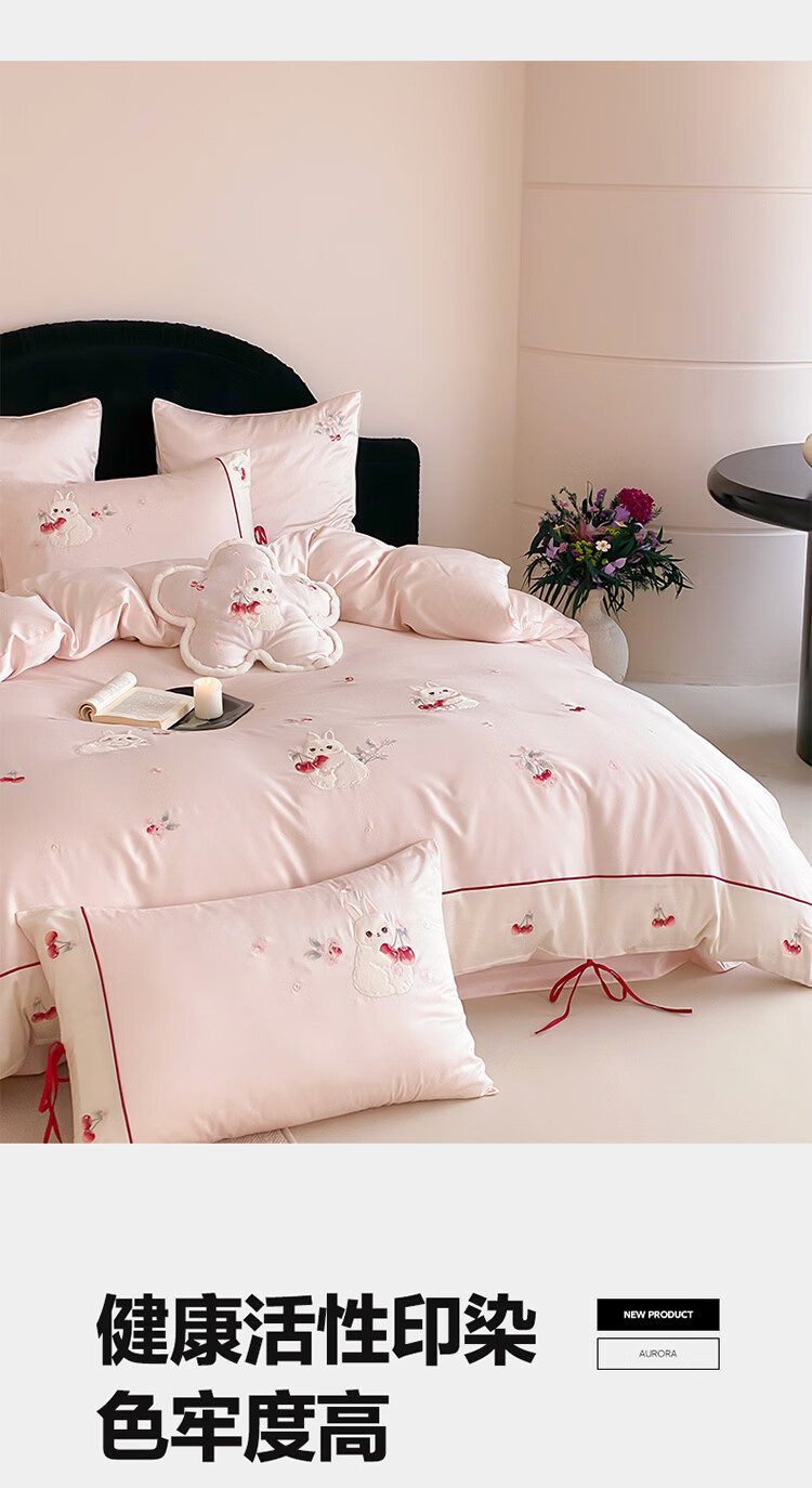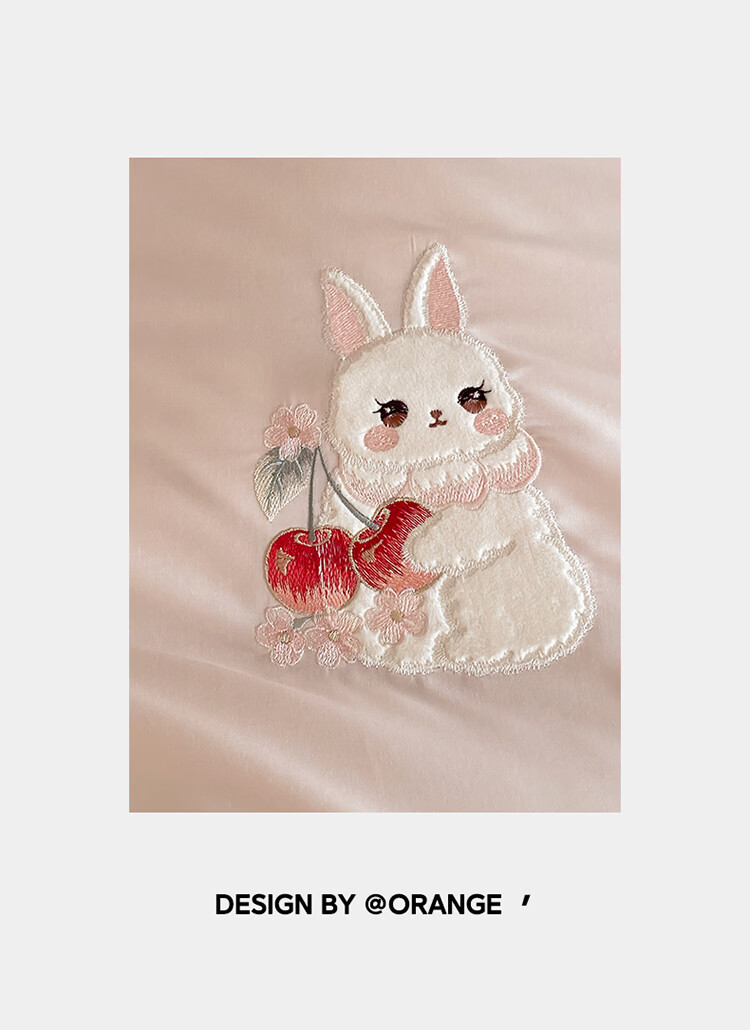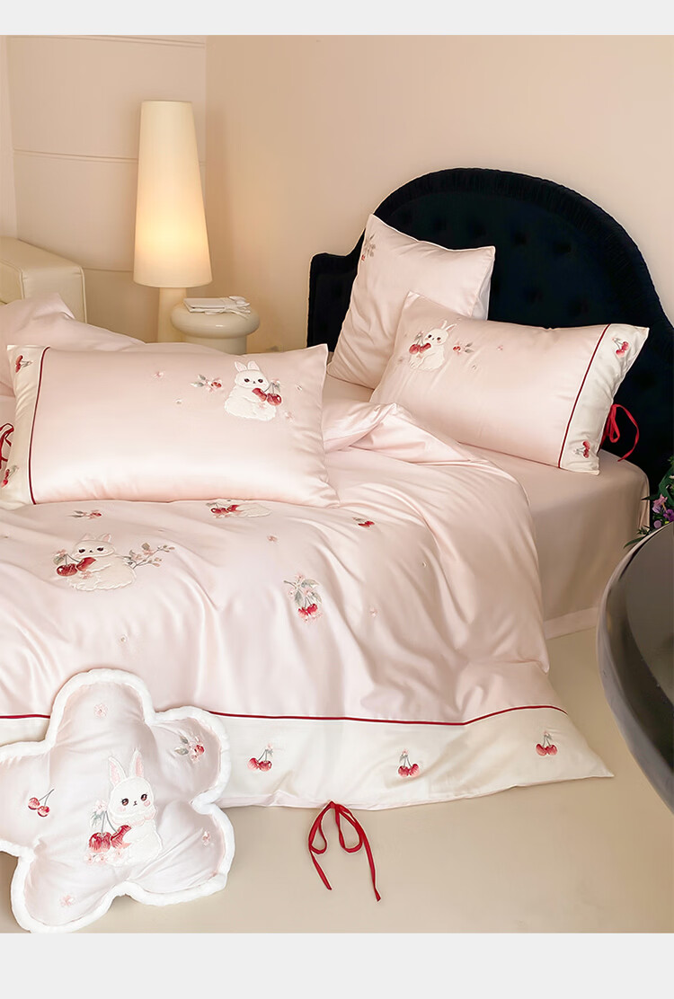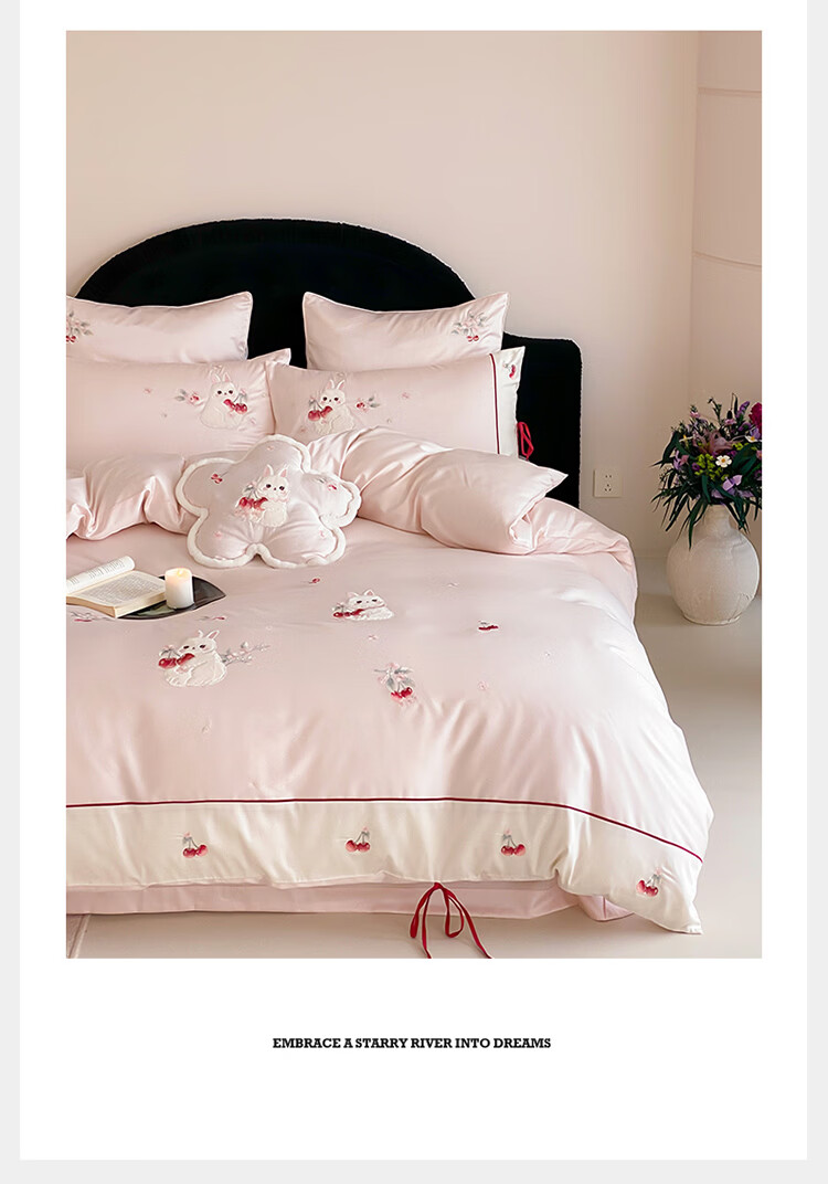 ROLAND LIVE全棉刺绣四件套可爱风纯棉被套床单透气1.8m床亲肤床上用品套件 MX 全棉四件套-樱兔蜜语红色 1.5米床 床单款 【被套200*230cm】