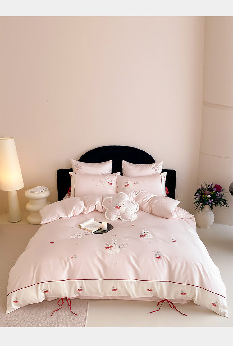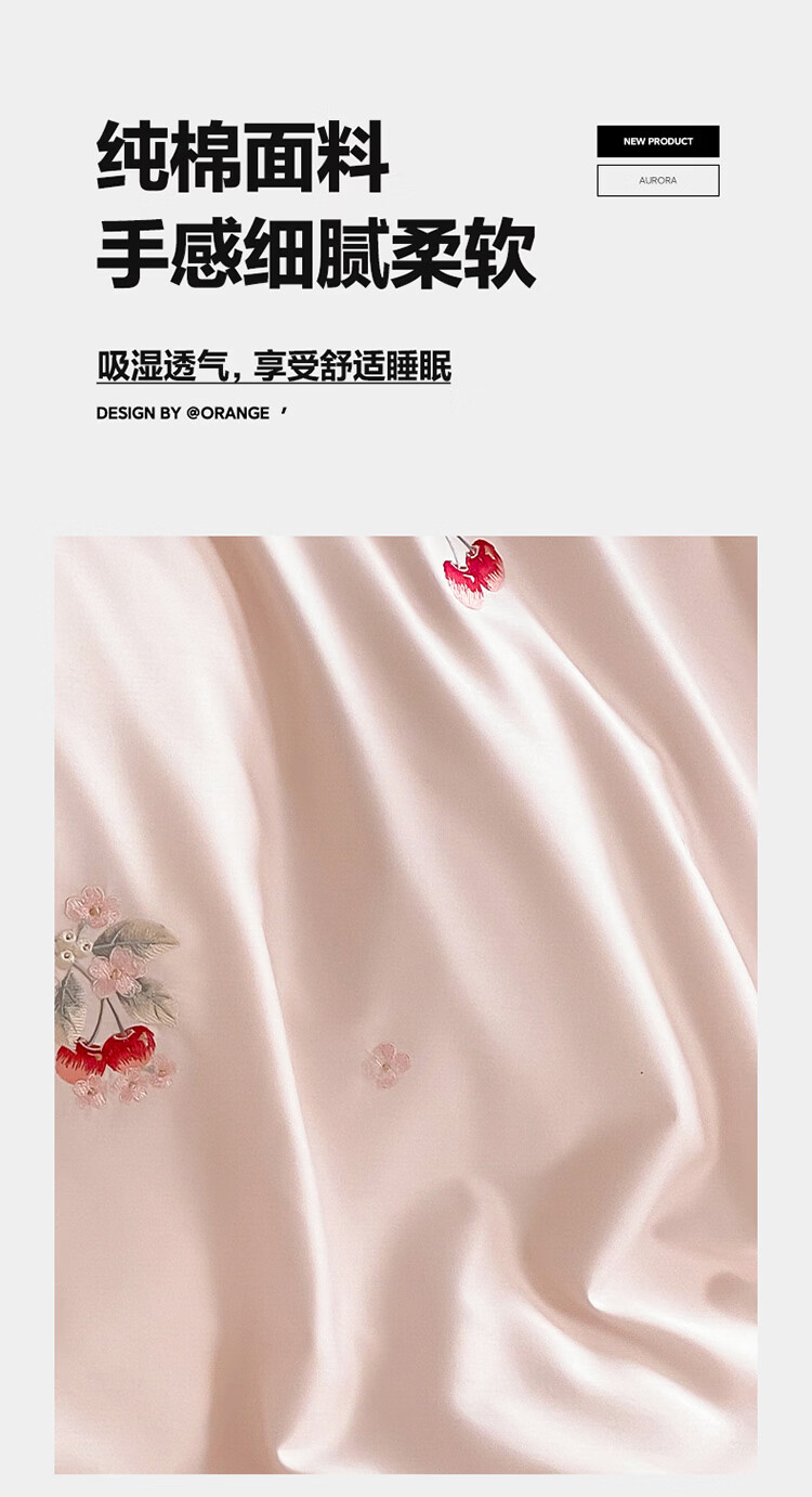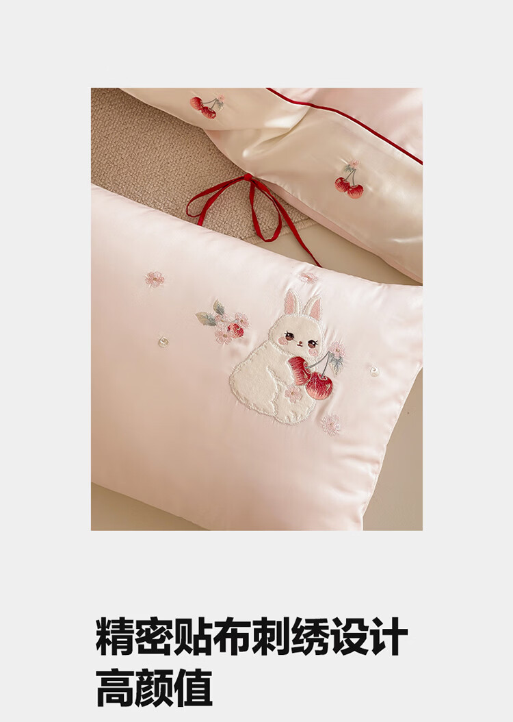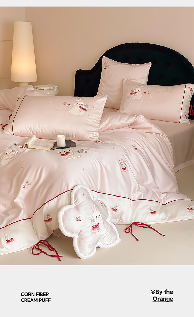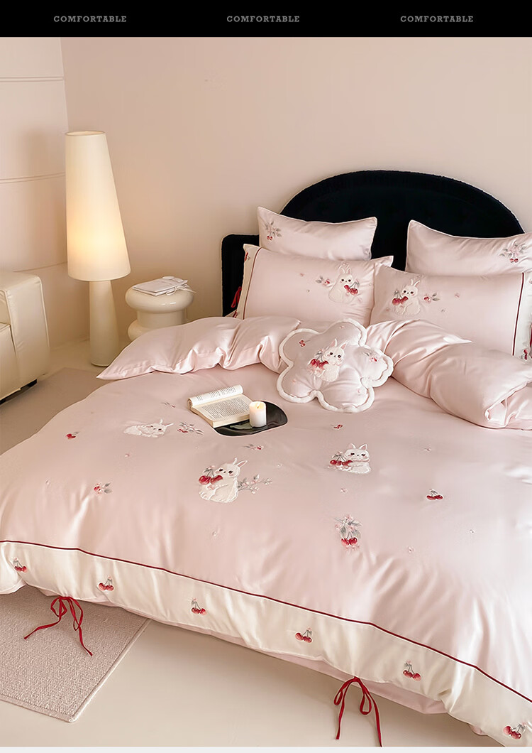 ROLAND LIVE全棉刺绣四件套可爱风纯棉被套床单透气1.8m床亲肤床上用品套件 MX 全棉四件套-樱兔蜜语红色 1.5米床 床单款 【被套200*230cm】