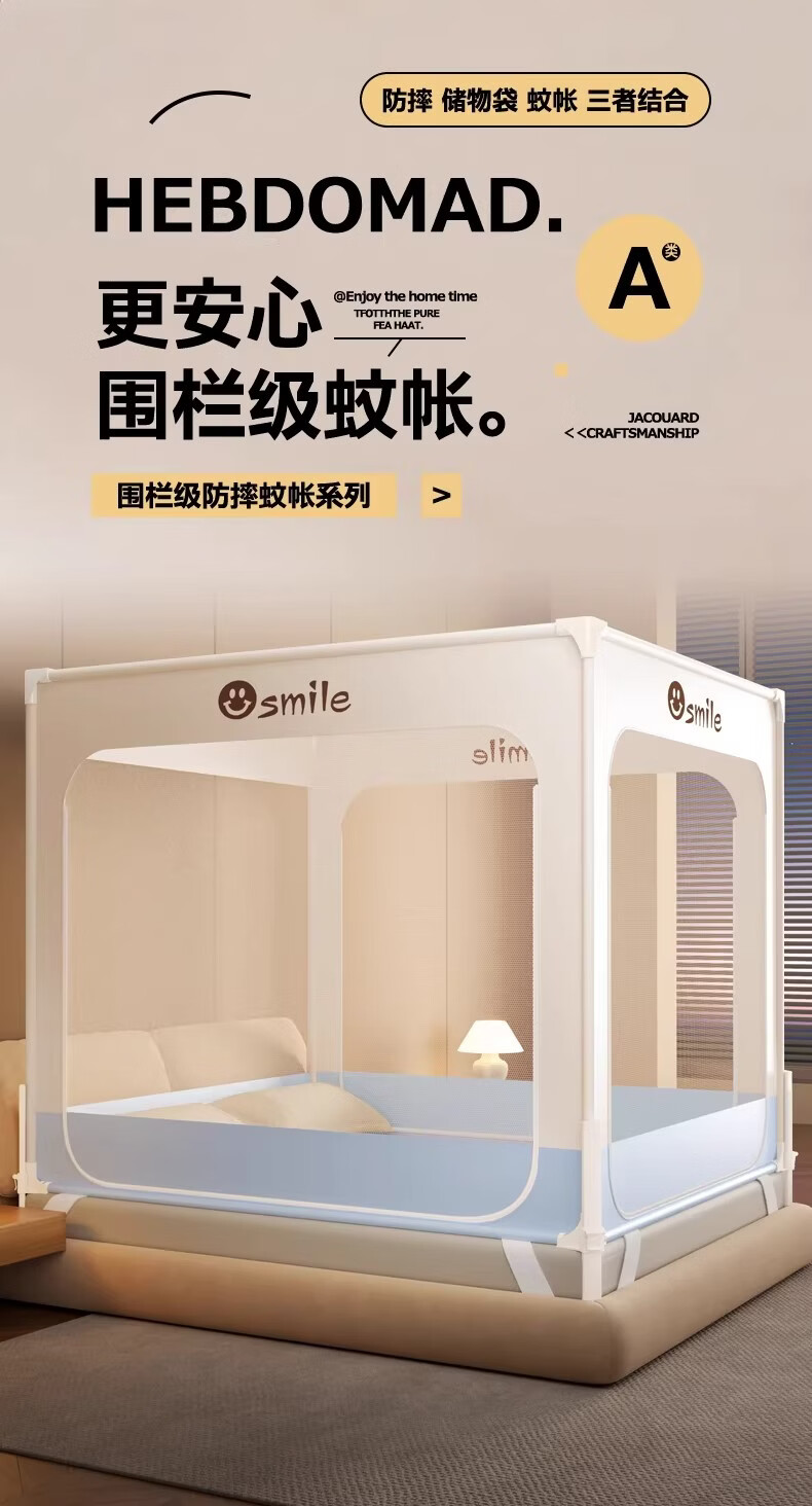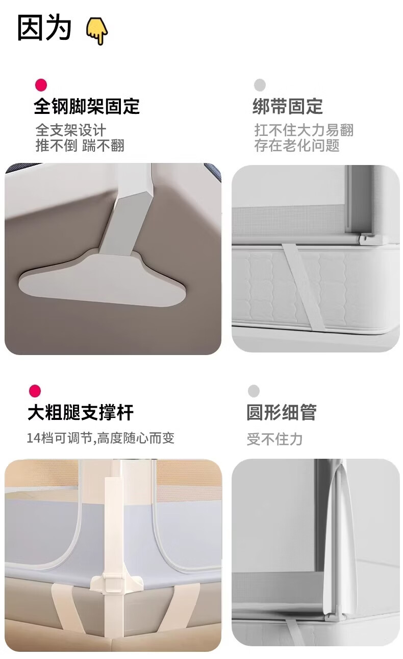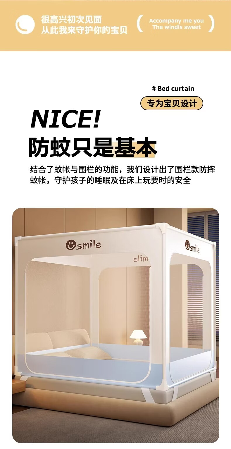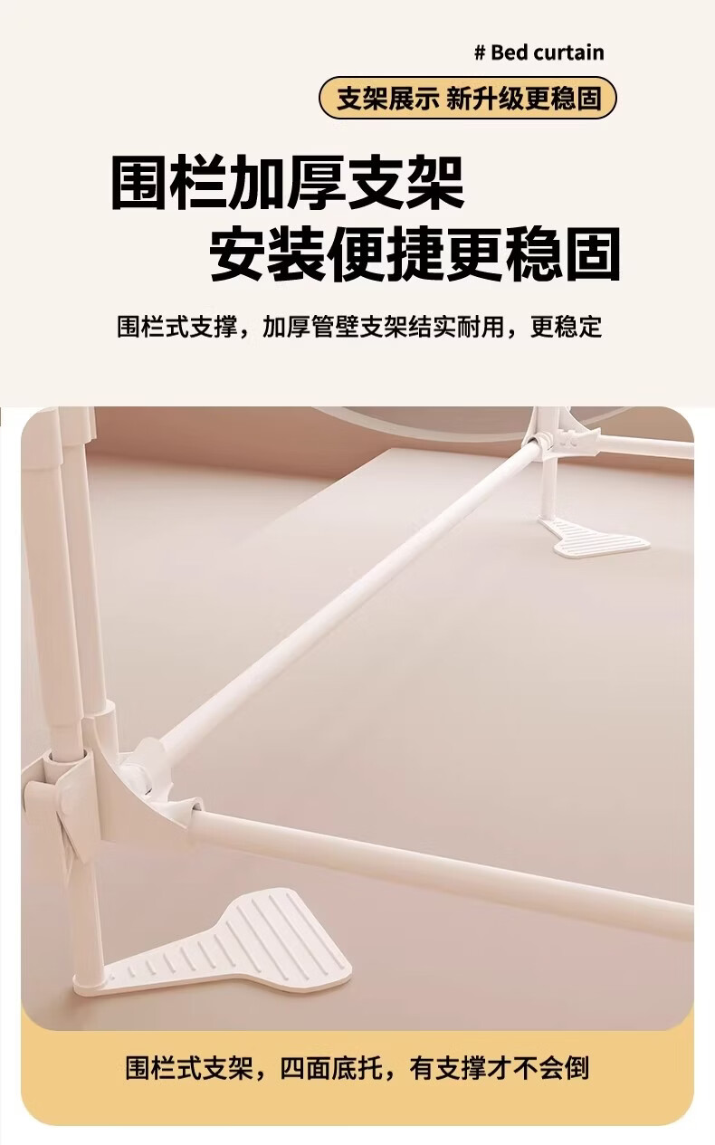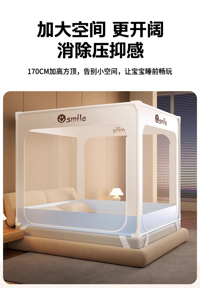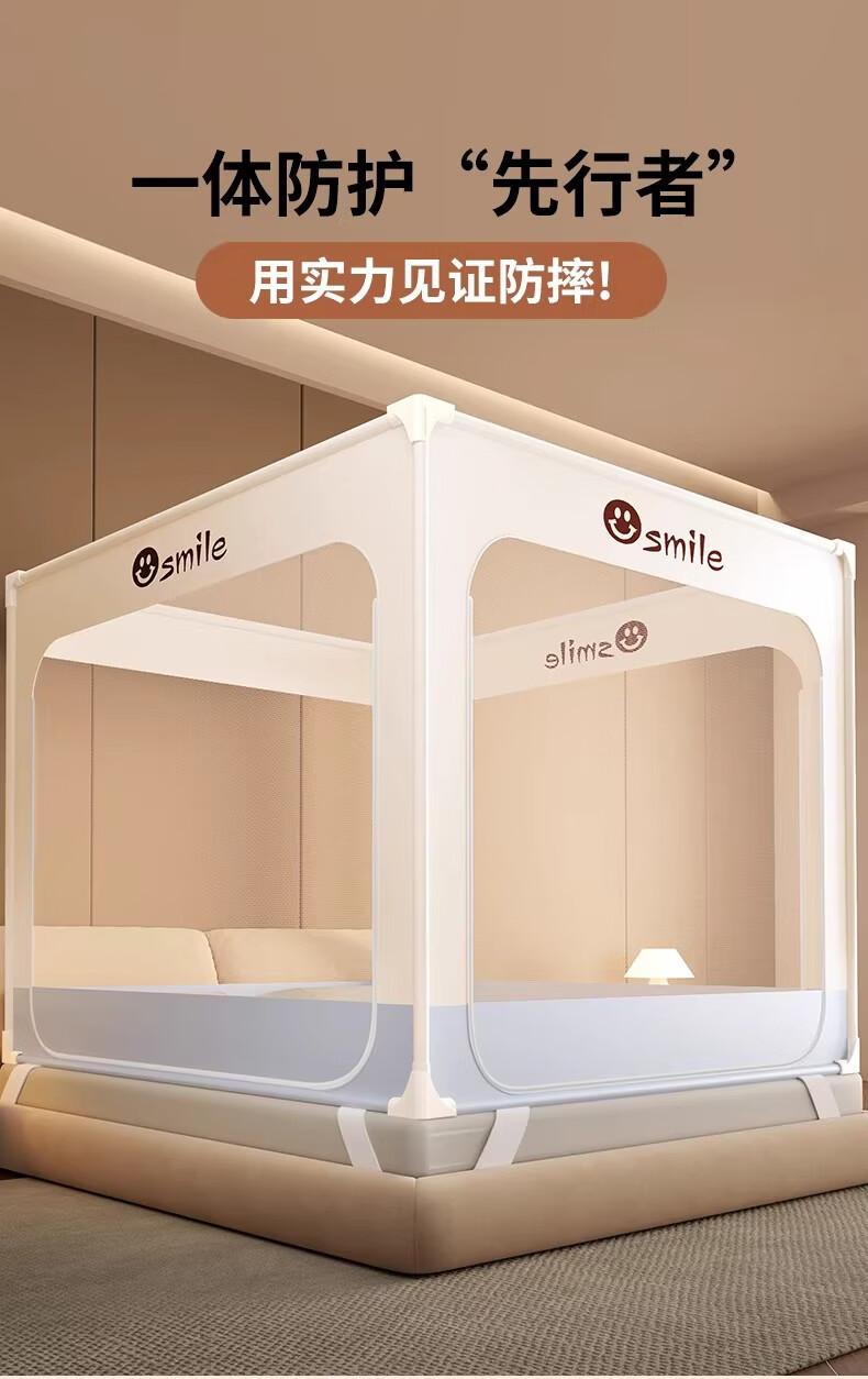 无印良品防摔蚊帐1.8x2米家用一体式免安装床围栏全底三开门蚊帐防摔婴儿 星辰-粉色【升级防摔 全钢脚架固定】 150cm*200cm*170cm 自连接支架