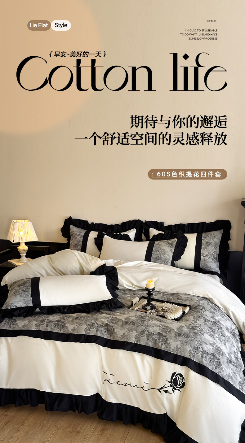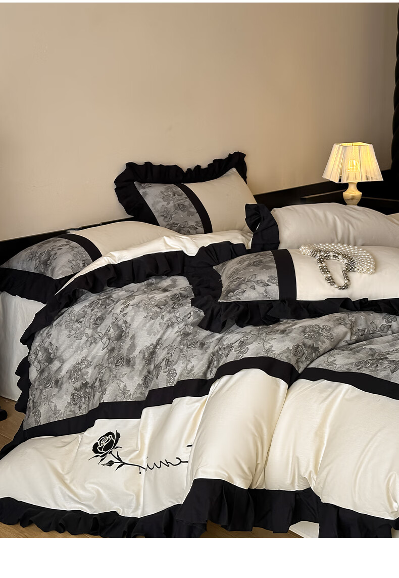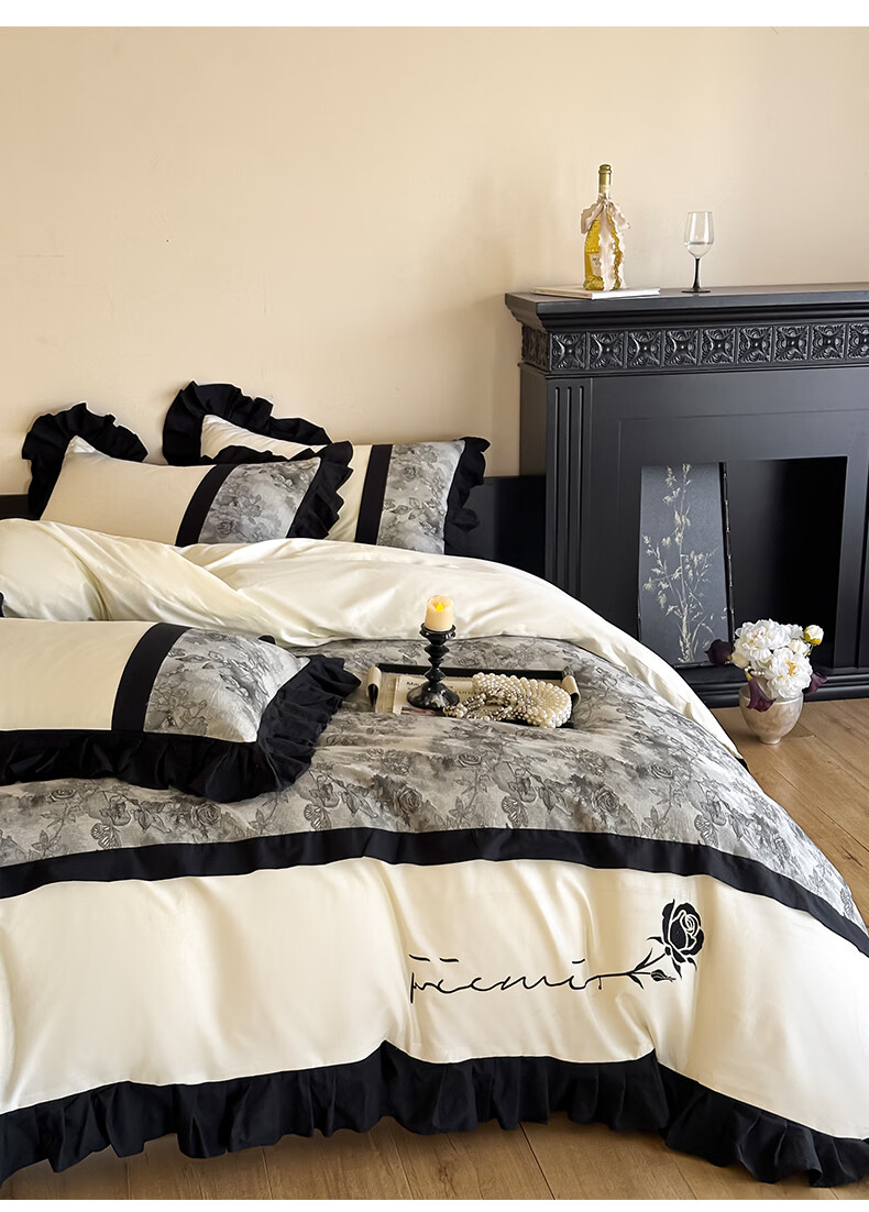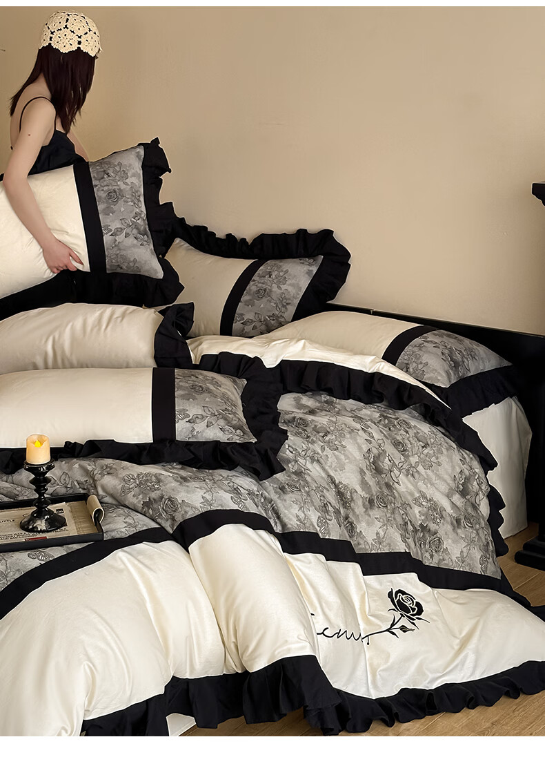 无印良品法式60支全棉床上用品四件套纯棉高端轻奢高级感床单被套罩床笠款 玫瑰絮语-白灰【全棉面料/法式轻奢】 2.0m 床单款 四件套-被套220x240cm