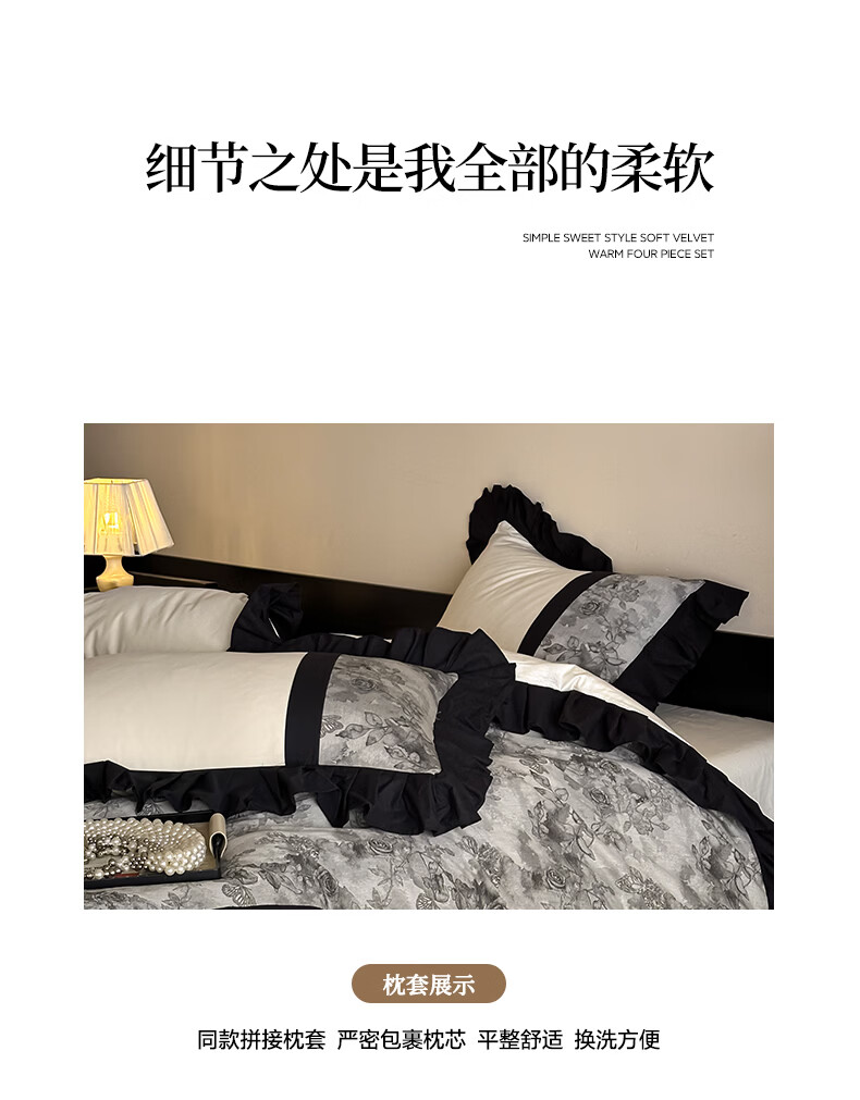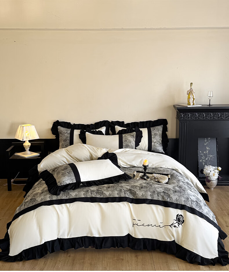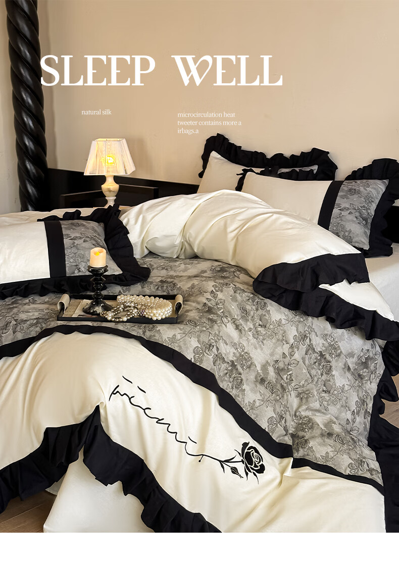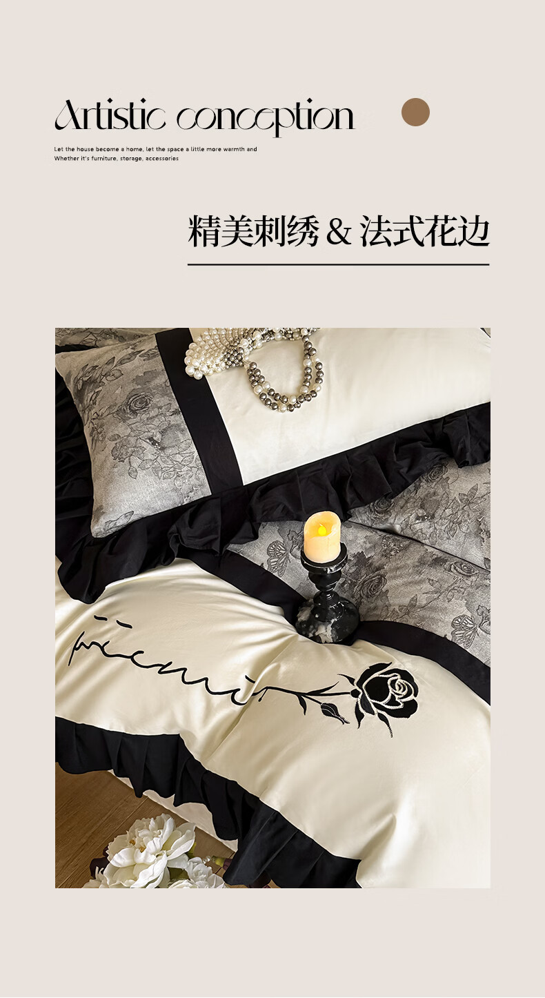 无印良品法式60支全棉床上用品四件套纯棉高端轻奢高级感床单被套罩床笠款 玫瑰絮语-白灰【全棉面料/法式轻奢】 2.0m 床单款 四件套-被套220x240cm