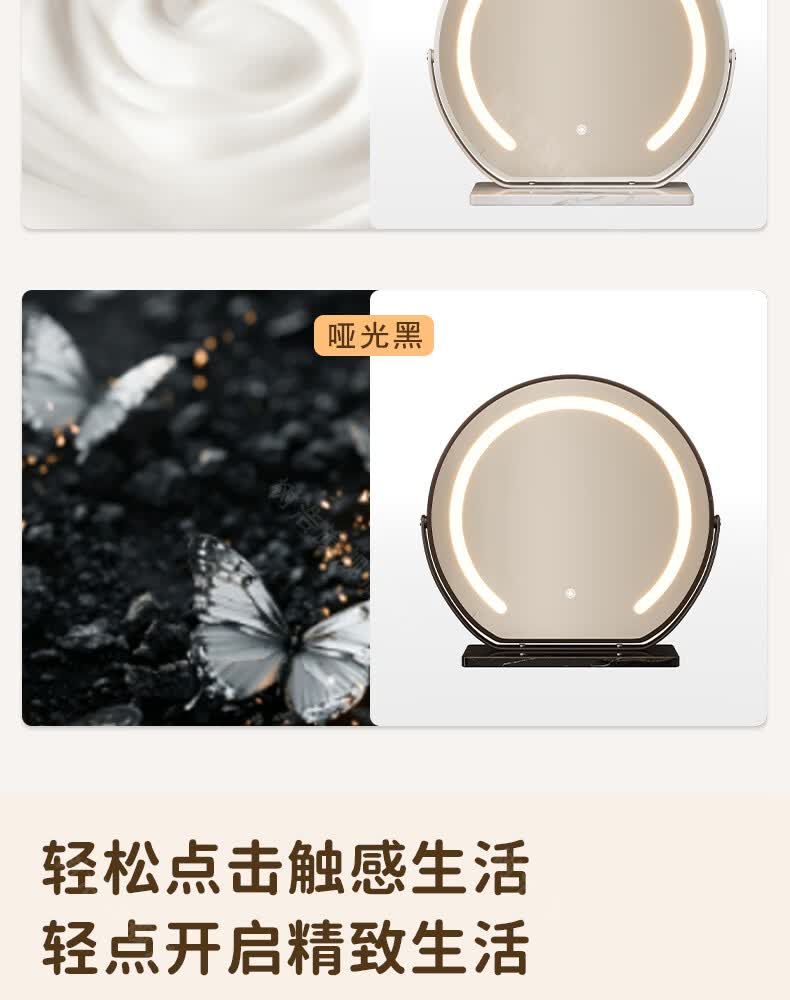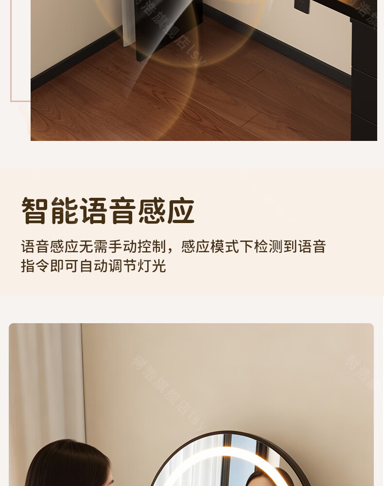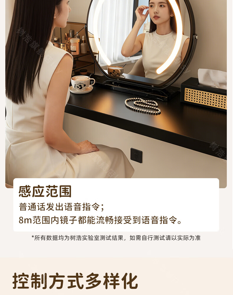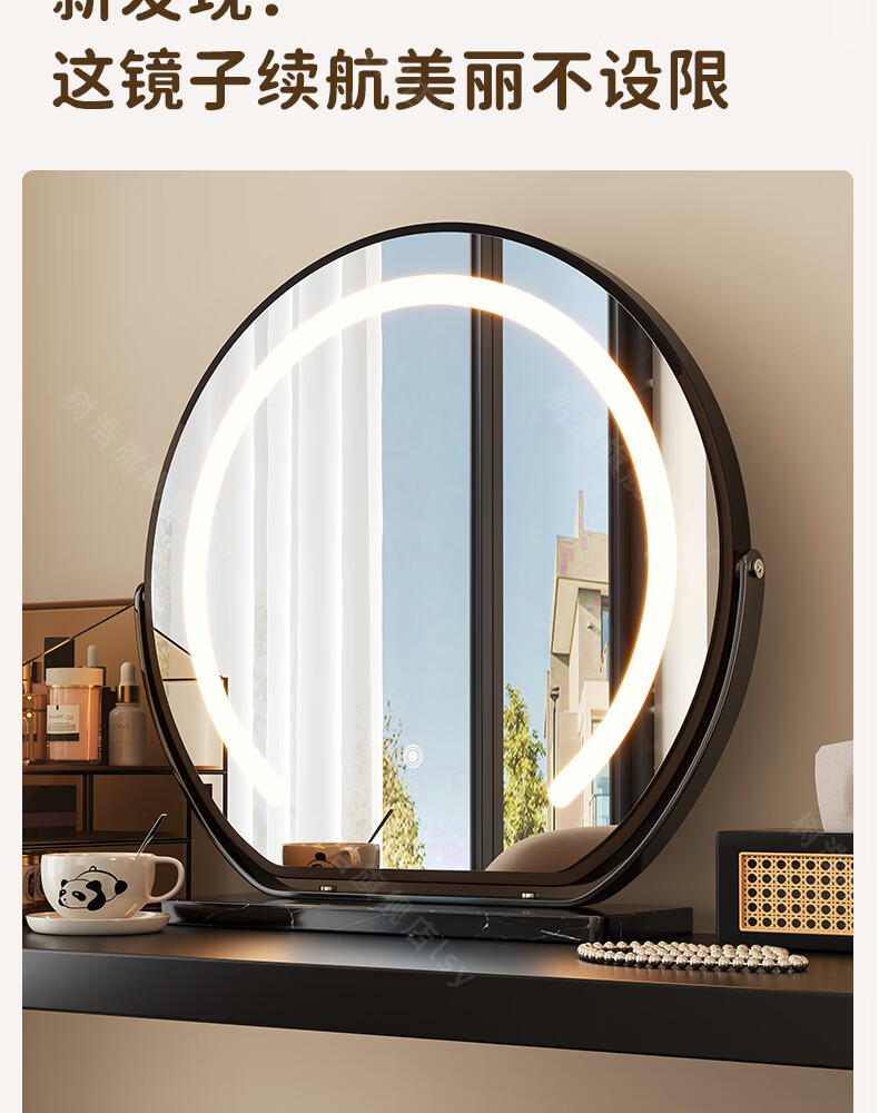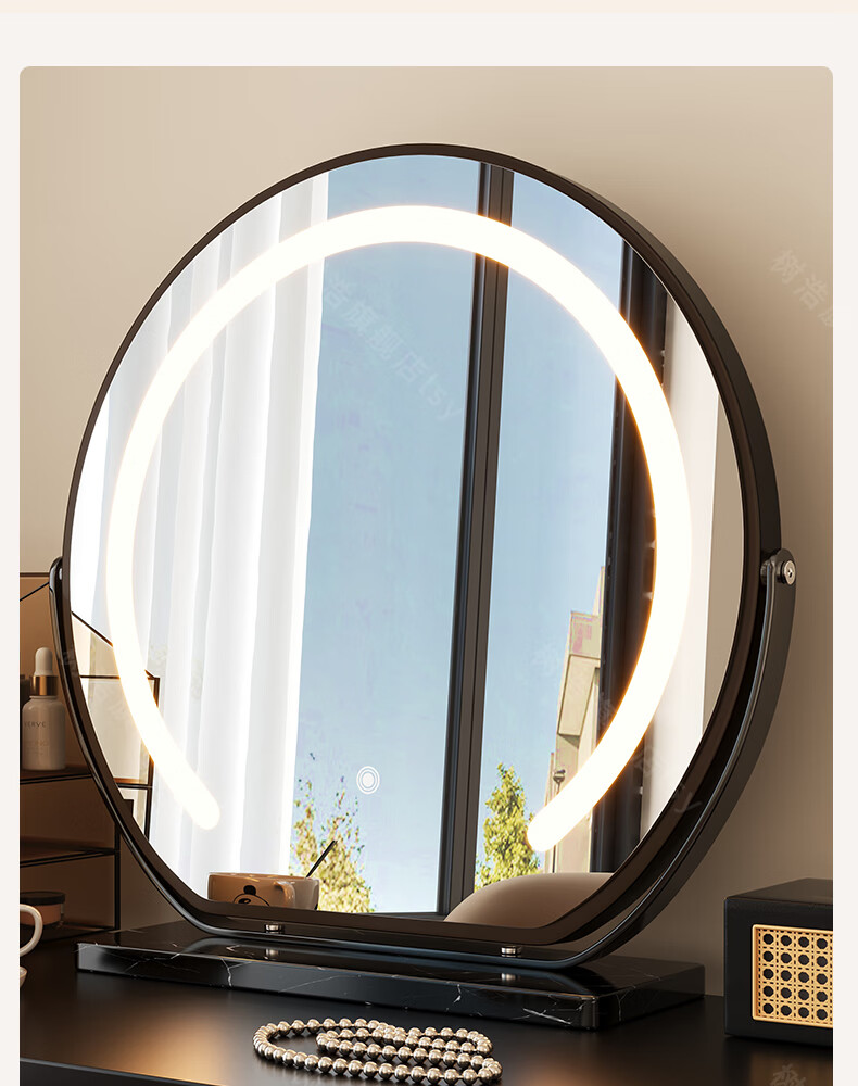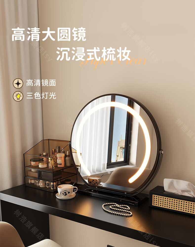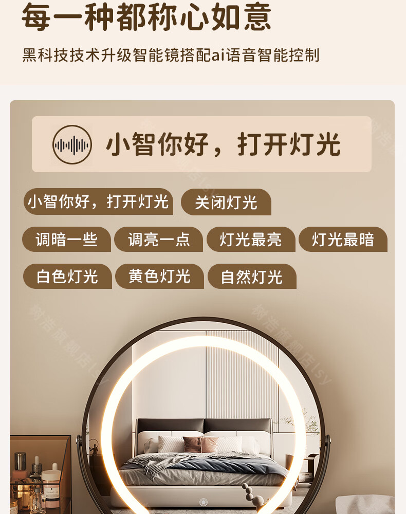 树浩智能语音镜梳妆台led化妆镜台式ai美妆镜卧室桌面可旋转补光镜子 带灯-奶油白【固定插电款】高清成像