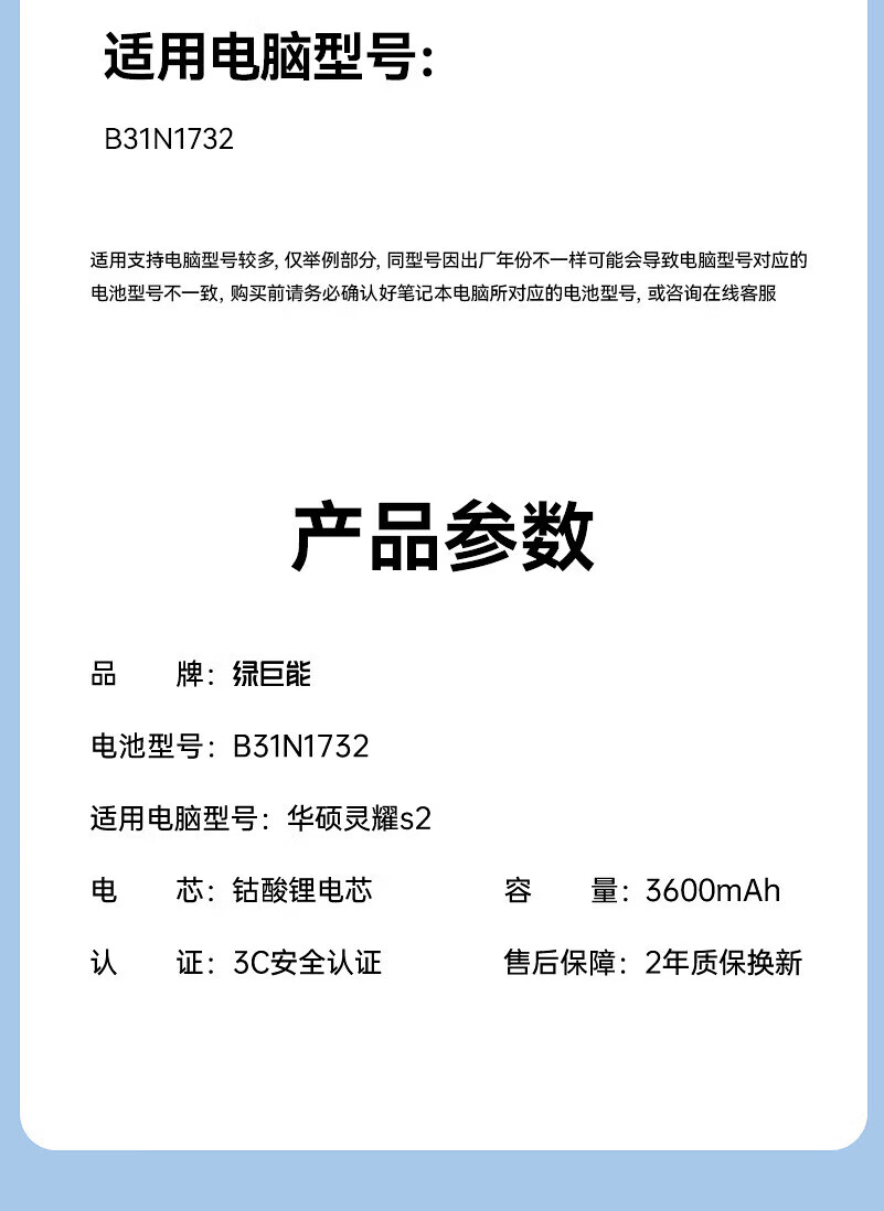 绿巨能(llano)华硕笔记本灵耀S 2代 Mars15 S4300F/FN S4300U/UN VX60G/GT B31N1732电脑电池 B31N1732 内置电池