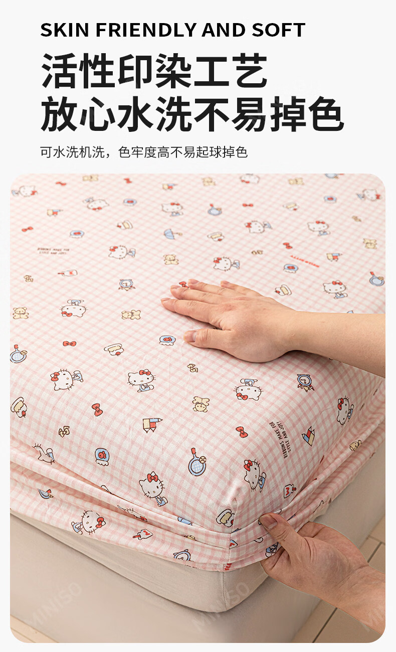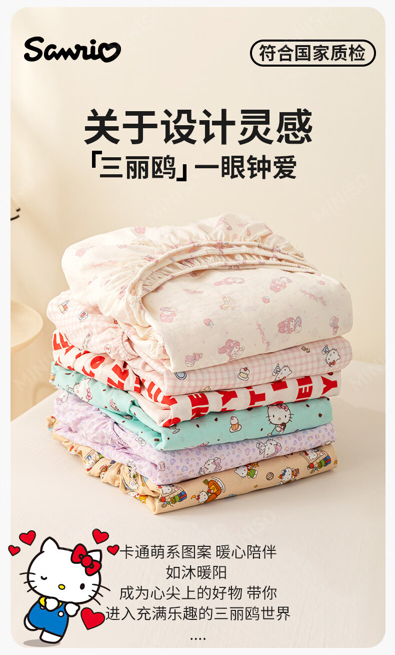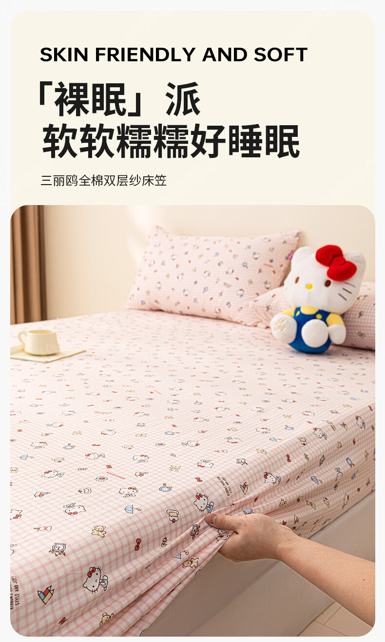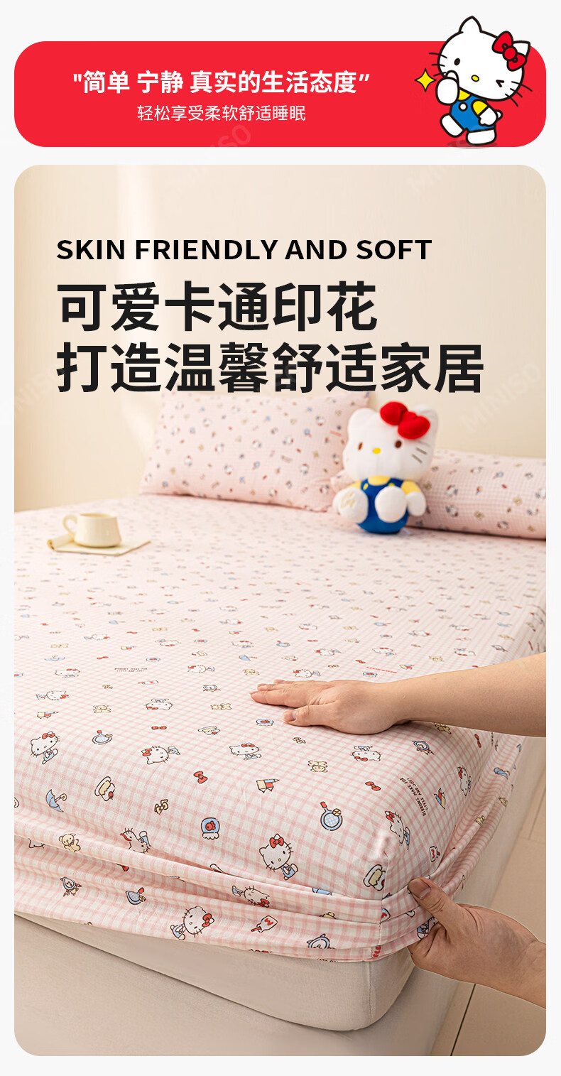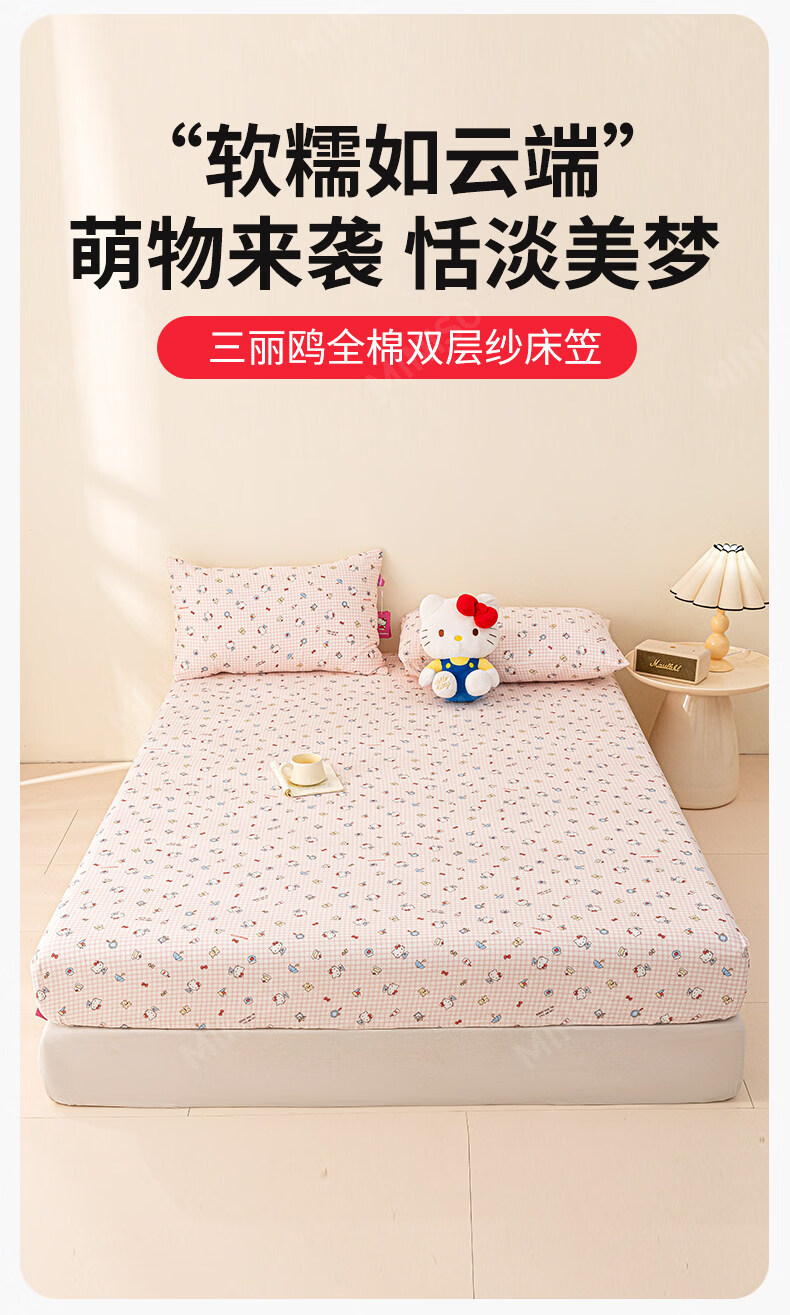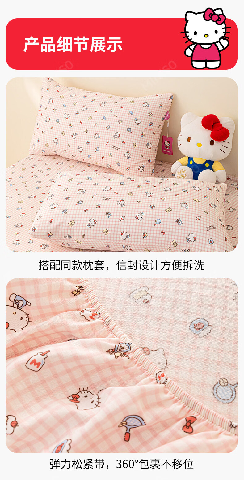 名创优品(MINISO)HelloKitty纯棉双层纱床笠1.8米x2米 儿童全棉床罩床垫保护套 KT酱【HelloKitty正版授权舒适透气】 150cm*200cm 单床笠