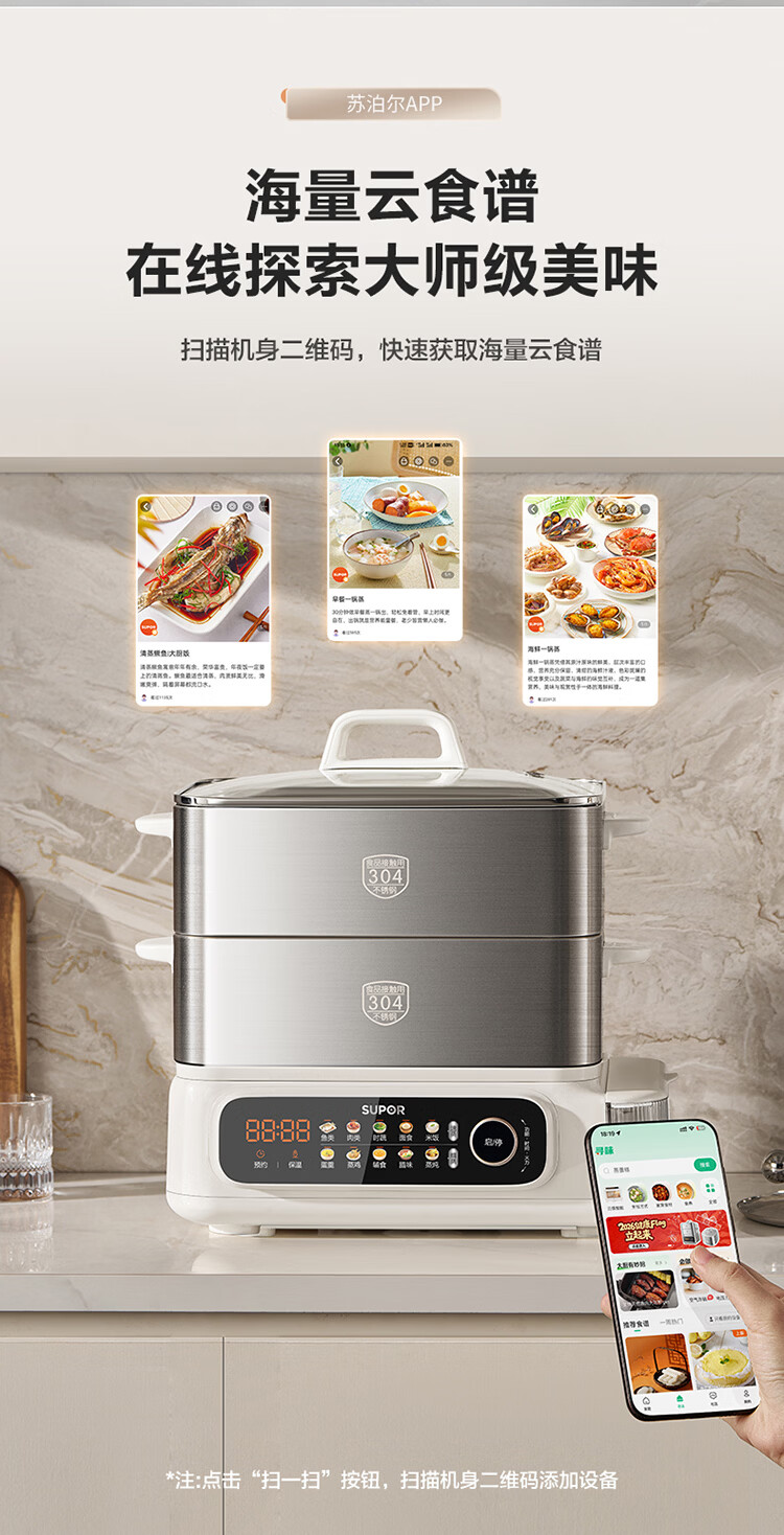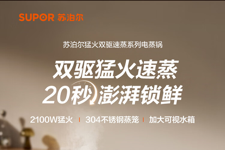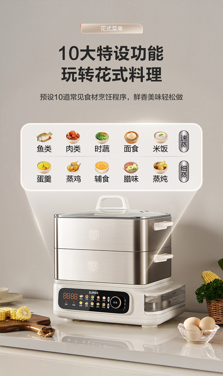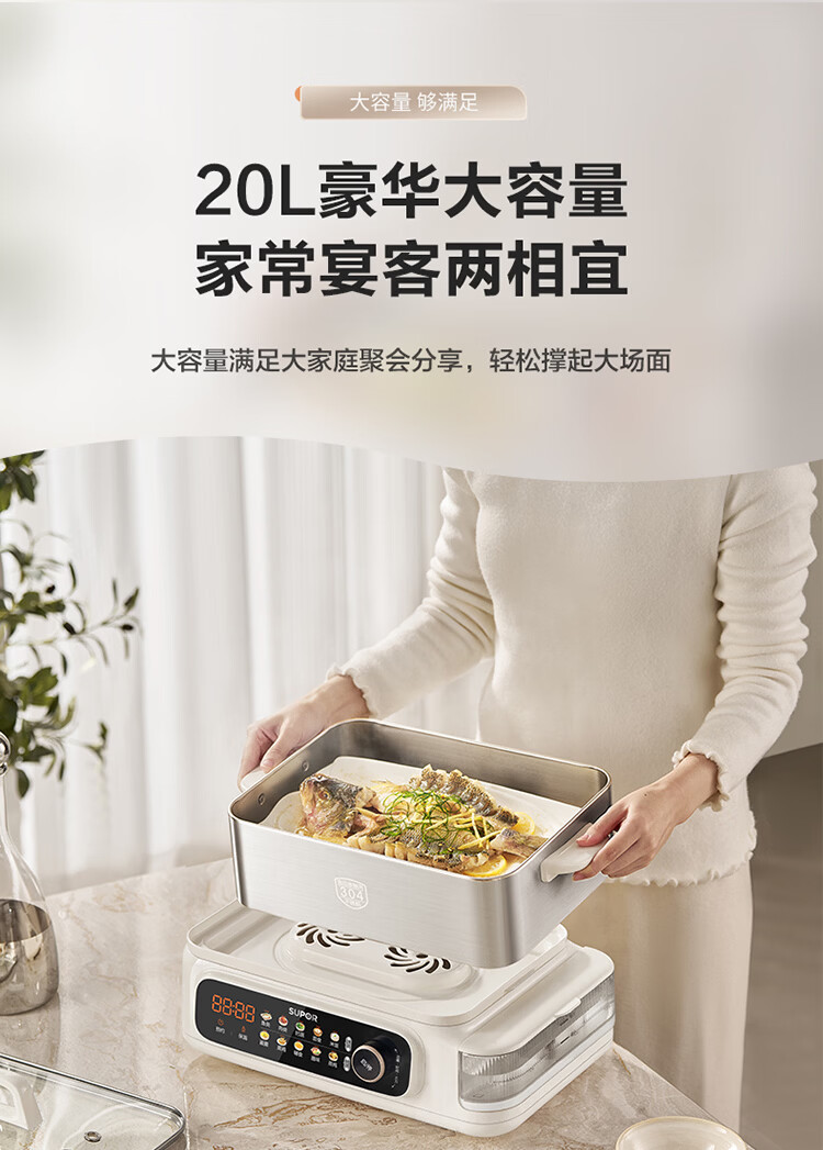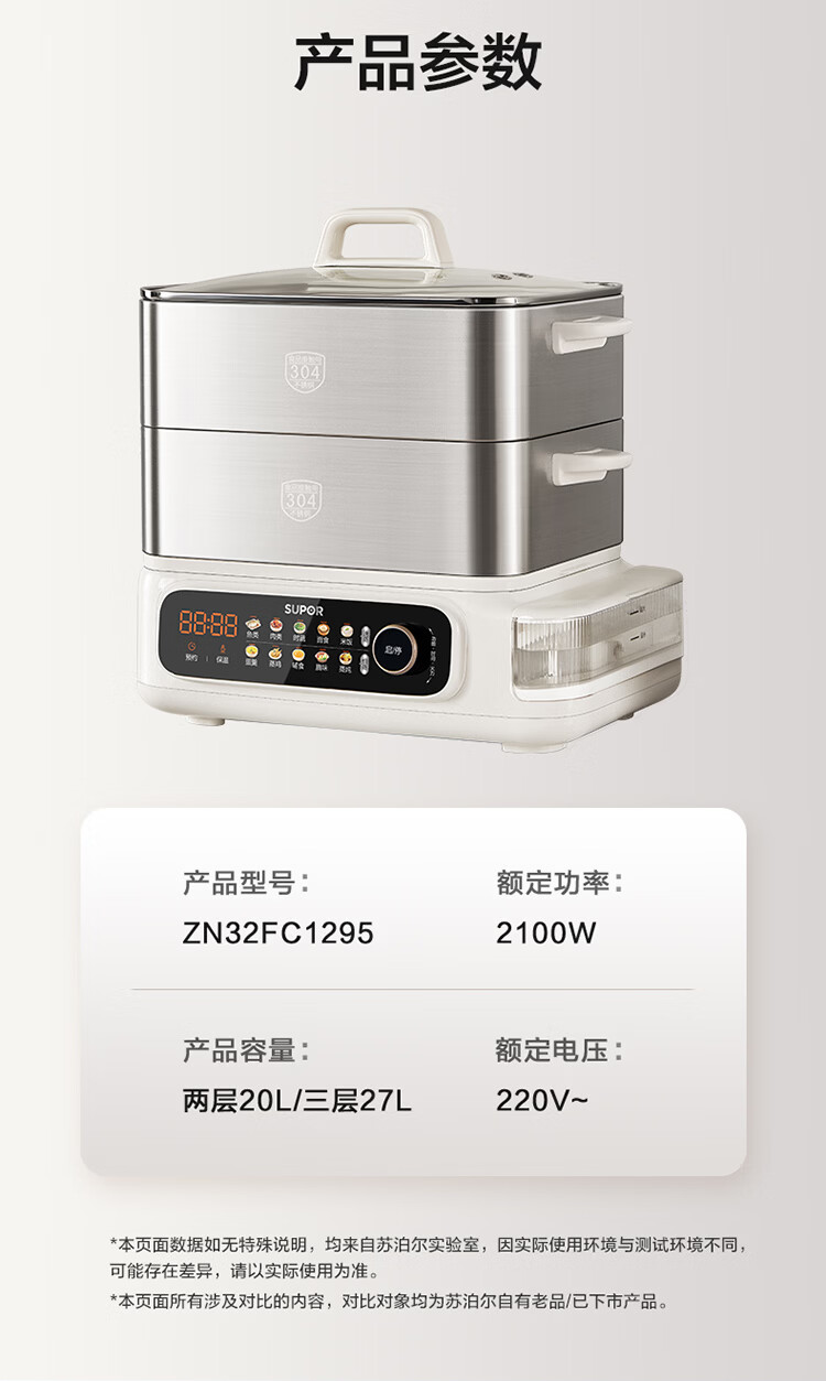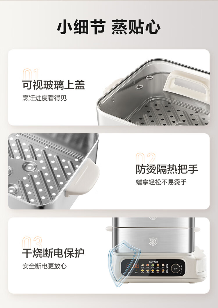苏泊尔(SUPOR)蒸蒸宝电蒸锅不锈钢0涂层蒸锅多功能电蒸箱2100W双驱猛火澎湃速蒸蒸鱼蒸屉大容量蒸笼 ZN32FC1295