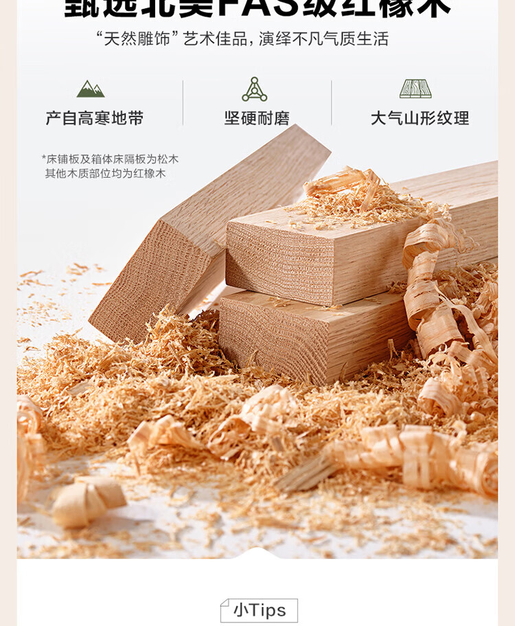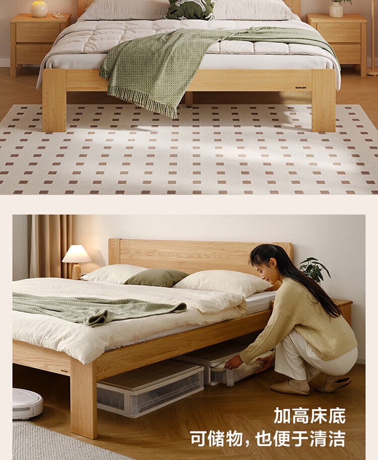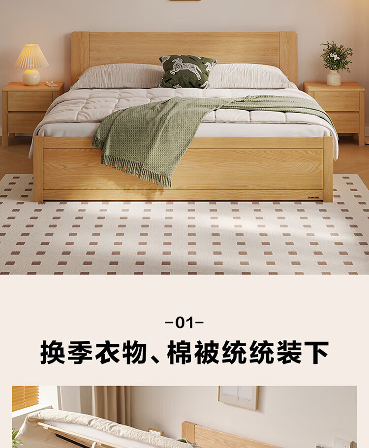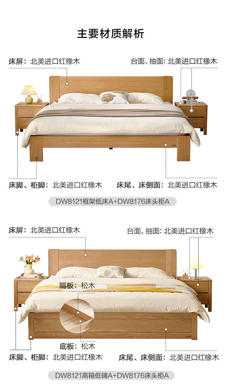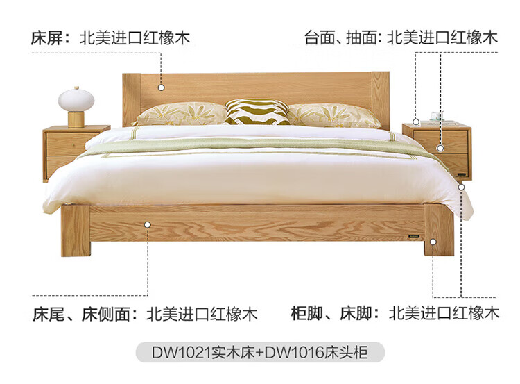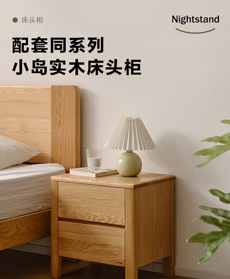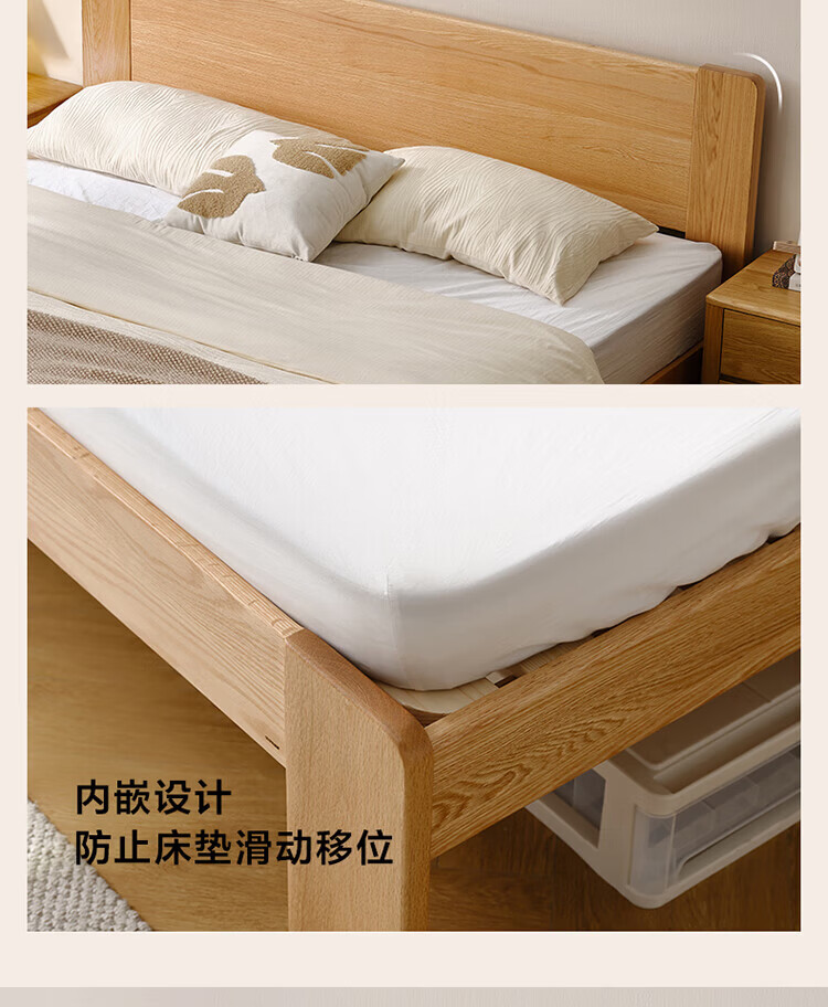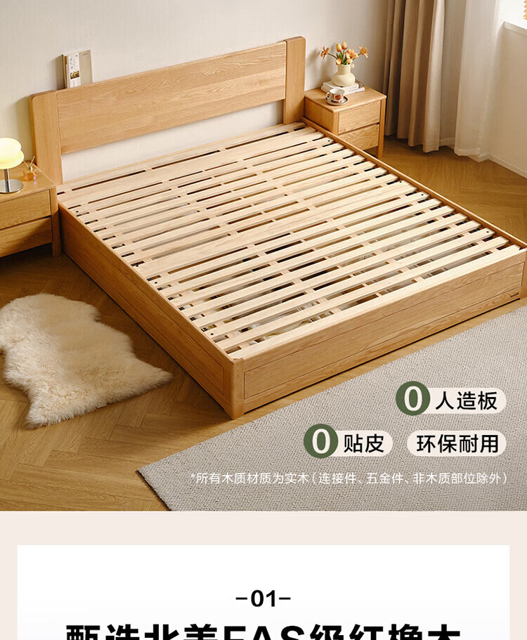 全友家居北欧原木风多功能储物床主卧室1.5米2米橡木全实木双人大床 红橡木|小岛床头柜 1.5米