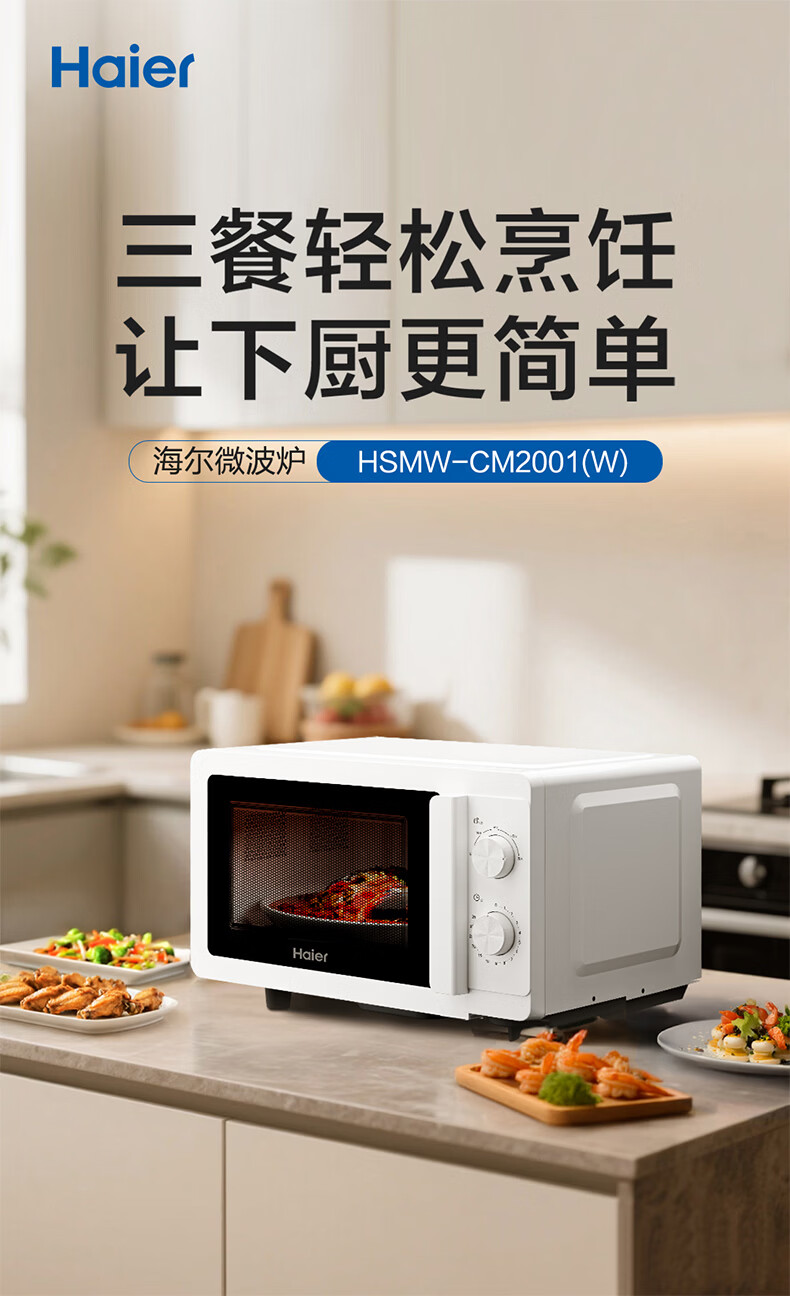 海尔微波炉20L家用平板加热旋钮操控微波速热一键解冻多功能电烤箱HSMW-CM2001(W) 平板加热700W大功率