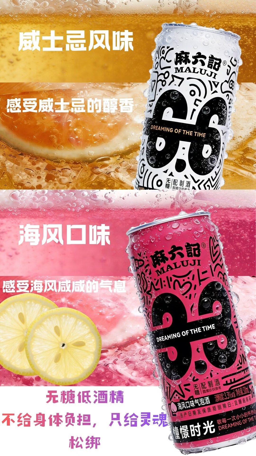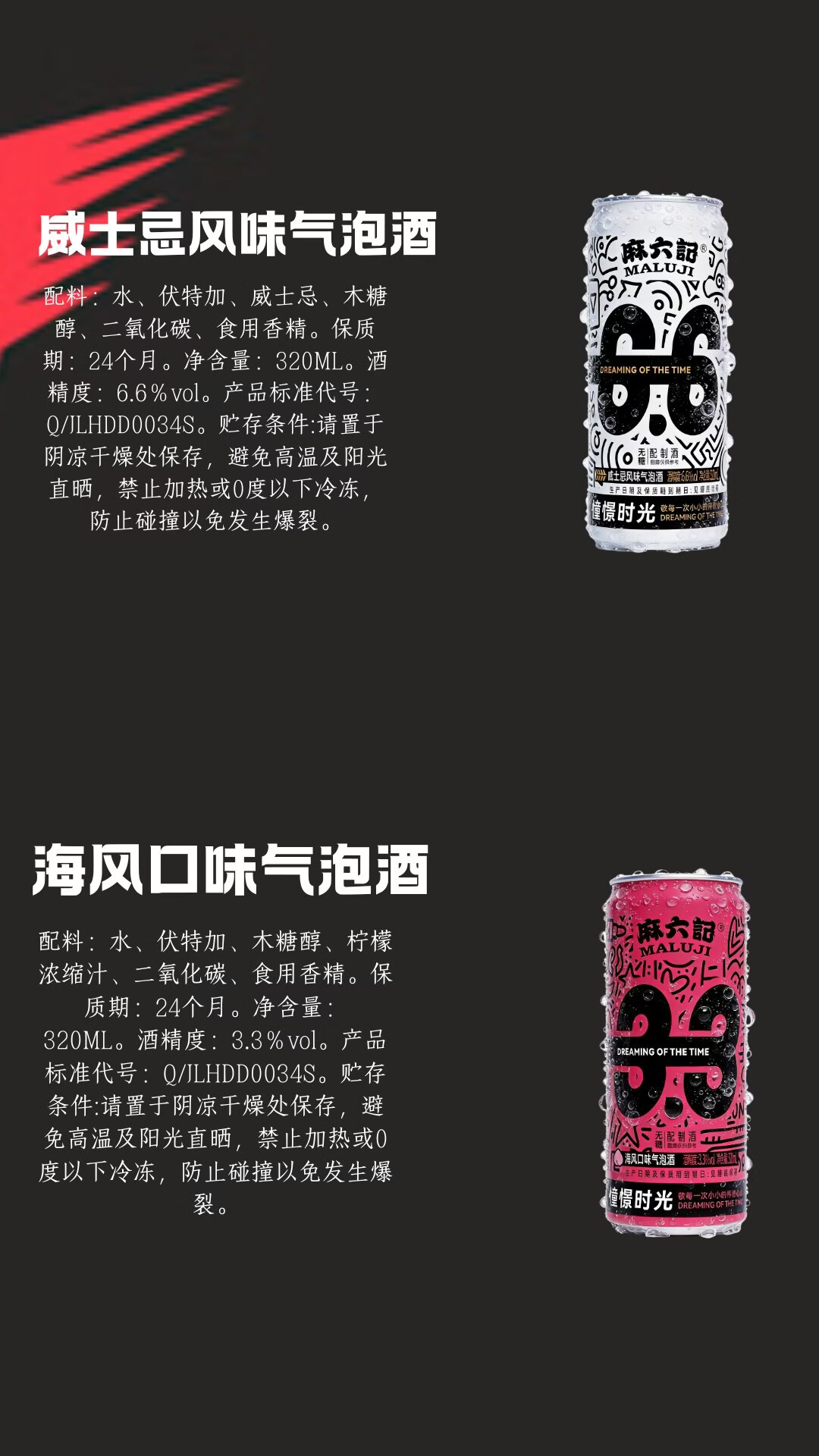 麻六记威士忌风味气泡酒甜酒饮料起泡酒6.6度无糖320ml微醺聚会必备解辣 6瓶装