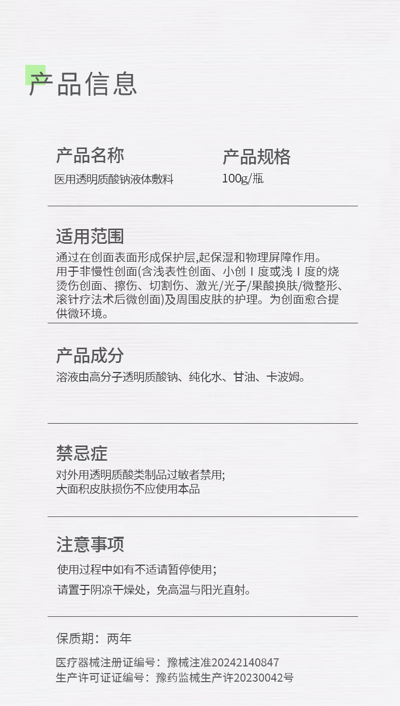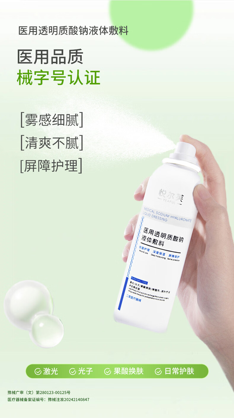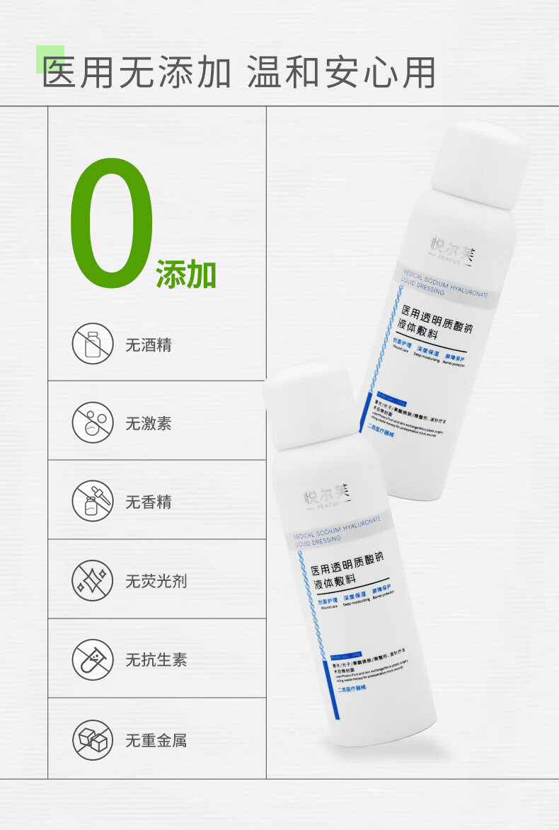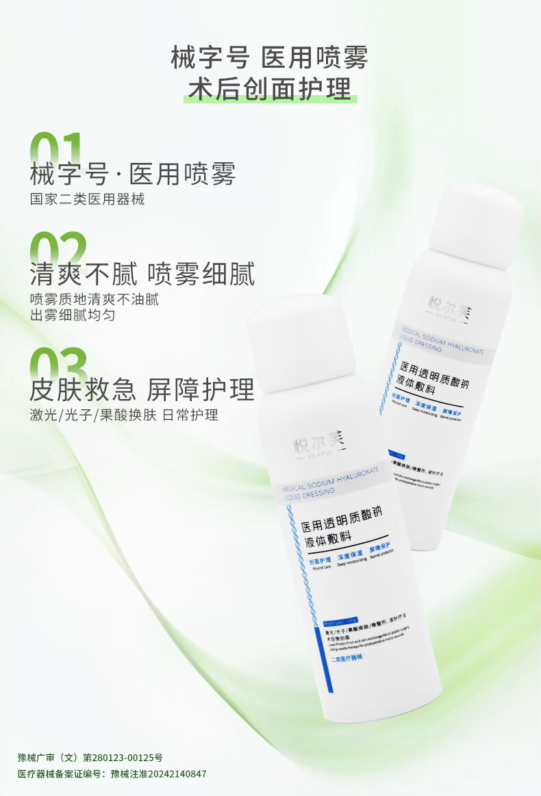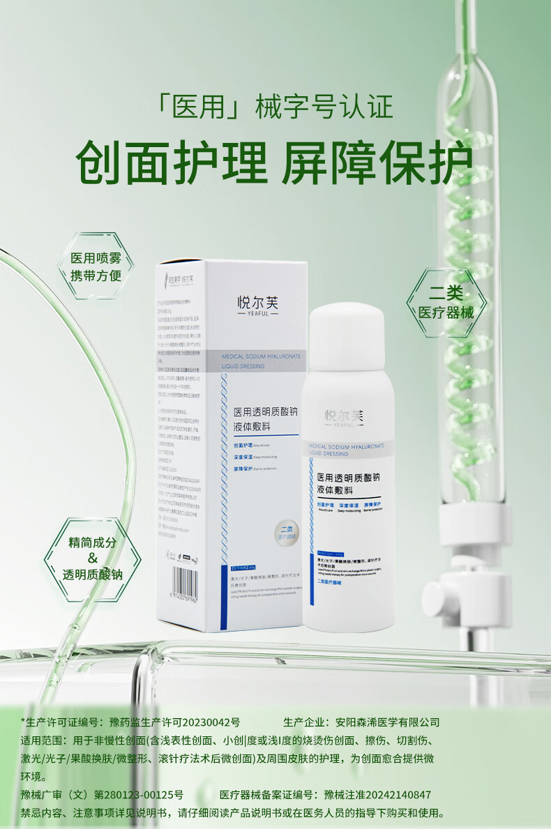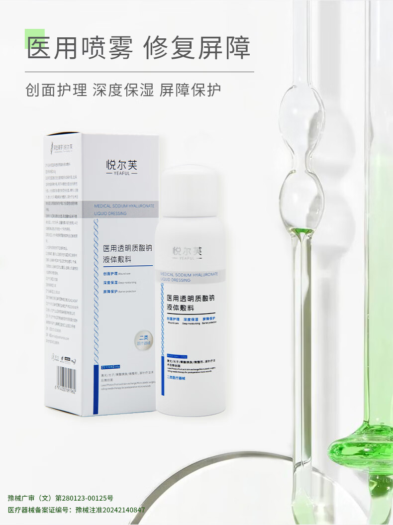 悦尔芙医用透明质酸钠喷雾创面护理激光术后修复械字号夏季出行补水喷雾 二类械字号喷雾2瓶