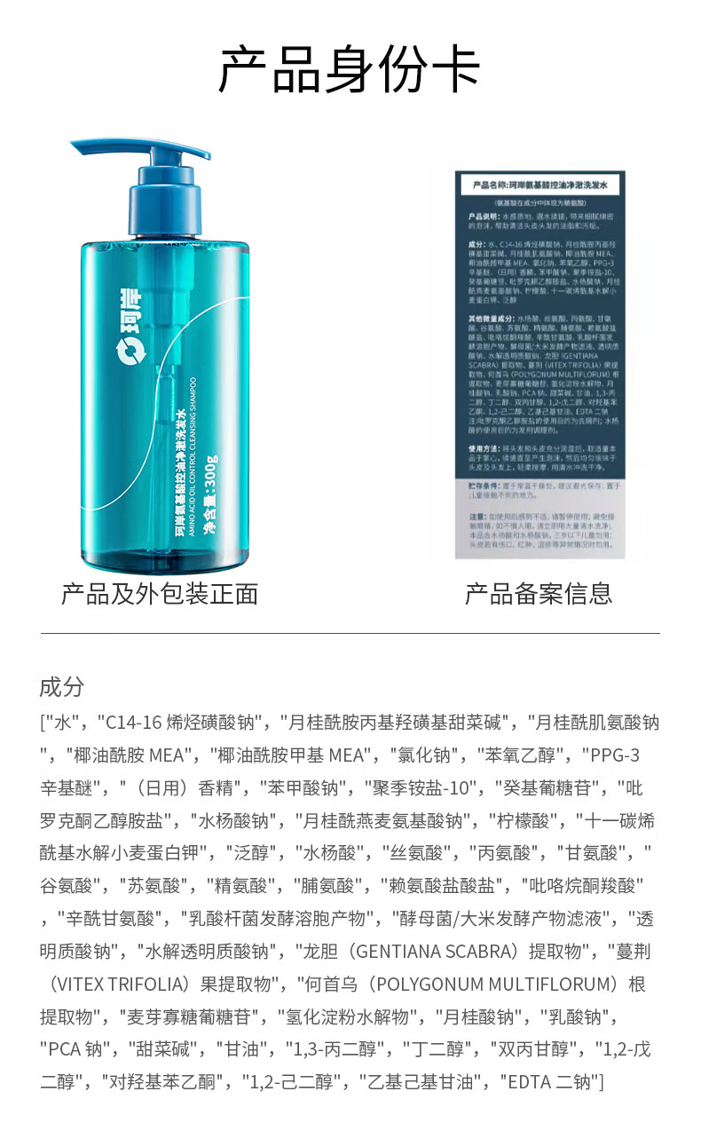 珂岸 华熙生物氨基酸控油去屑洗发水男士洗发露清爽无硅油滋润保湿 洗发水300g