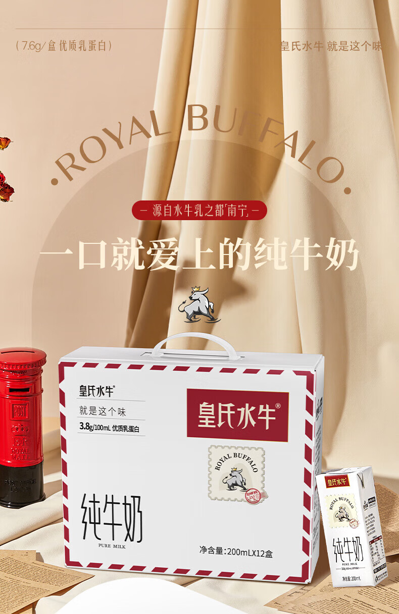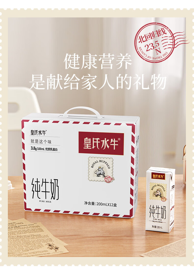 皇氏乳业纯牛奶200ml*12盒 3.8蛋白水牛奶配方 儿童早餐奶整箱送礼礼盒装 200ml*12盒*1箱