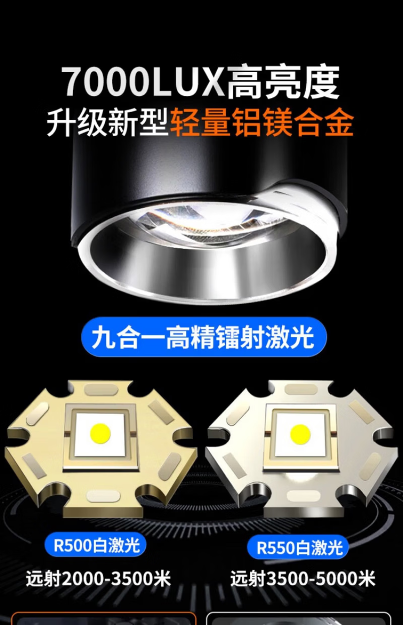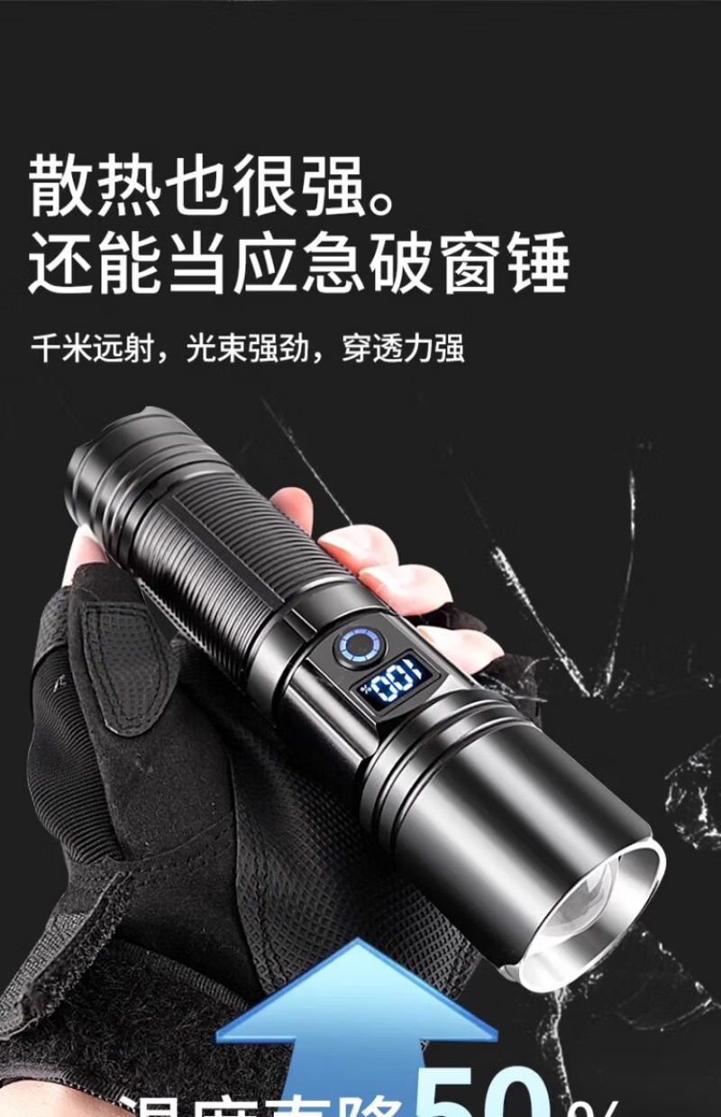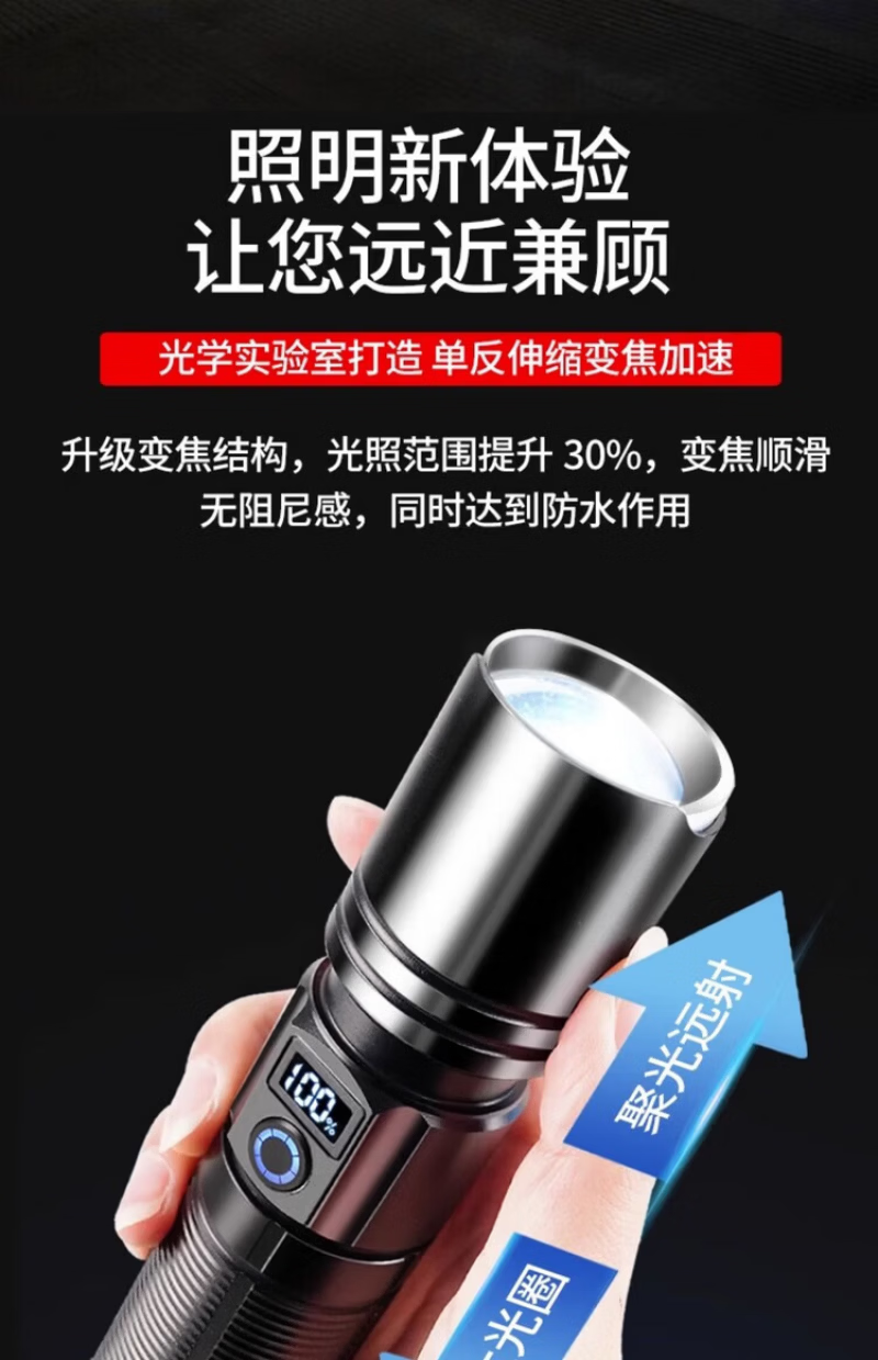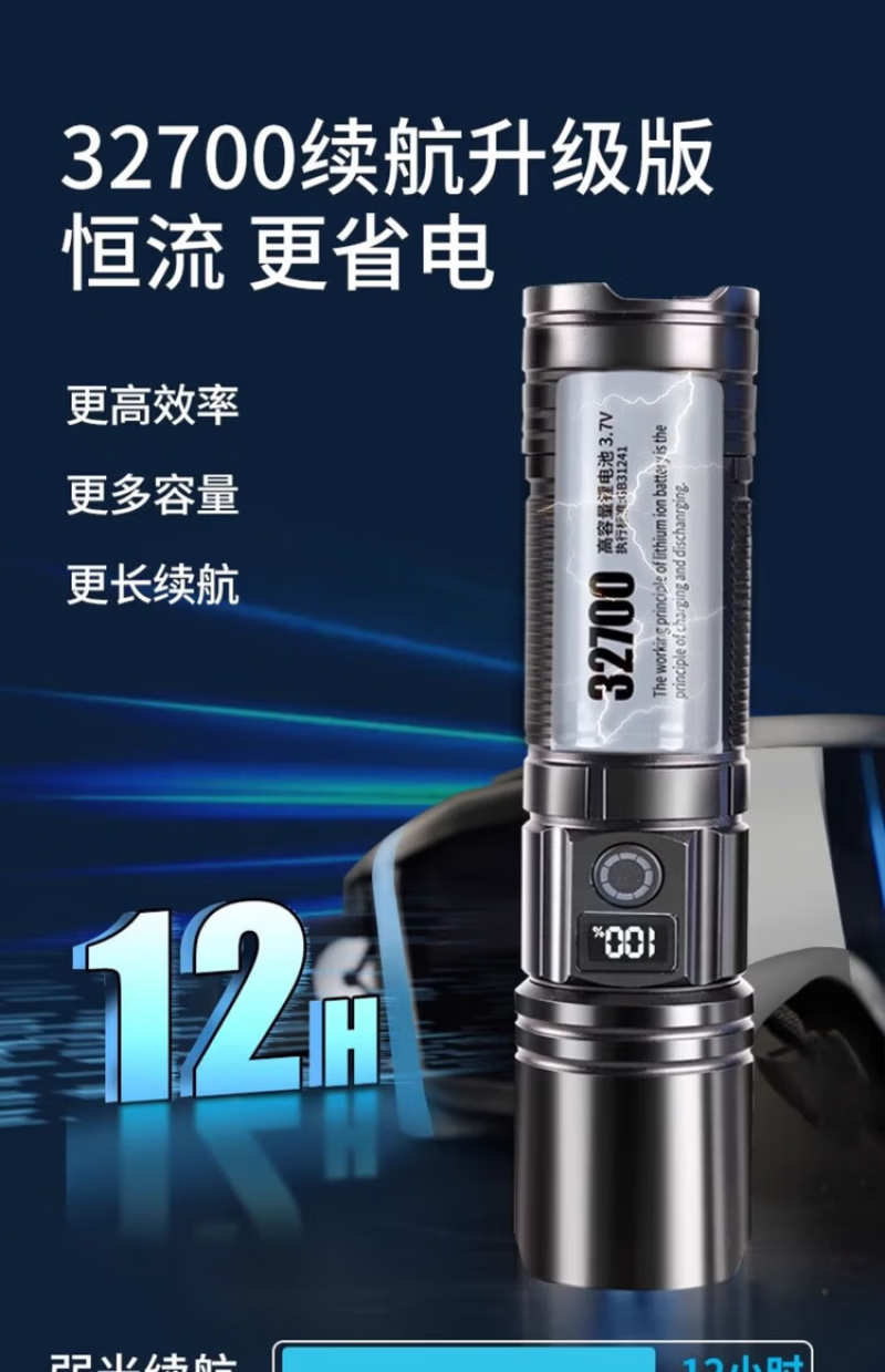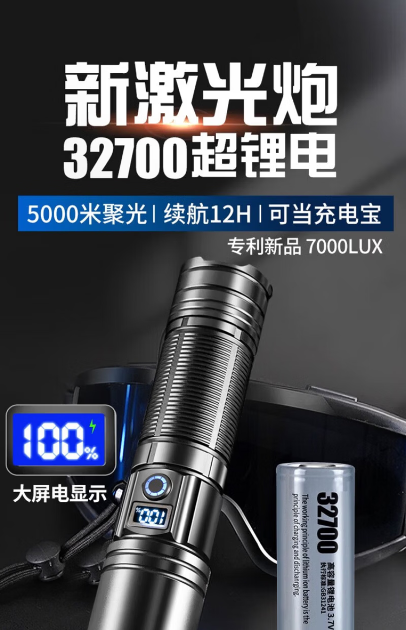 Lovefamily【德国】强光手电筒强光超长续航变焦远射小型便携充电军户外专用 数显款-【激光灯芯】-32700双锂电