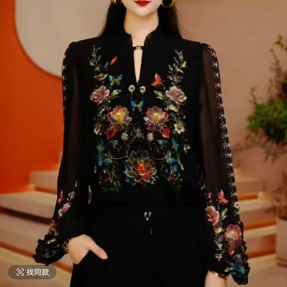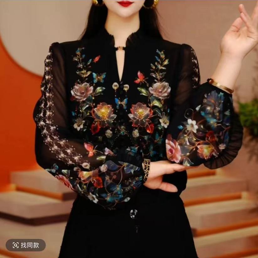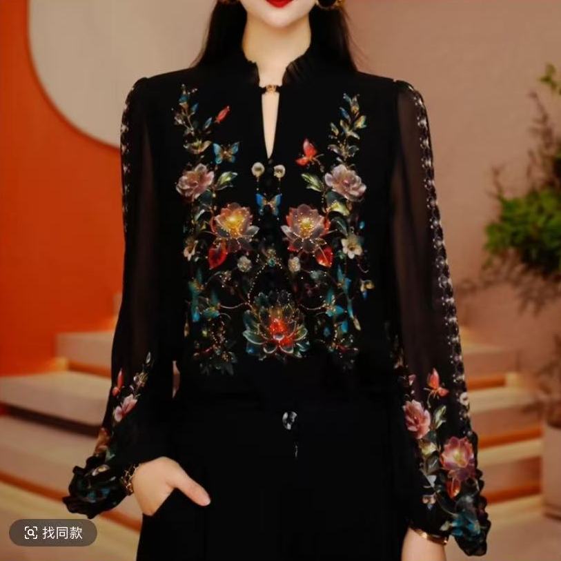 Y260105- 新款琉璃双皱丝洋气时尚百搭休闲气质女士印花小衫显瘦