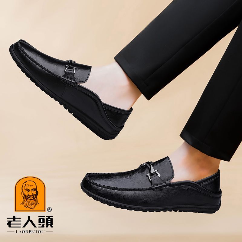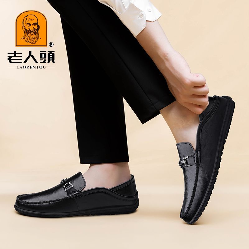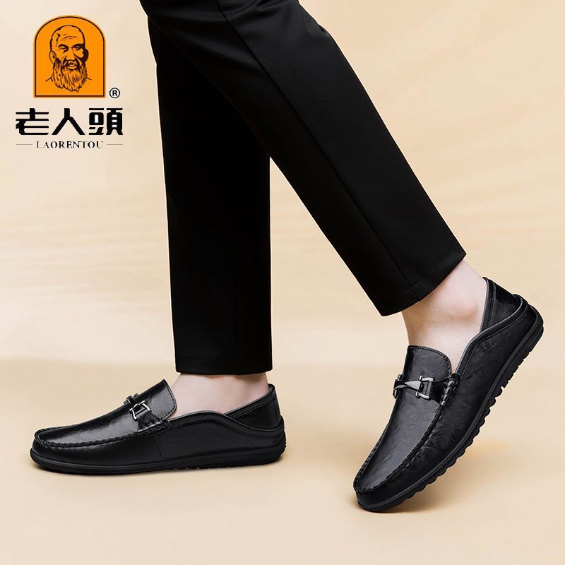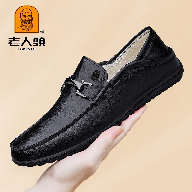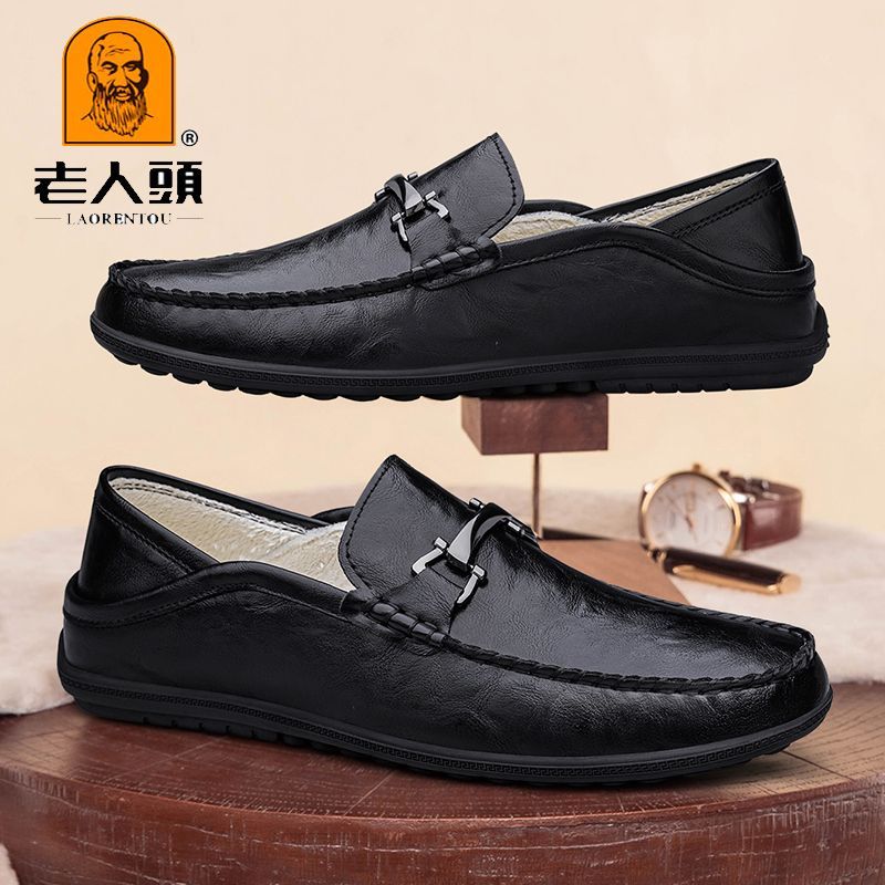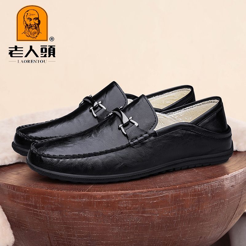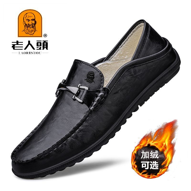 老人头正品男鞋新款冬季加绒豆豆真皮透气软底软皮休闲皮鞋爸爸鞋