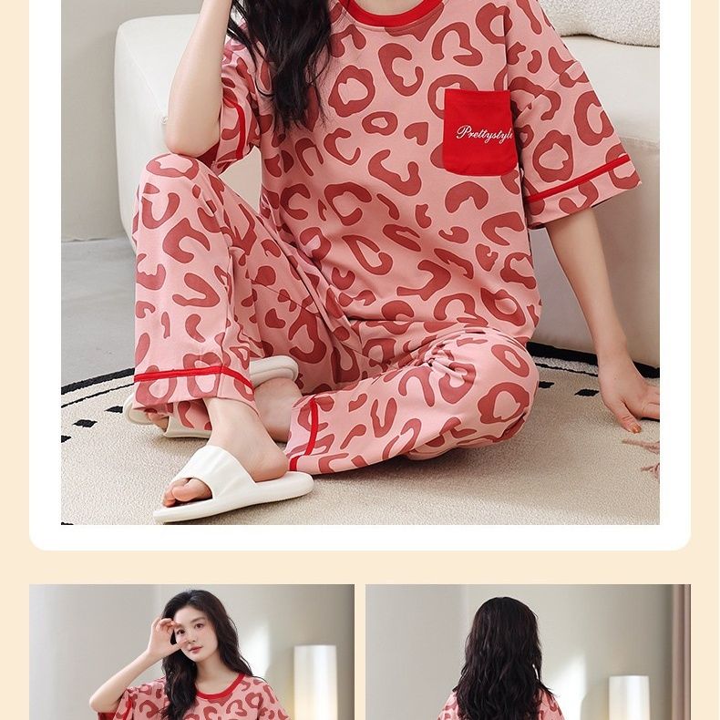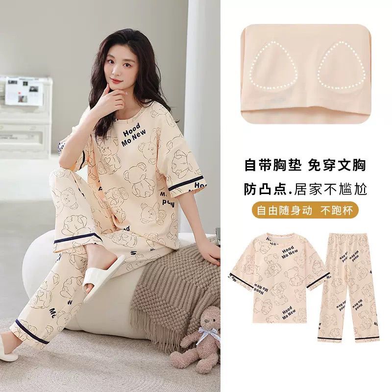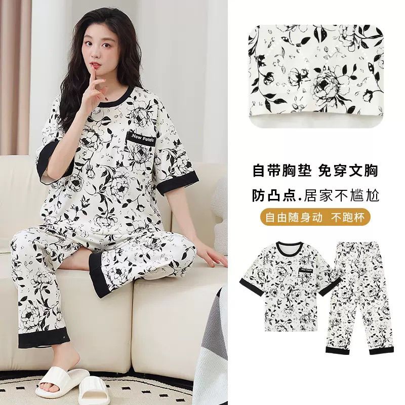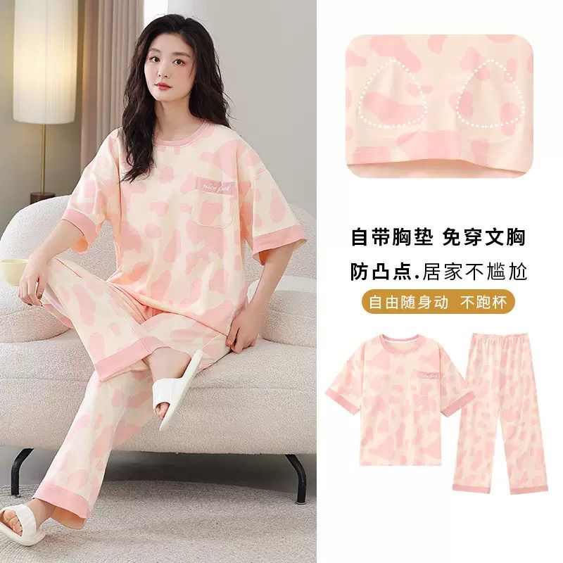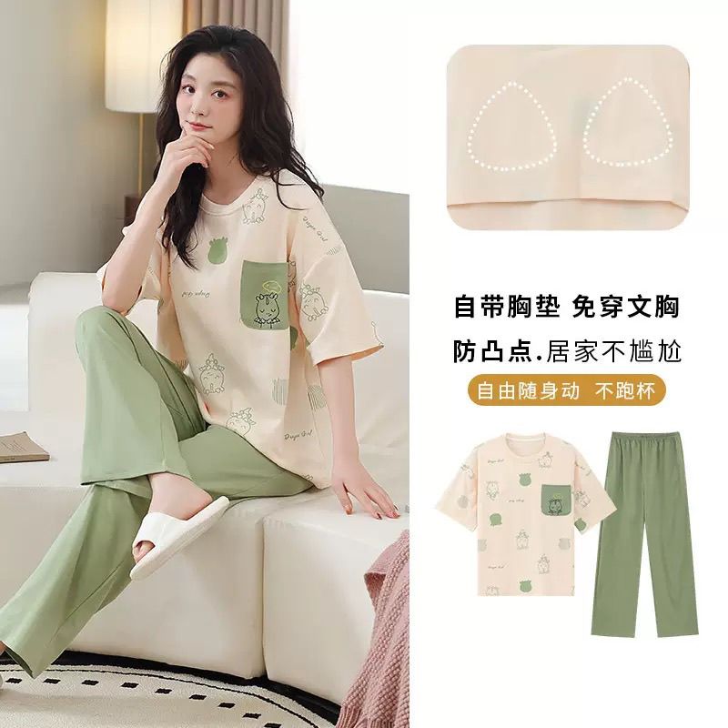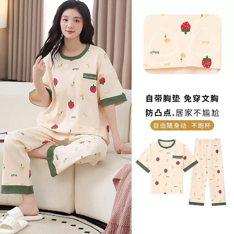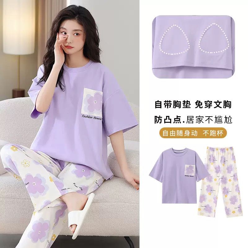 睡衣女带胸垫夏季优棉短袖长裤甜美全棉夏天薄款花卉家居服两件