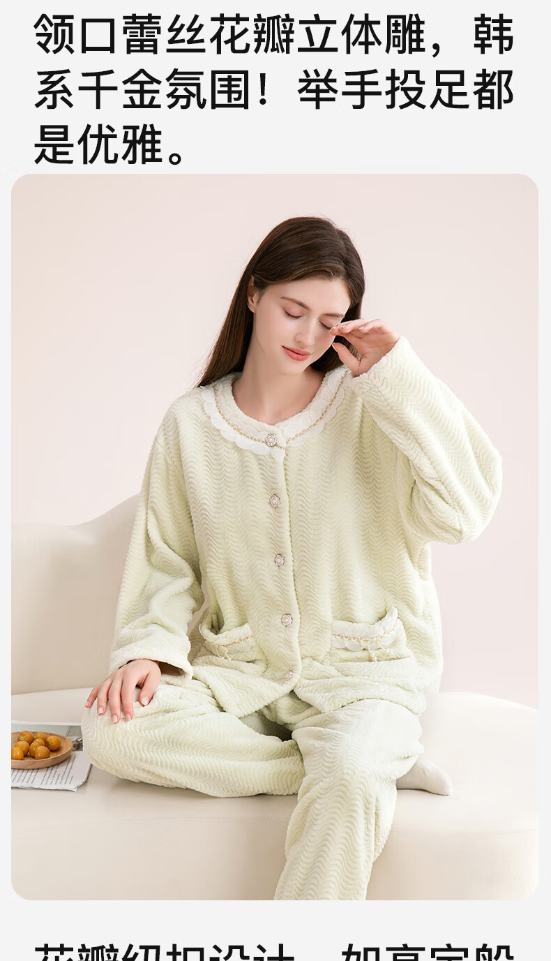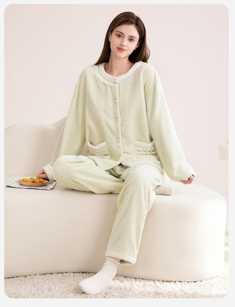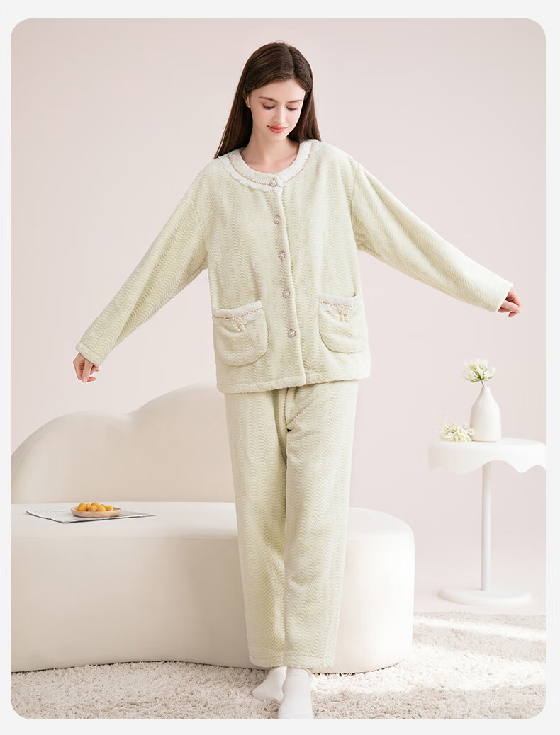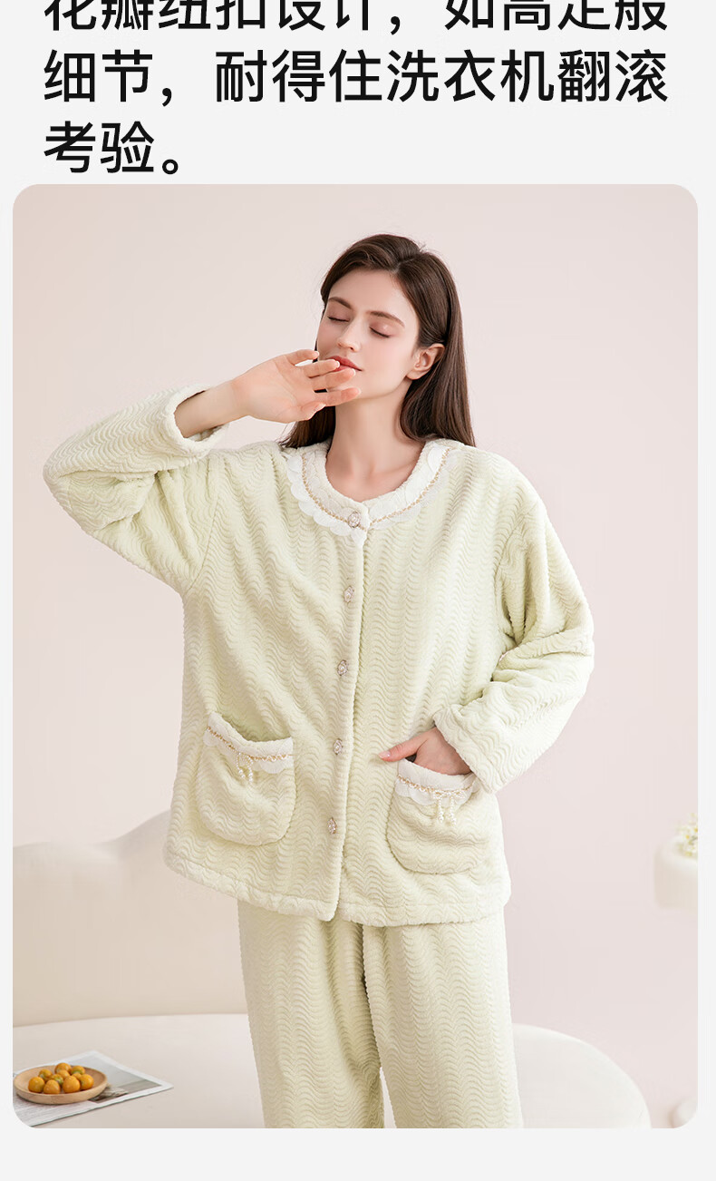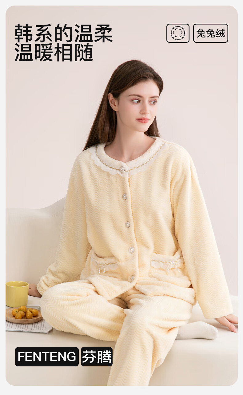 芬腾睡衣女2025秋冬新款双面暖绒韩系风开衫长袖ins家居服套装保暖 浅绿 L