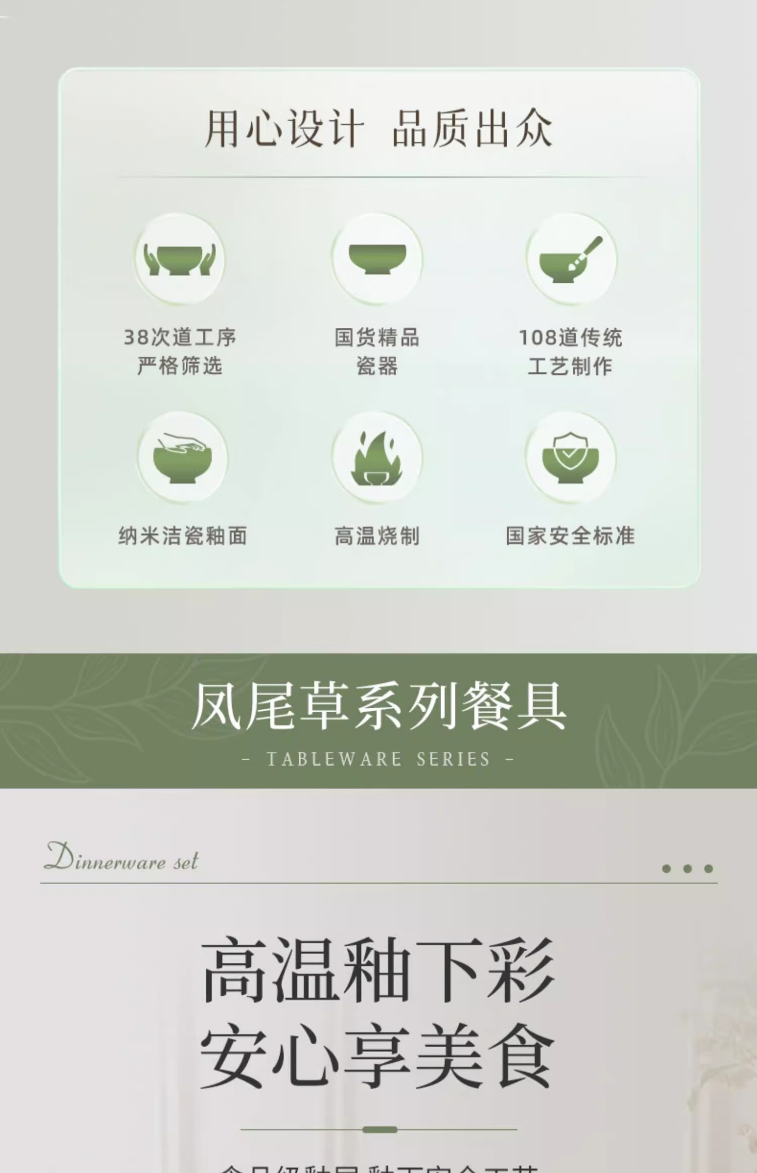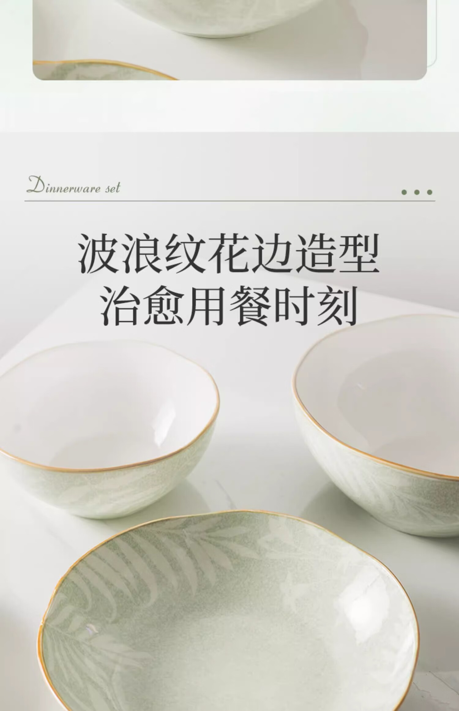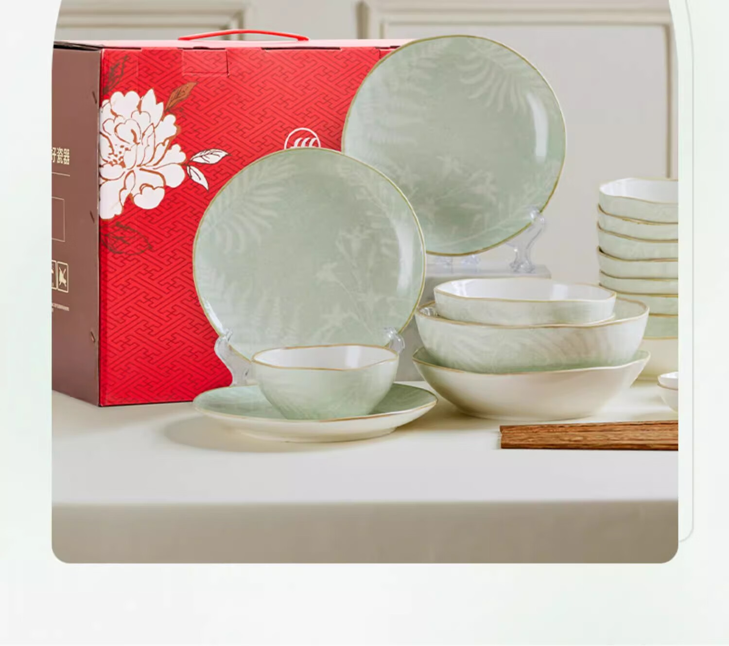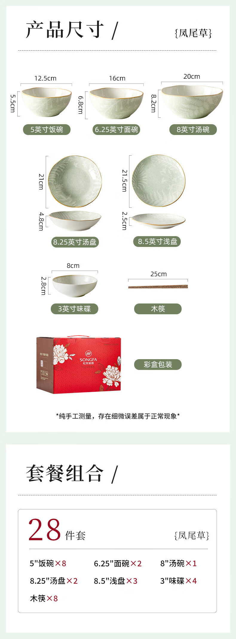 松发瓷器陶瓷餐具碗碟套装釉下彩整套碗盘筷套装乔迁彩盒28头凤尾草绿