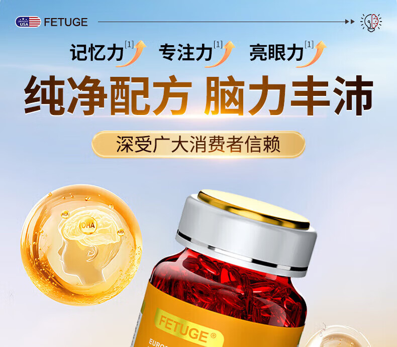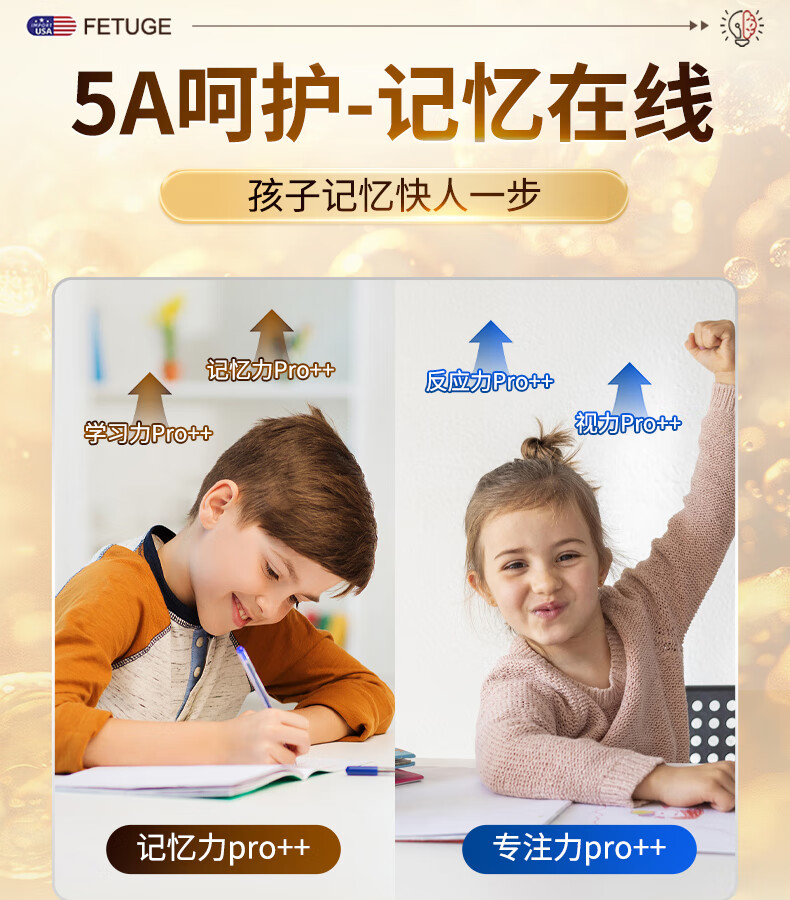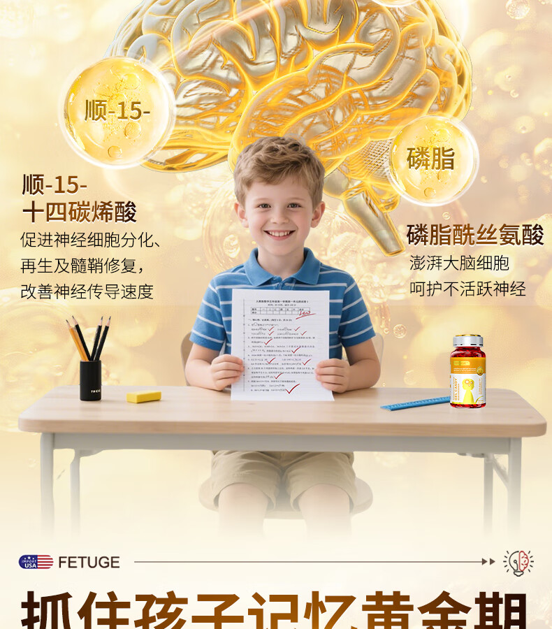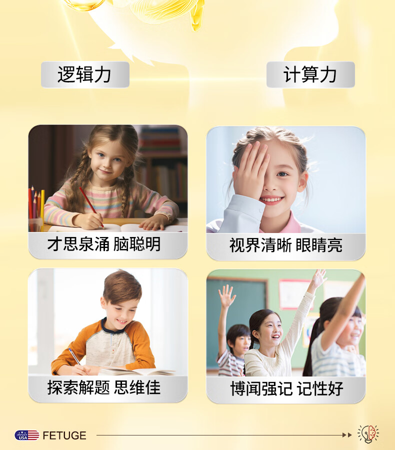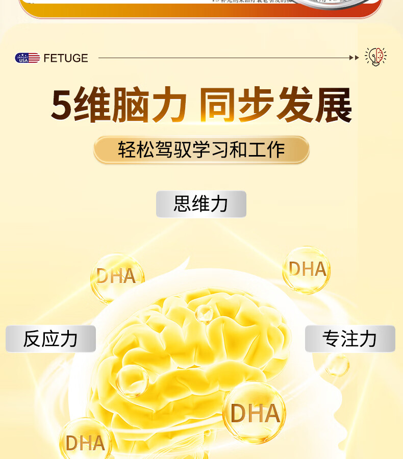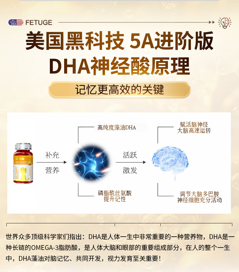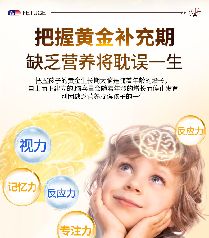 FETUGE美国DHA神经酸儿童青少年学生补脑增强记忆力思维活跃学习专注力 【1瓶激活装】强效补脑