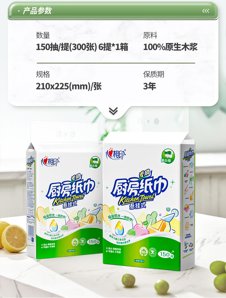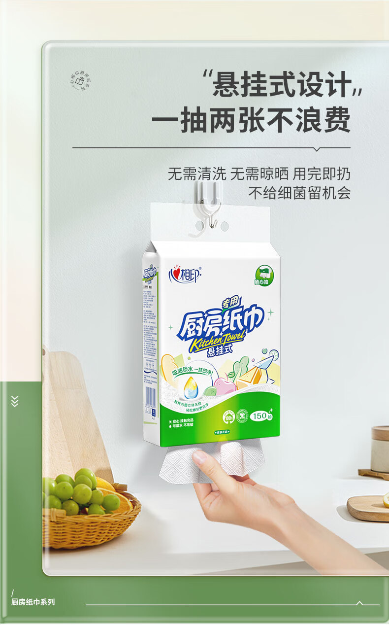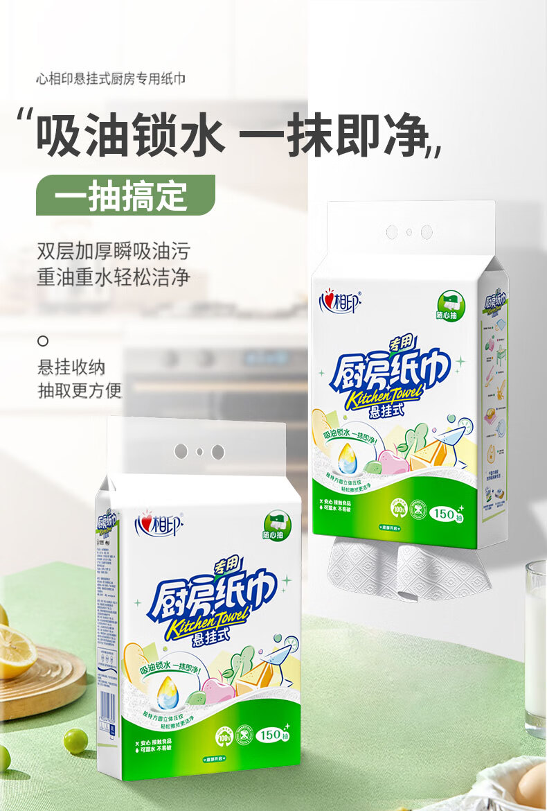 心相印厨房用纸悬挂式抽纸150抽*6提整箱装 吸油锁水食品级厨房纸巾