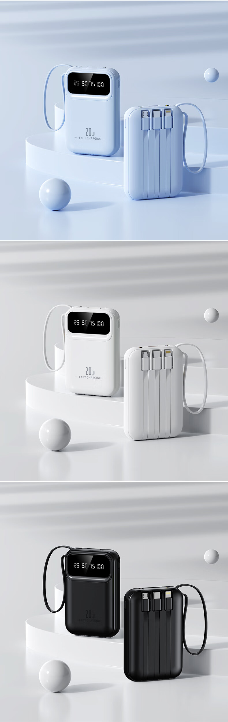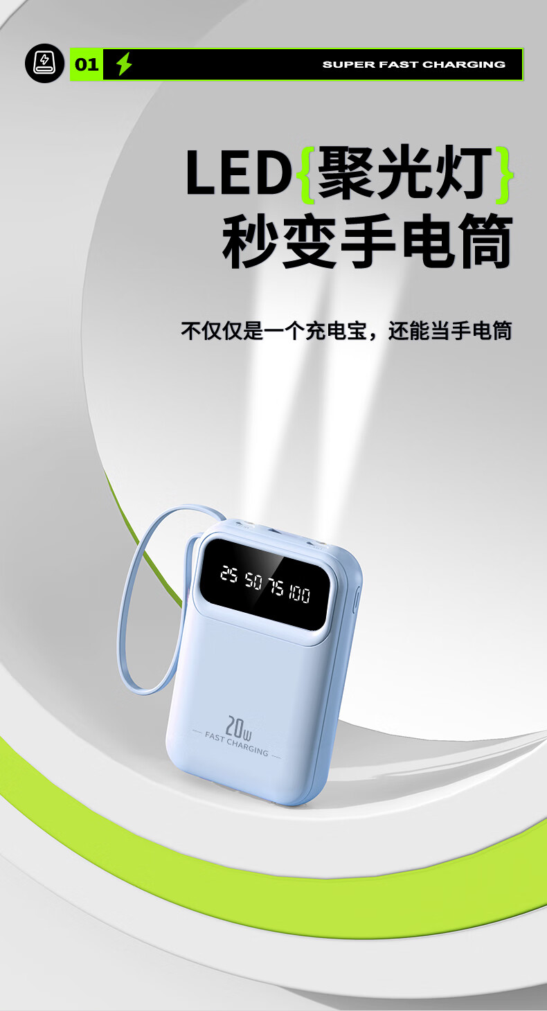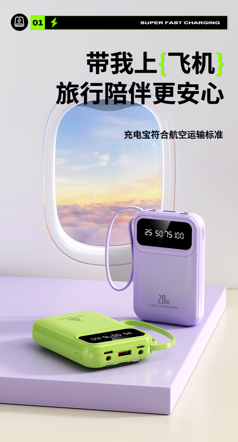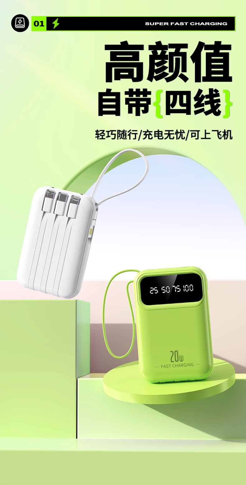 自带线充电宝3C认证大容量1/20000毫安超薄2025款小巧三合一便携迷你超级快充适用华为小米苹果15 浅湾蓝【提速版/增强快充/进口电芯】小巧/自带四线 20000M【可上飞机/高铁】