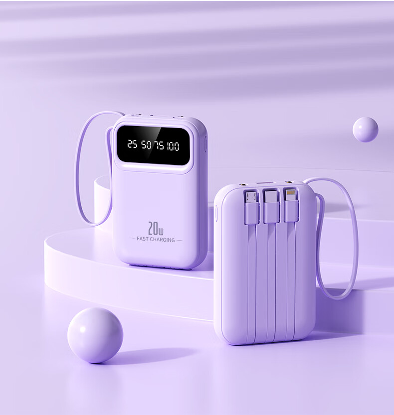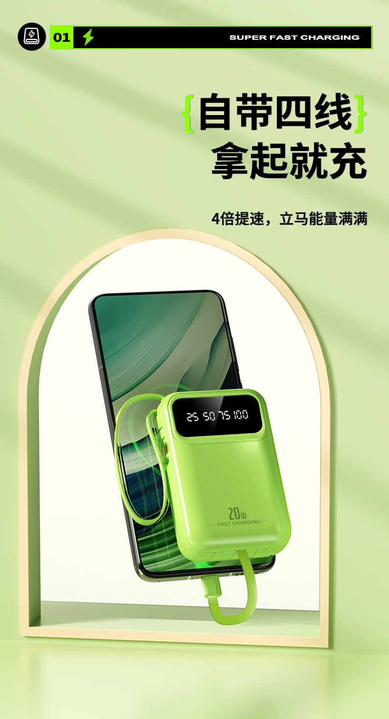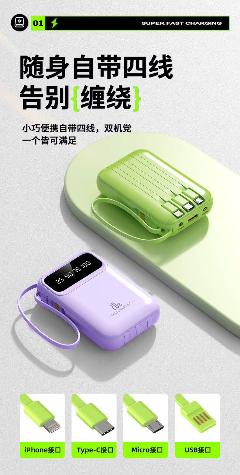 自带线充电宝3C认证大容量1/20000毫安超薄2025款小巧三合一便携迷你超级快充适用华为小米苹果15 浅湾蓝【提速版/增强快充/进口电芯】小巧/自带四线 20000M【可上飞机/高铁】