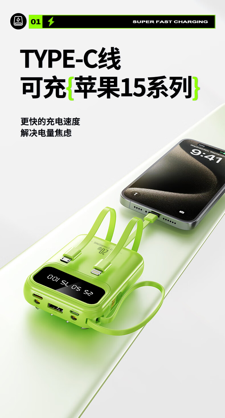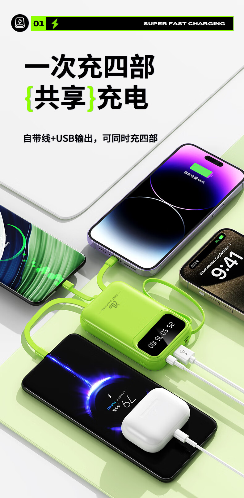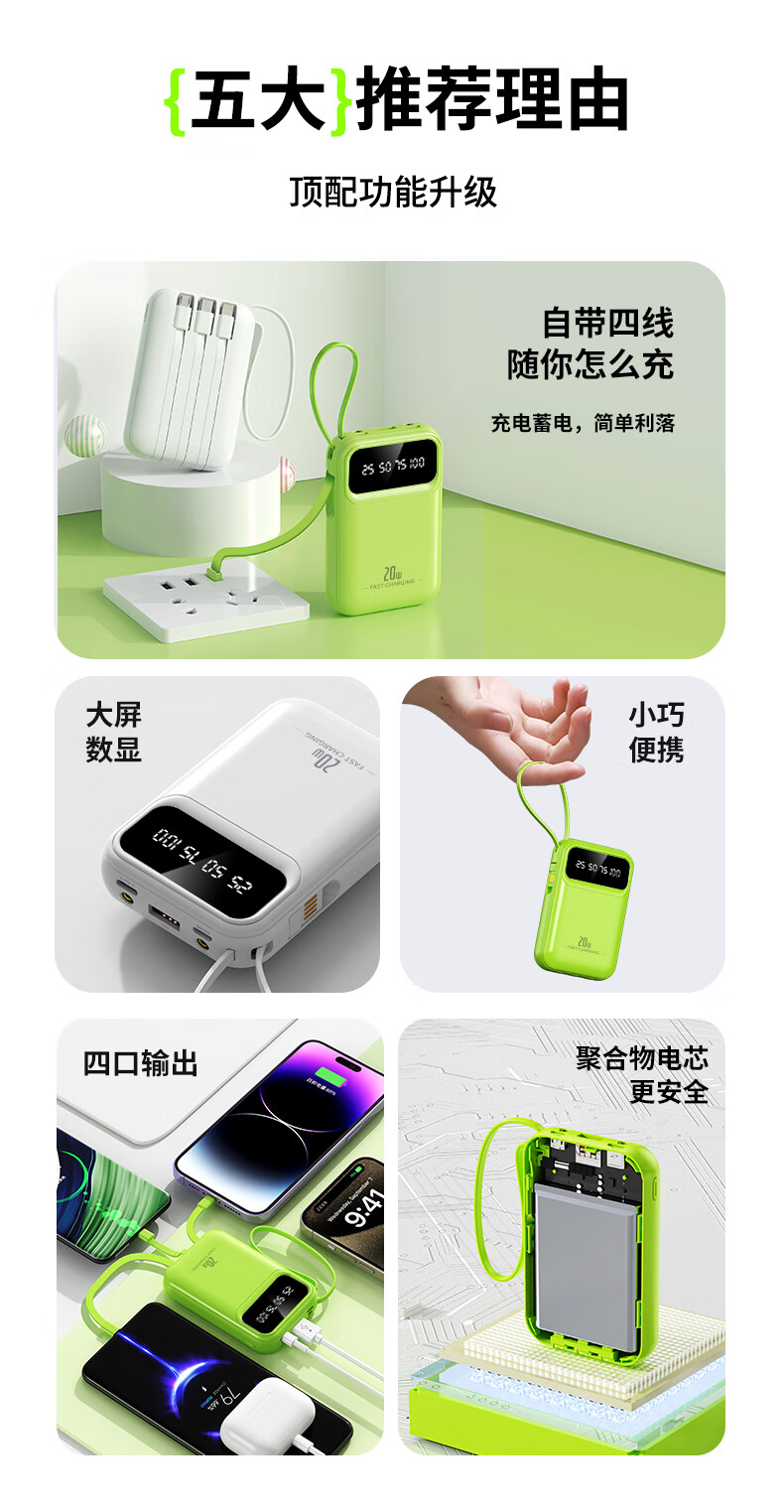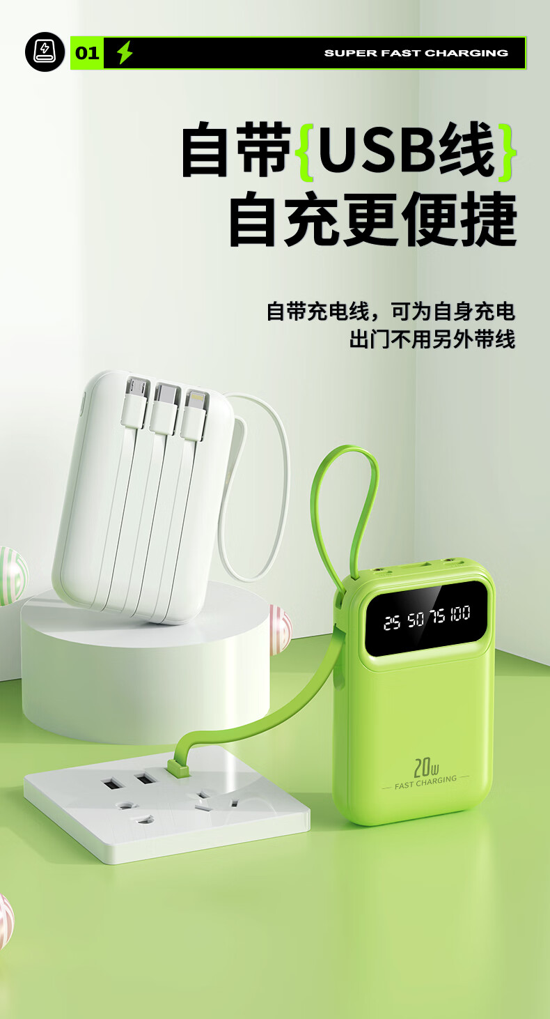 自带线充电宝3C认证大容量1/20000毫安超薄2025款小巧三合一便携迷你超级快充适用华为小米苹果15 浅湾蓝【提速版/增强快充/进口电芯】小巧/自带四线 20000M【可上飞机/高铁】