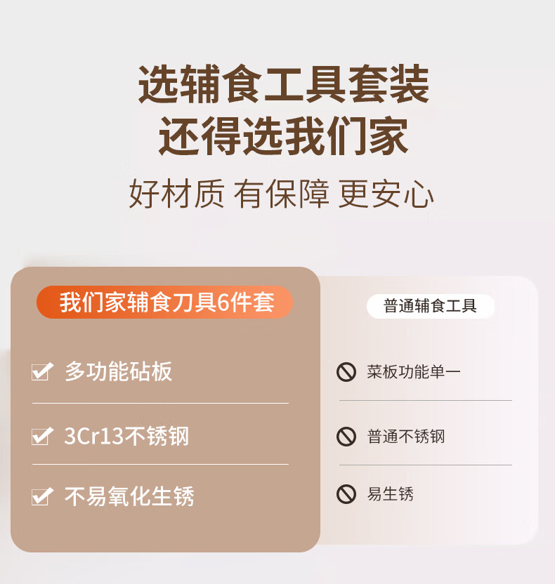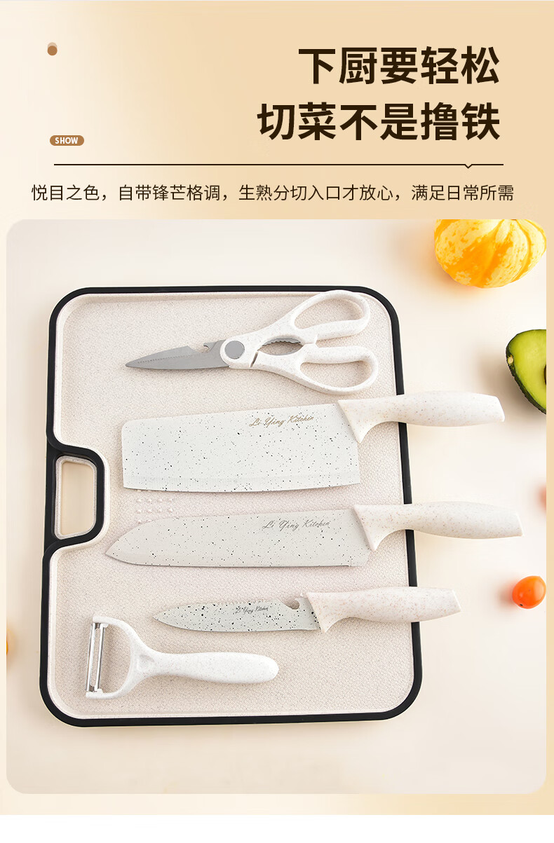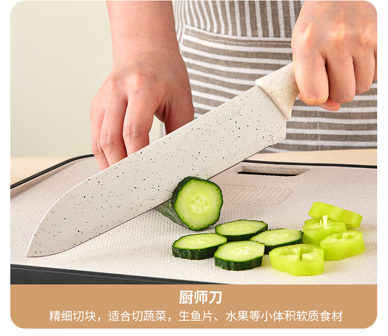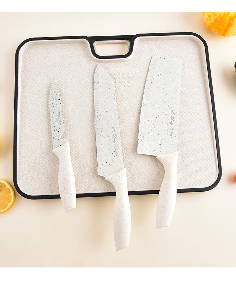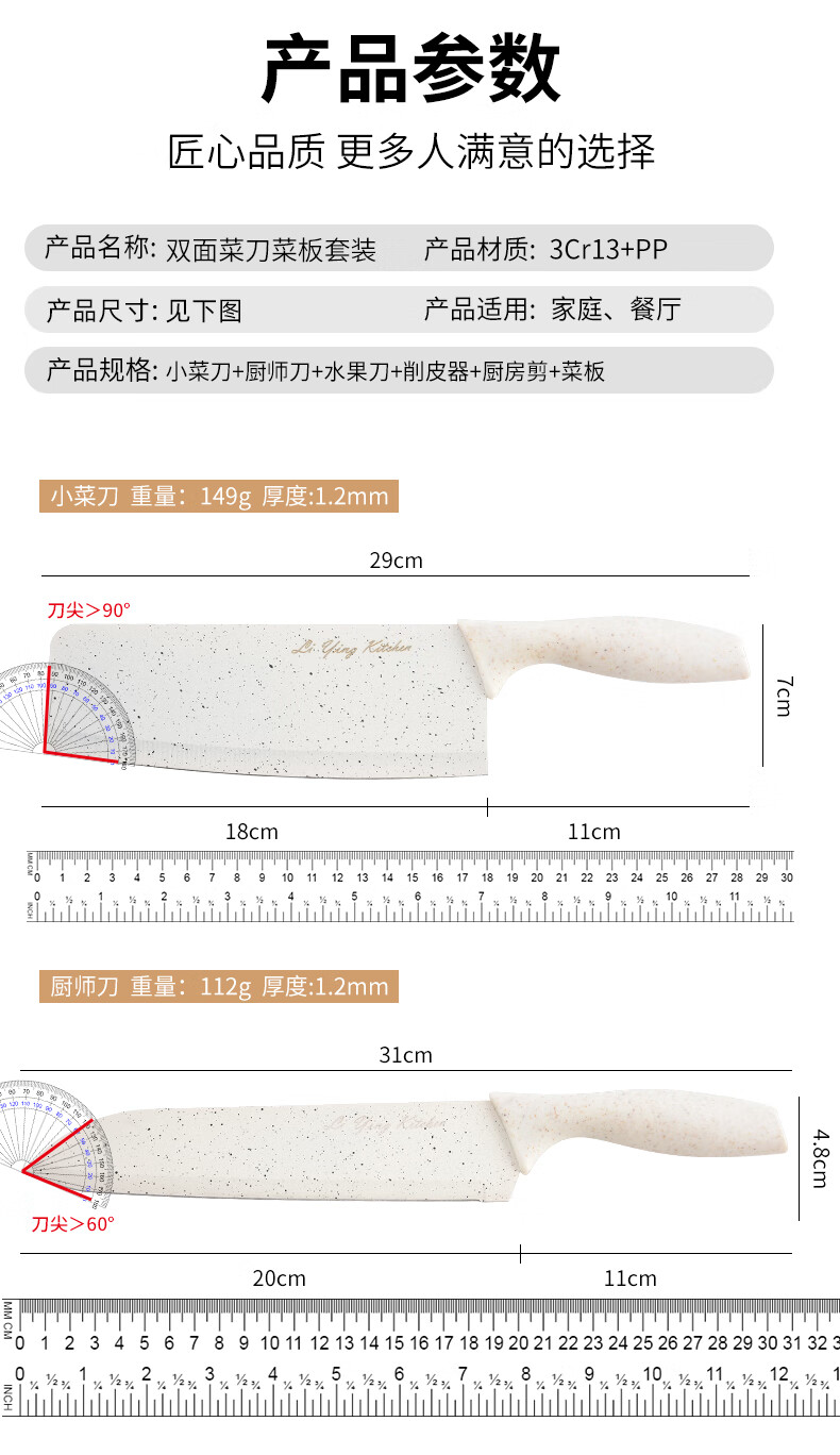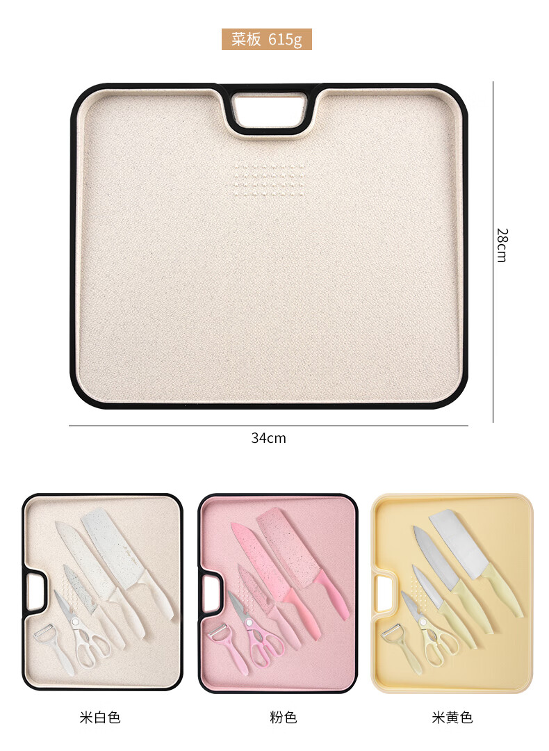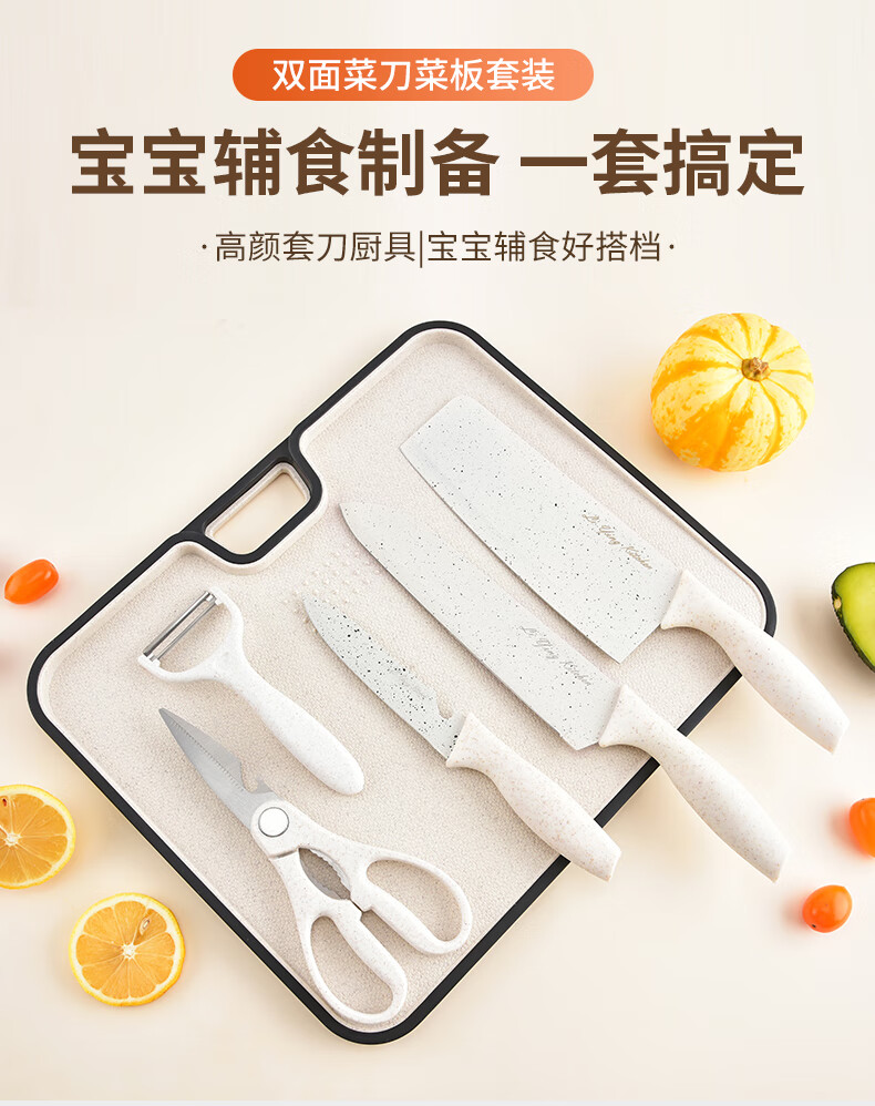 婴儿辅食刀具套装宝宝专用菜刀菜板砧板全套厨房工具宿舍组合套装 【米白色】双面菜刀菜板4件套装