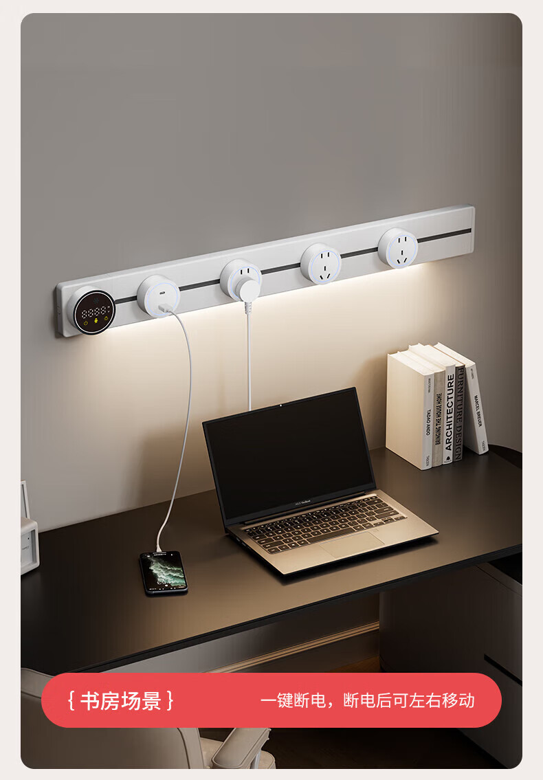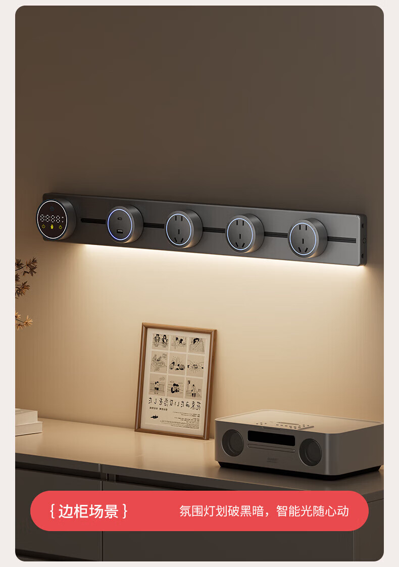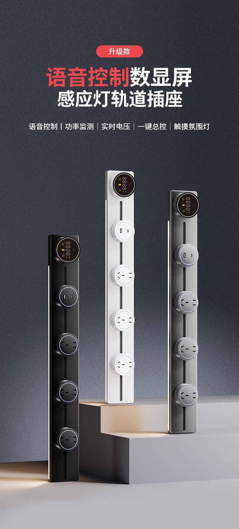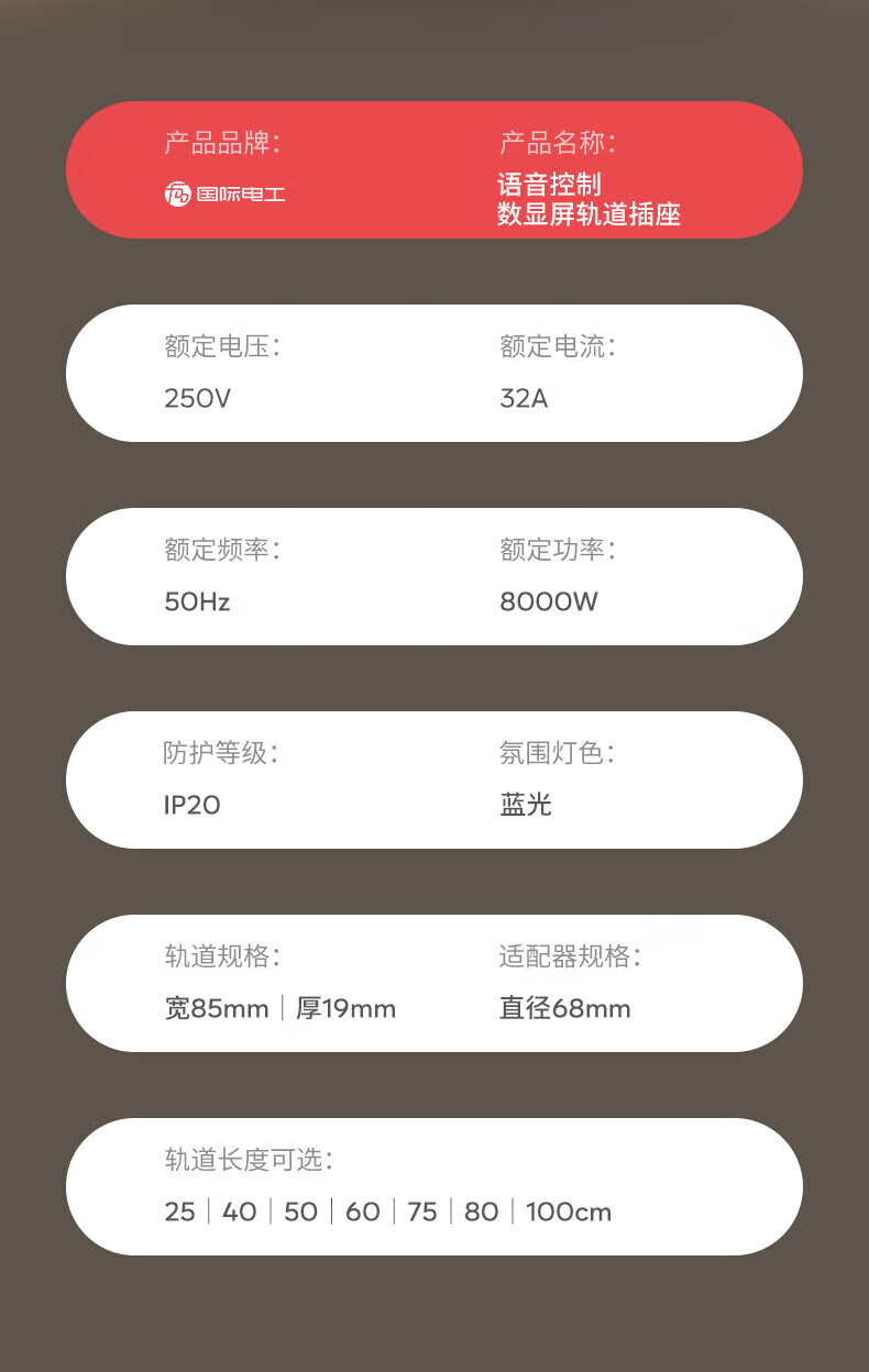 国际电工语音控制轨道插座智能数显示屏家用厨房餐边柜可移动带灯滑动插排 数显语音控制-40厘米+2大五孔(带灯)