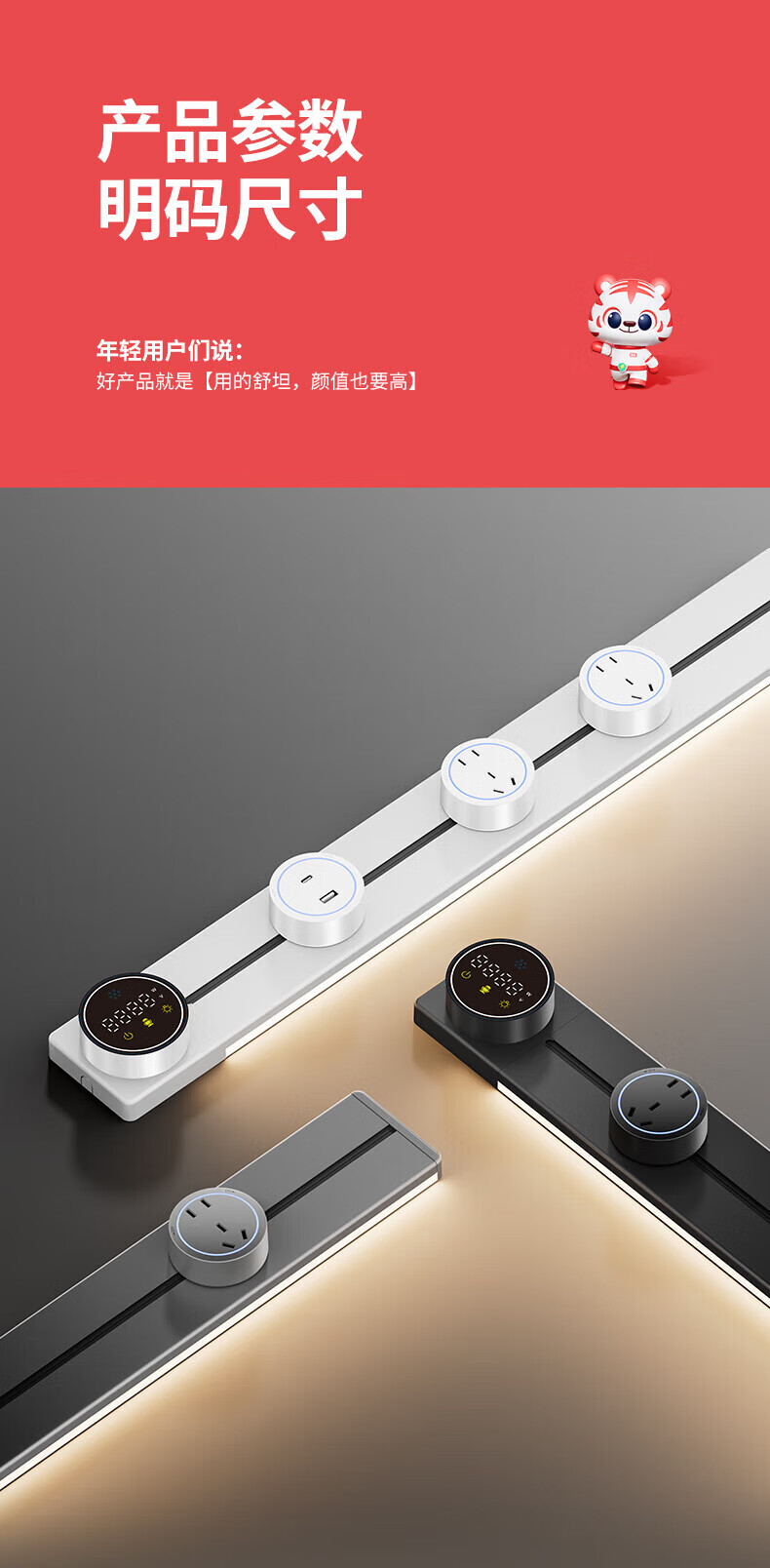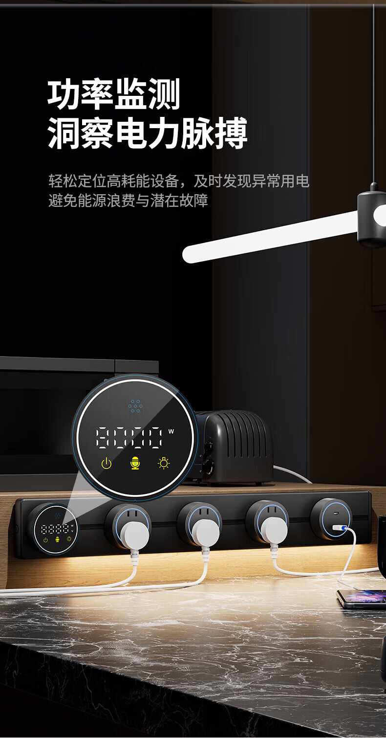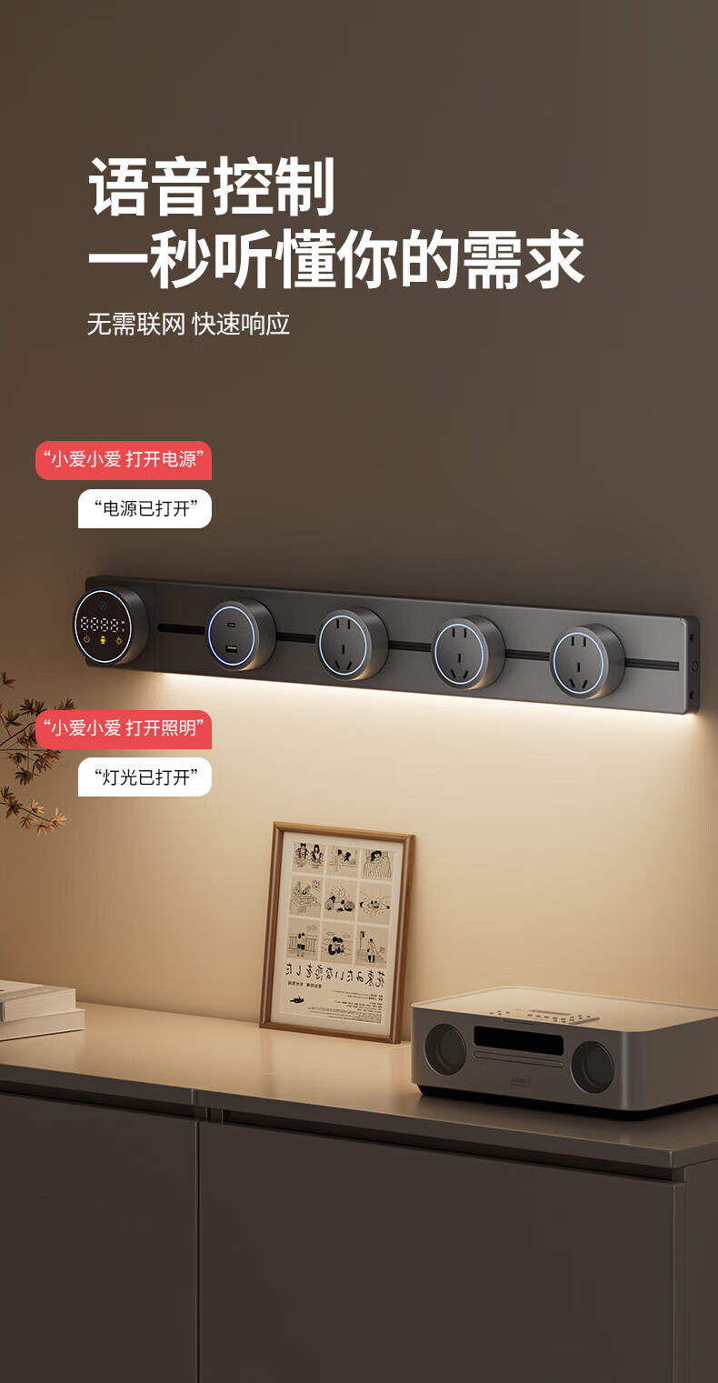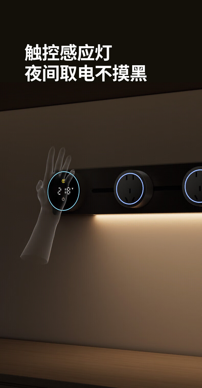 国际电工语音控制轨道插座智能数显示屏家用厨房餐边柜可移动带灯滑动插排 数显语音控制-40厘米+2大五孔(带灯)