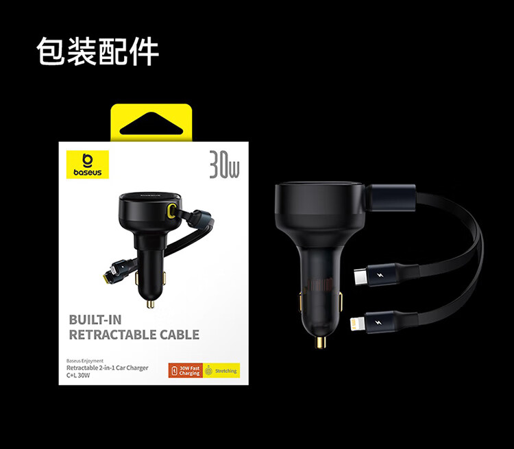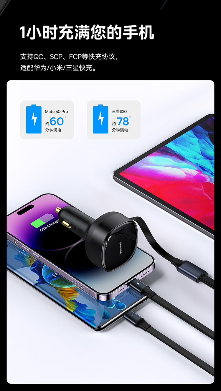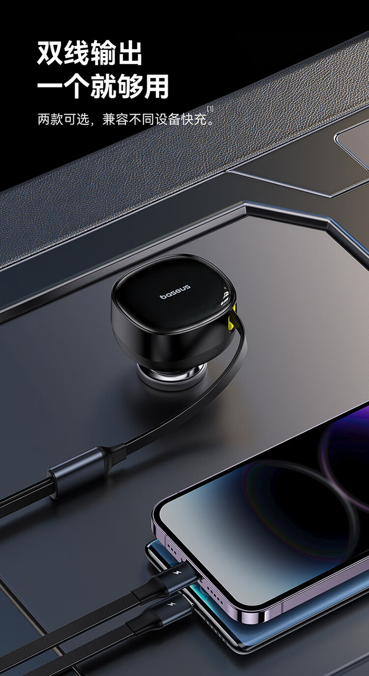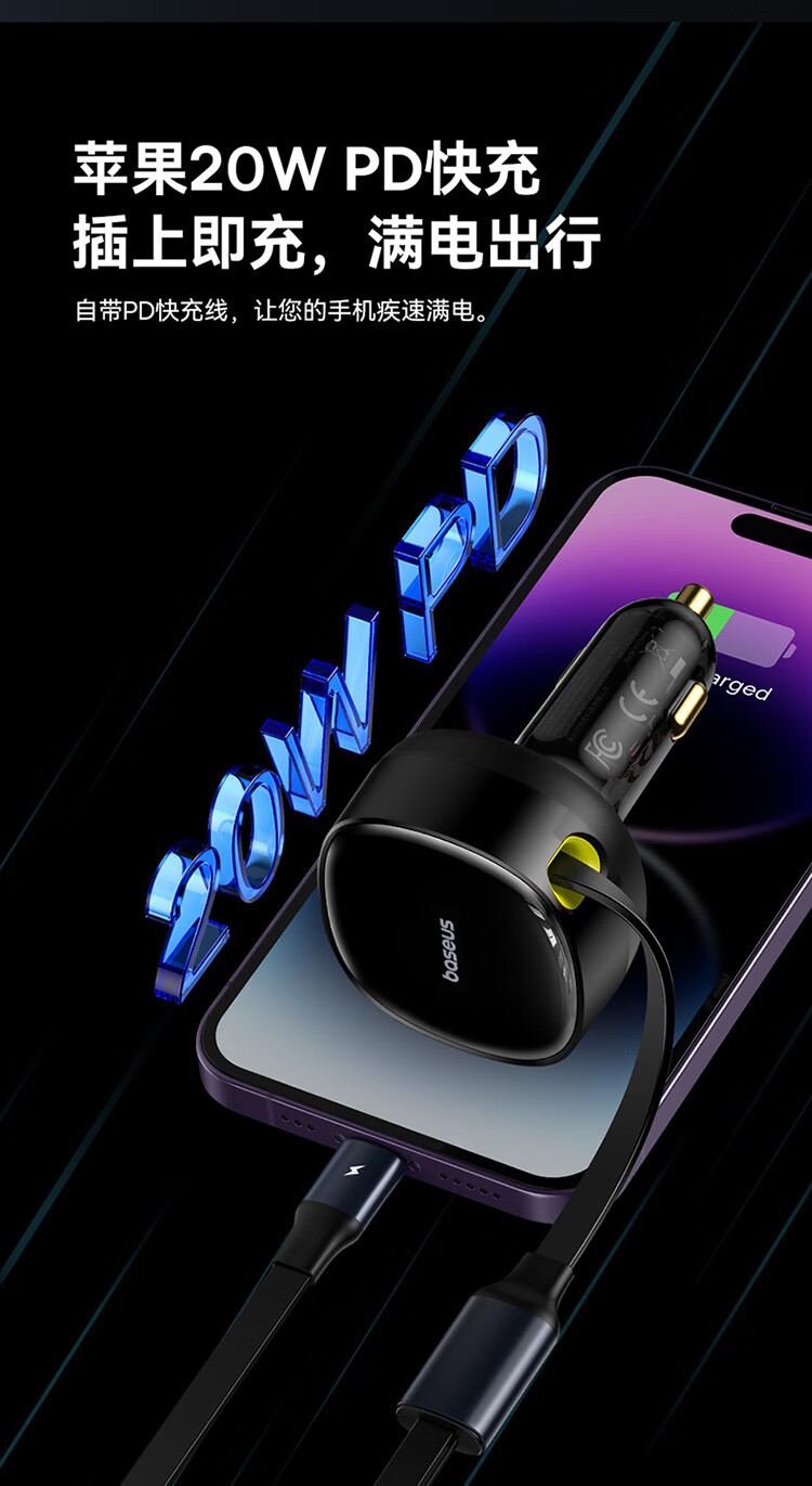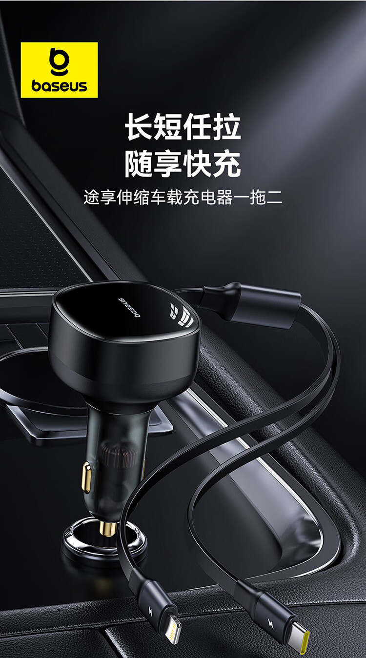 倍思车载充电器伸缩一拖二点烟器自带线超级快充适用苹果华为小米