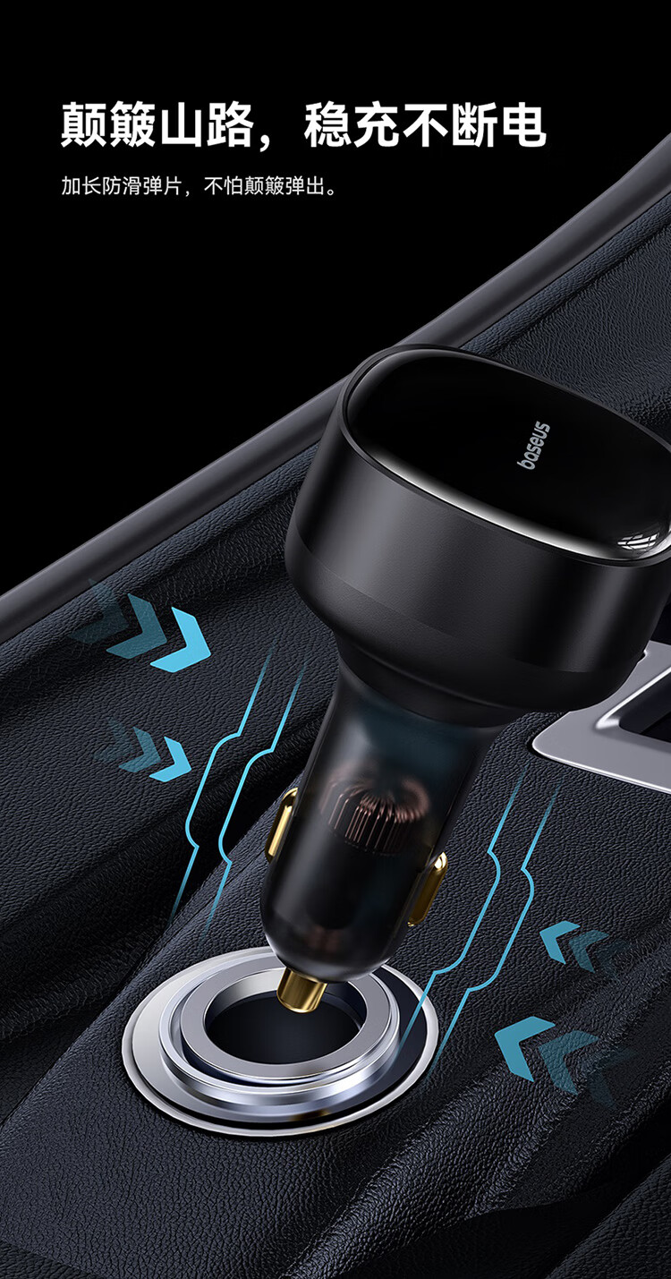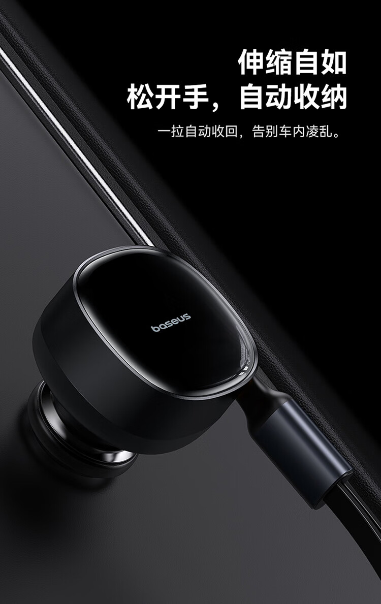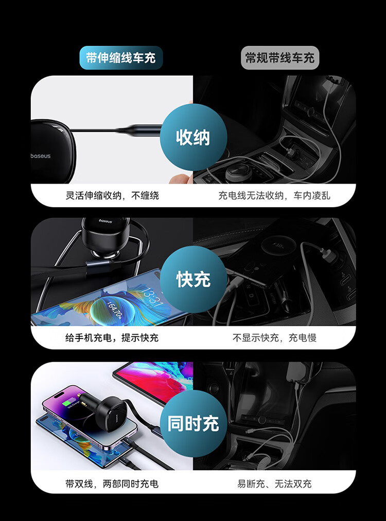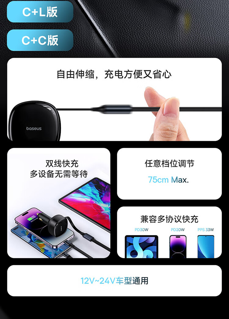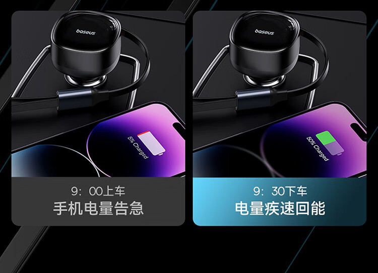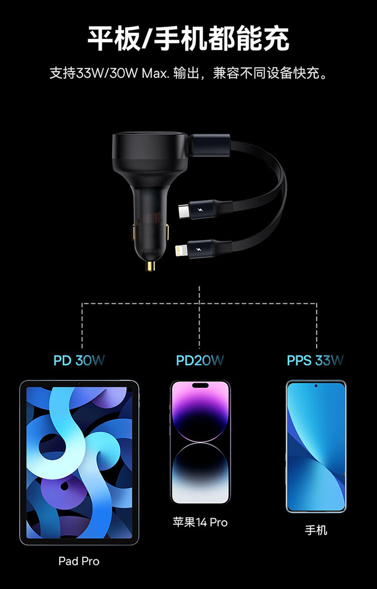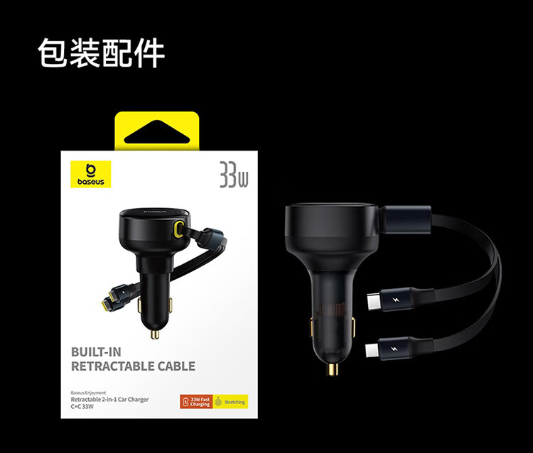 倍思车载充电器伸缩一拖二点烟器自带线超级快充适用苹果华为小米