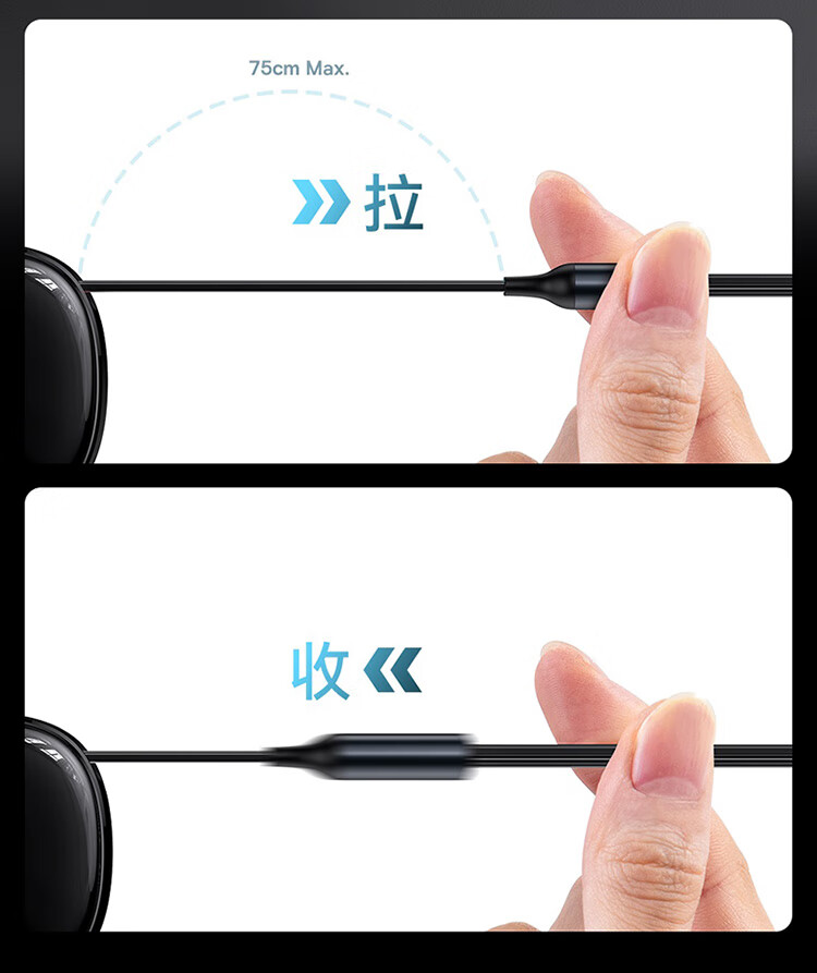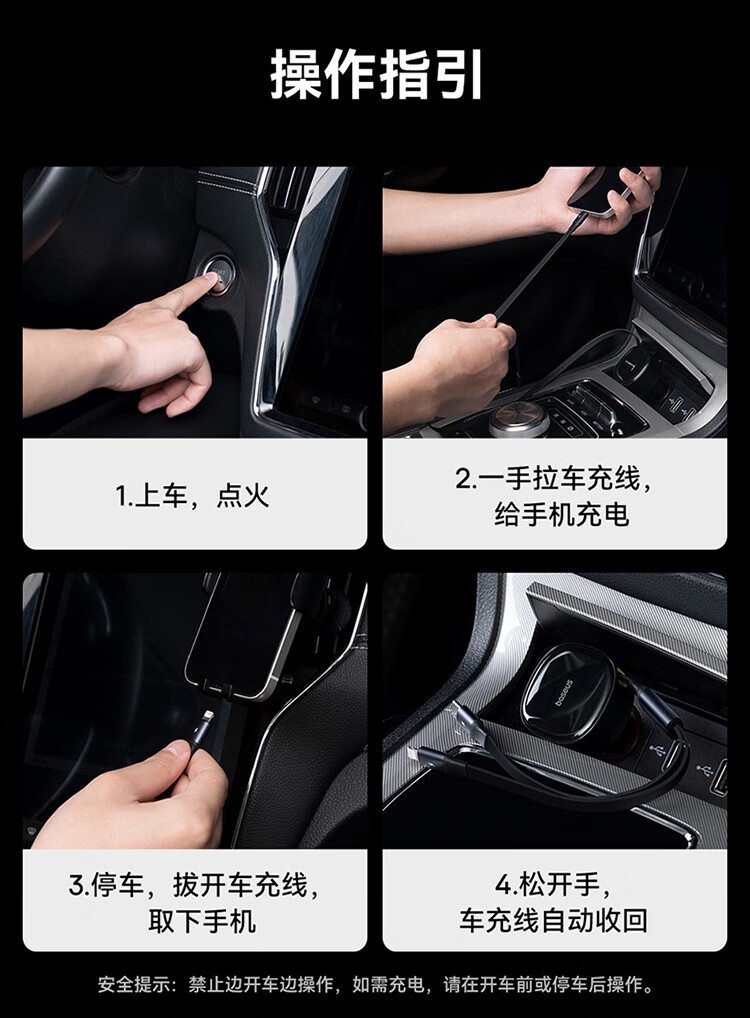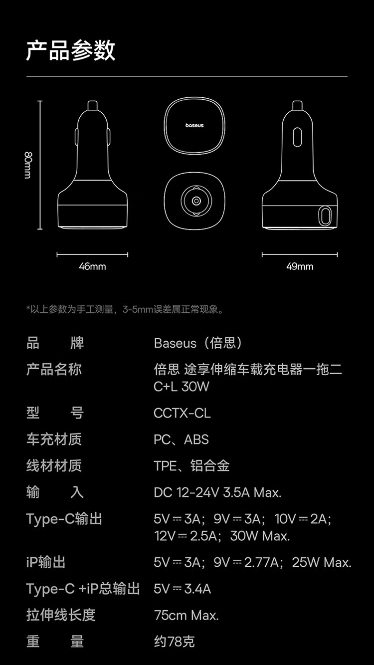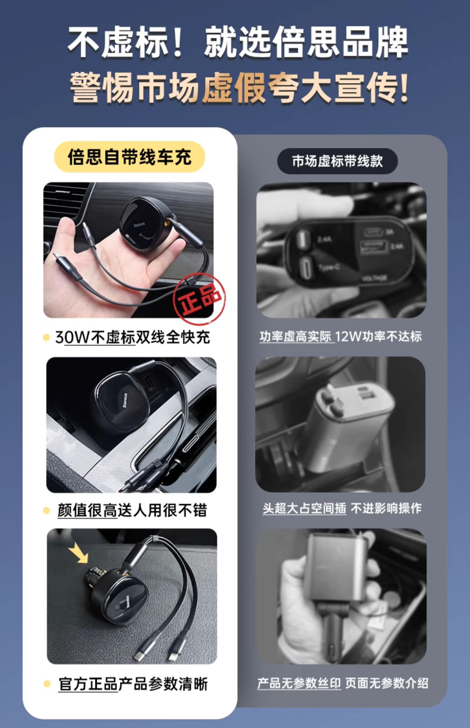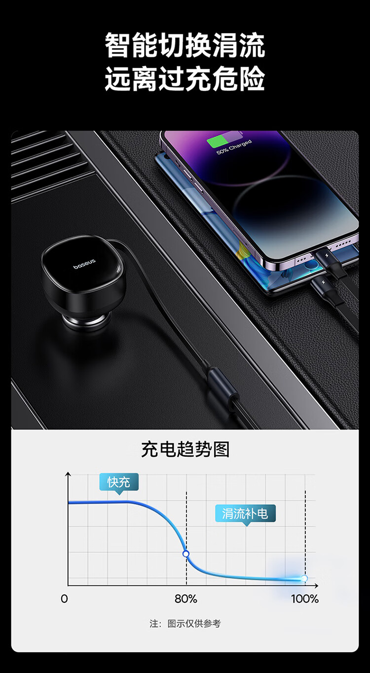 倍思车载充电器伸缩一拖二点烟器自带线超级快充适用苹果华为小米