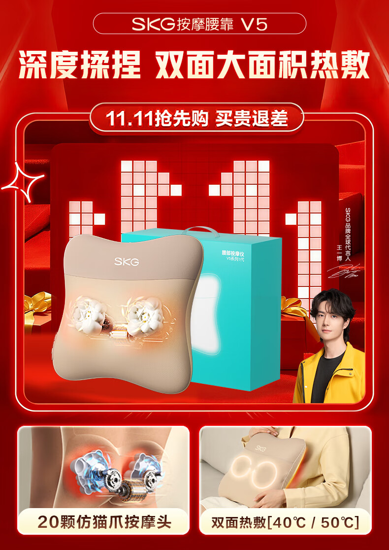 SKG 腰部按摩器V5腰靠靠垫车载护腰颈椎肩颈腿背部按摩仪热敷 生日礼物送男女朋友父母亲 卡其色-限定礼盒【90%的用户选择】