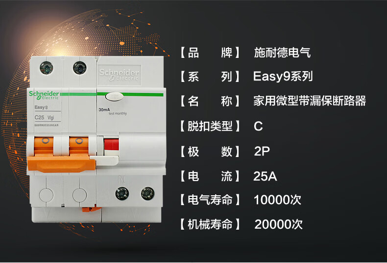 施耐德电气 空开带漏电保护断路器A型 2P C25A空气开关带漏保EA9RN2C2530CAR