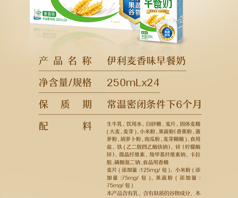 伊利 早餐奶麦香味250ml*24盒/箱 浓香麦片 礼盒装
