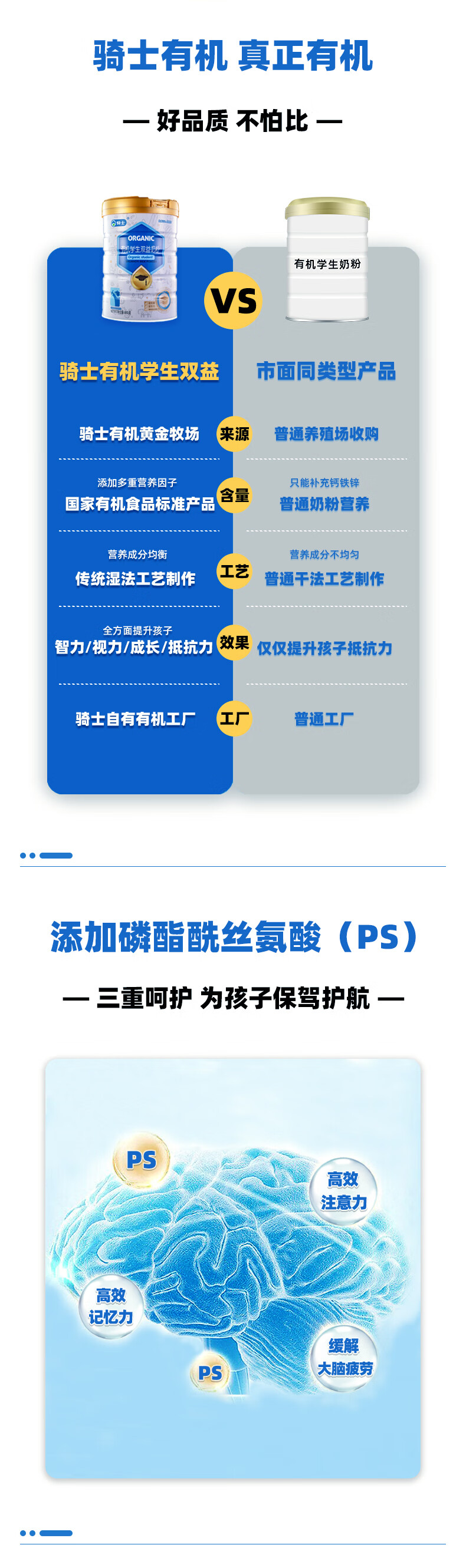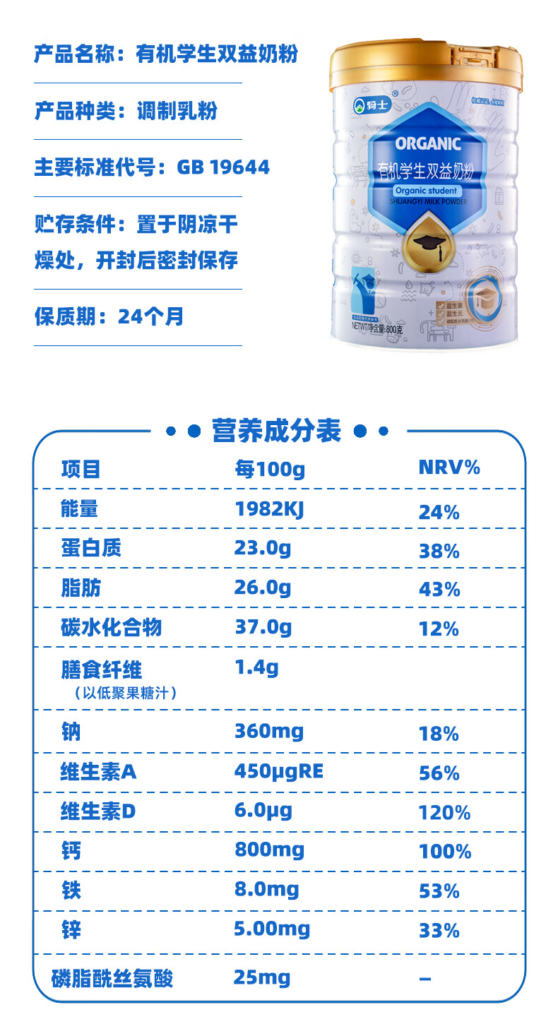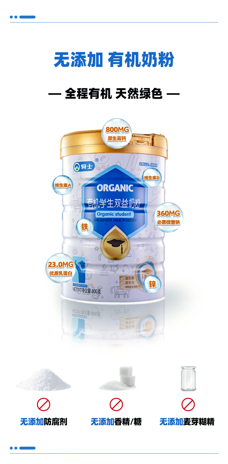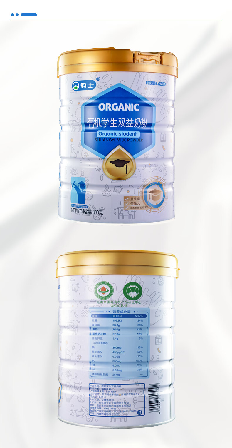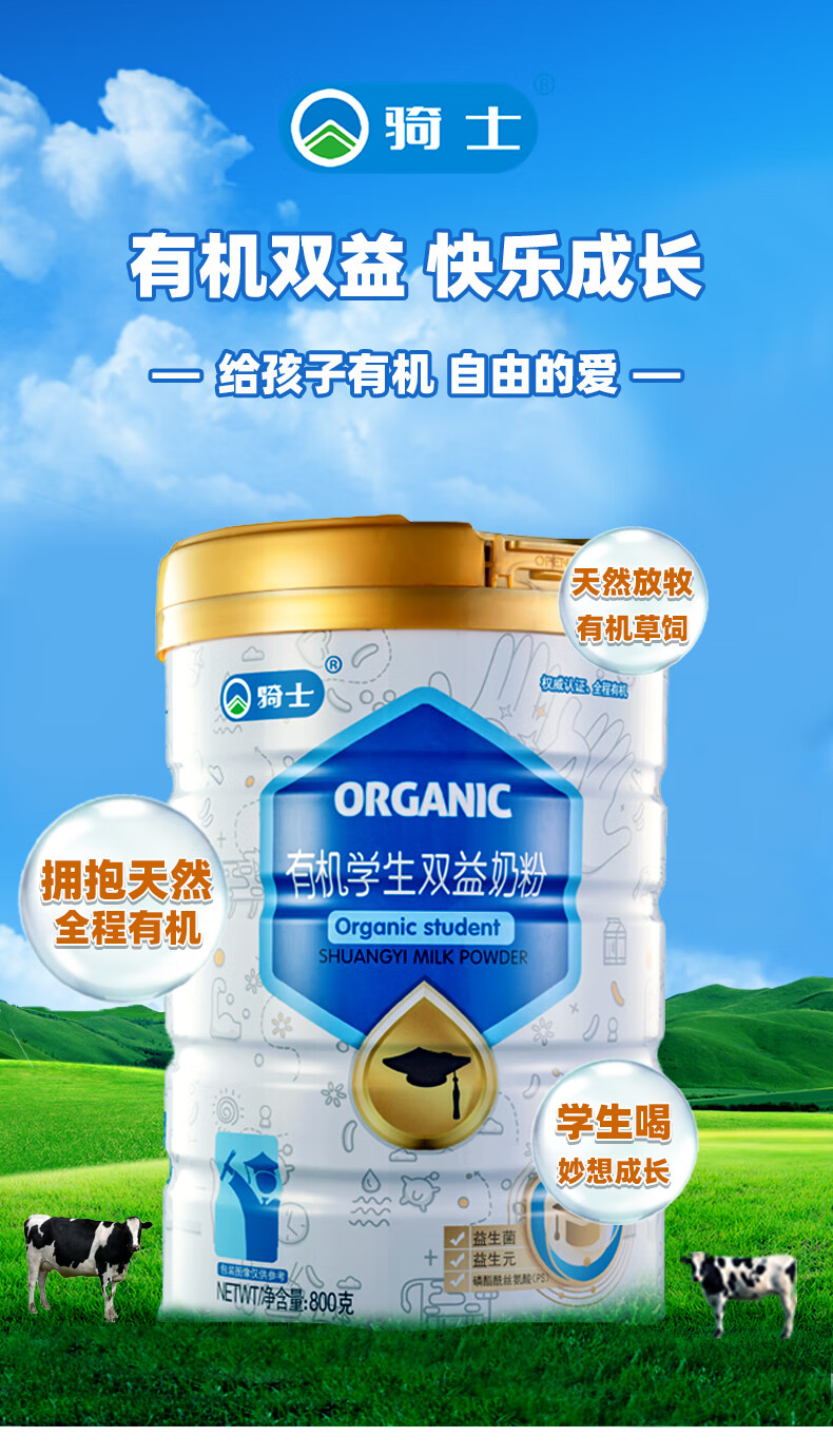 骑士有机学生双益奶粉800g罐装 学生青少年高钙营养早餐奶粉 多维铁锌