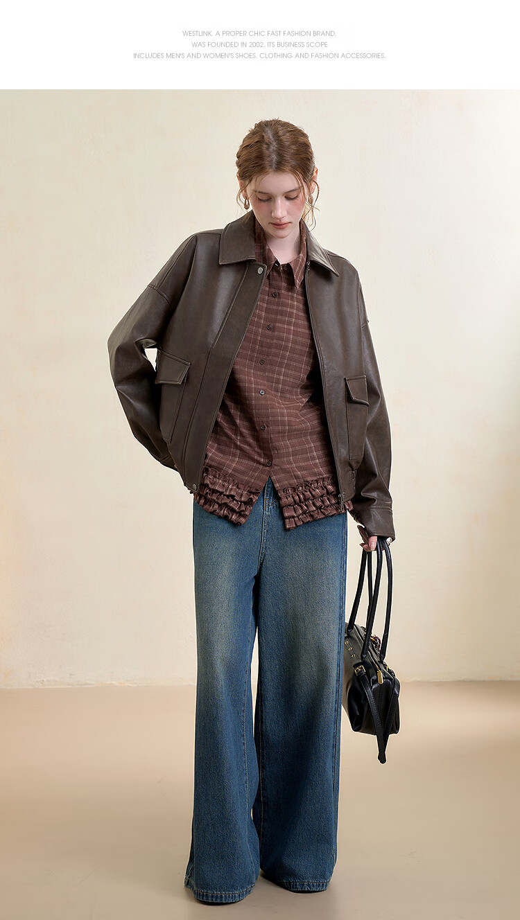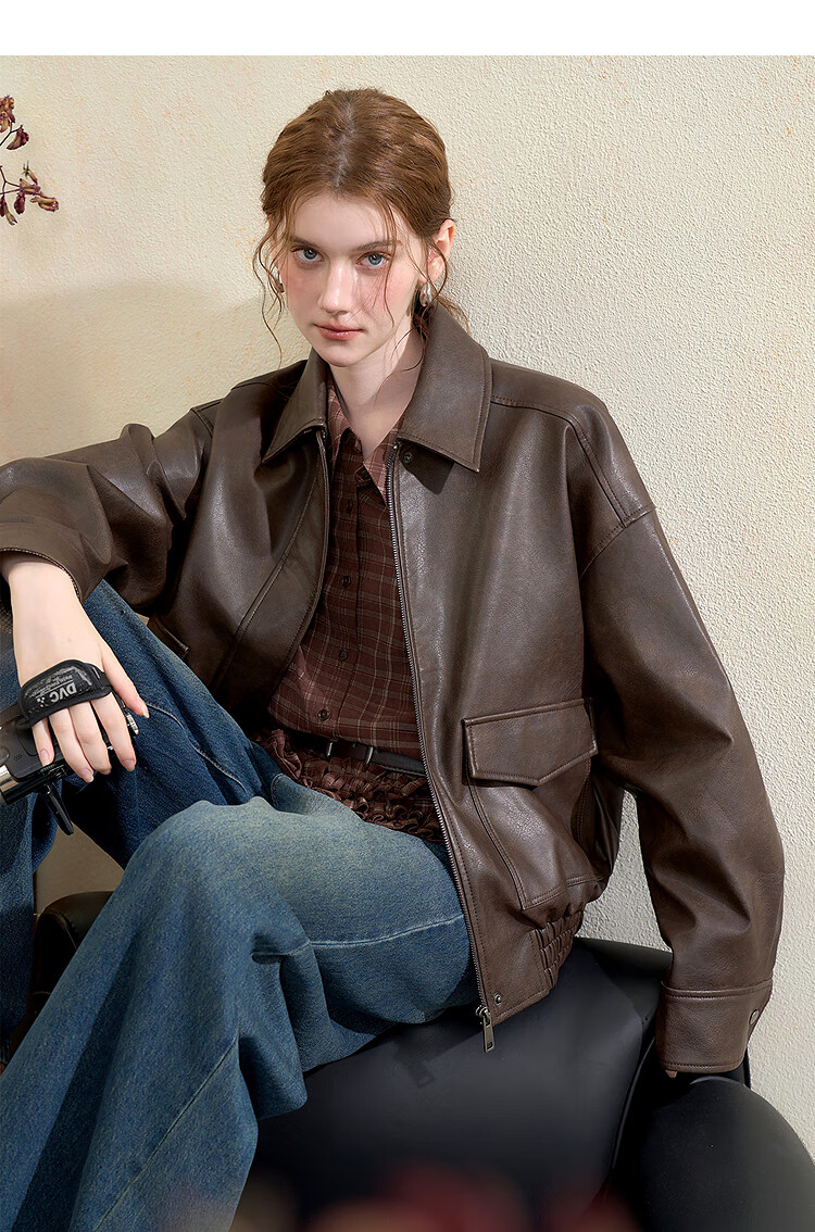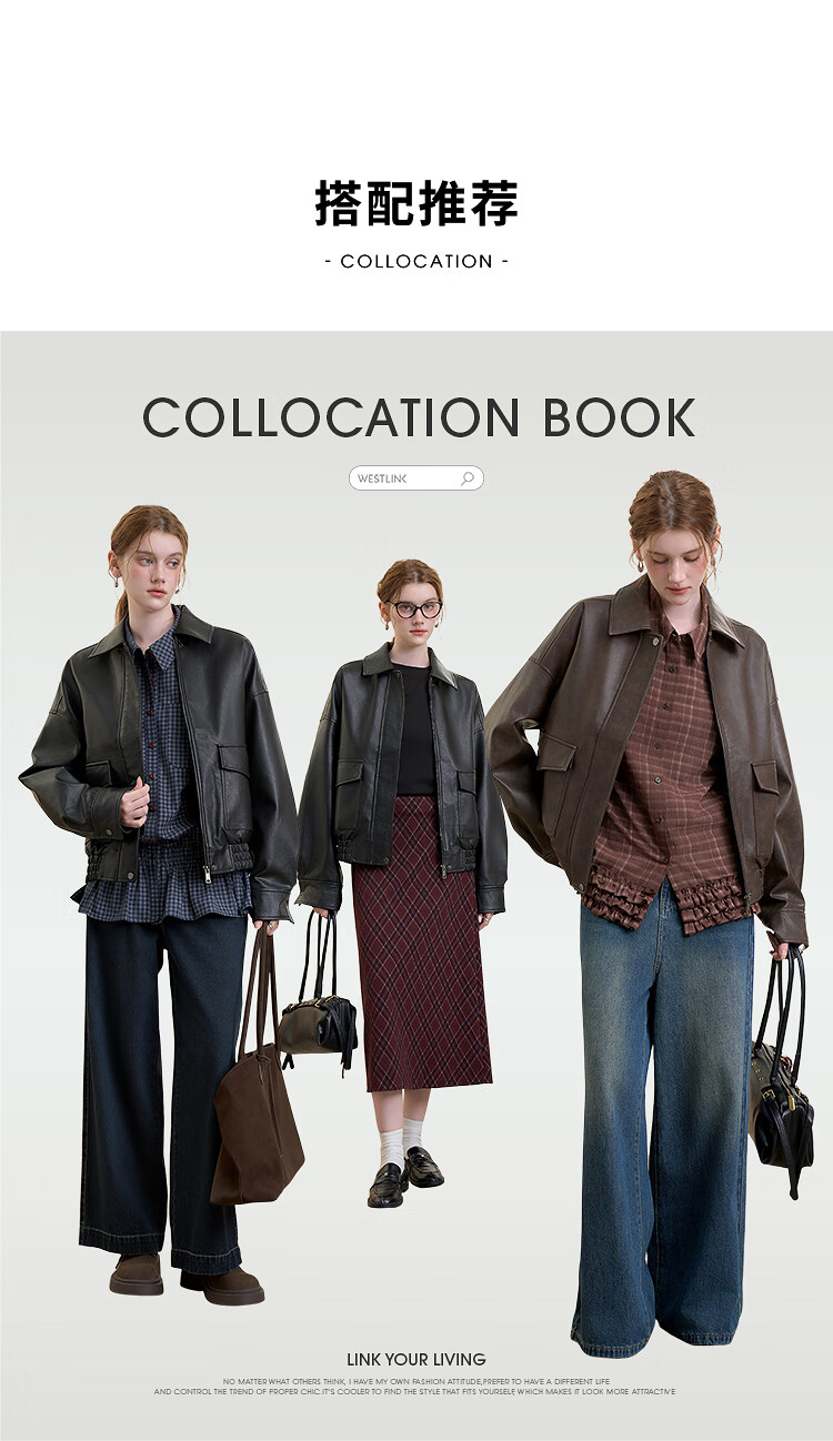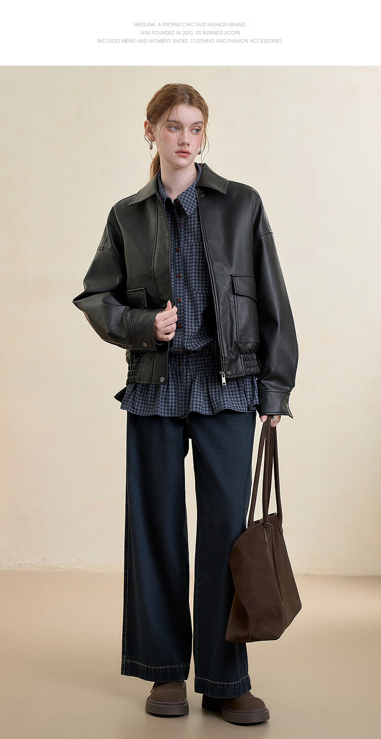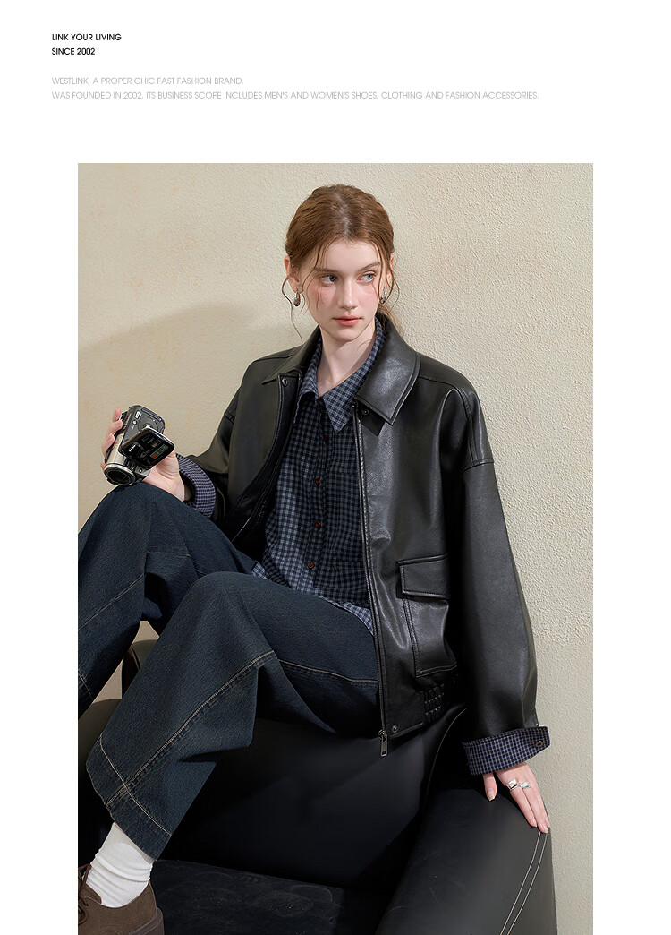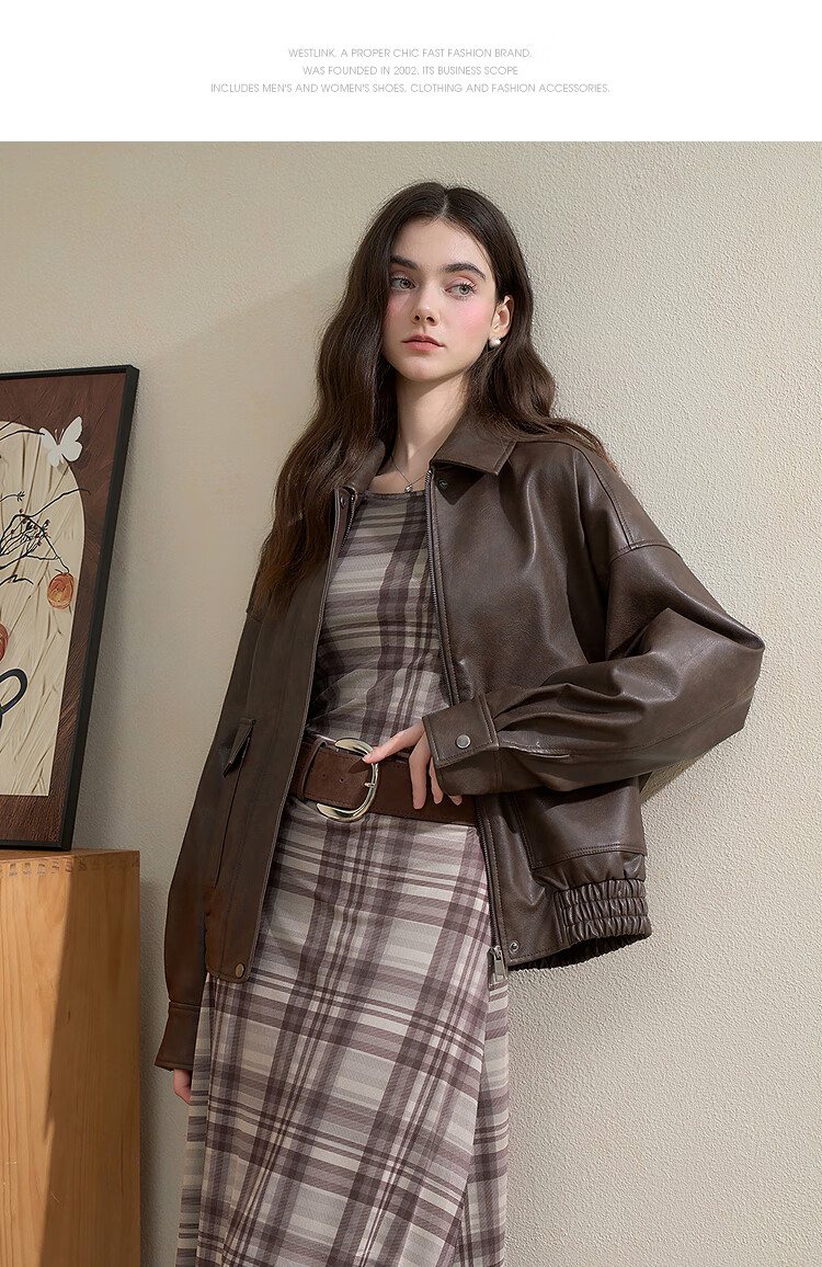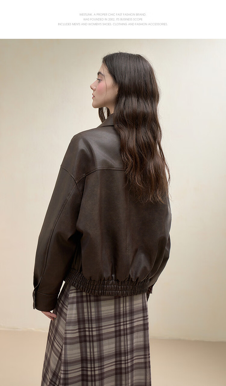 西遇(Westlink)复古休闲摩登质感pu皮夹克外套女秋宽松廓形显瘦机车服 咖色 (预售11月3日) M (160)