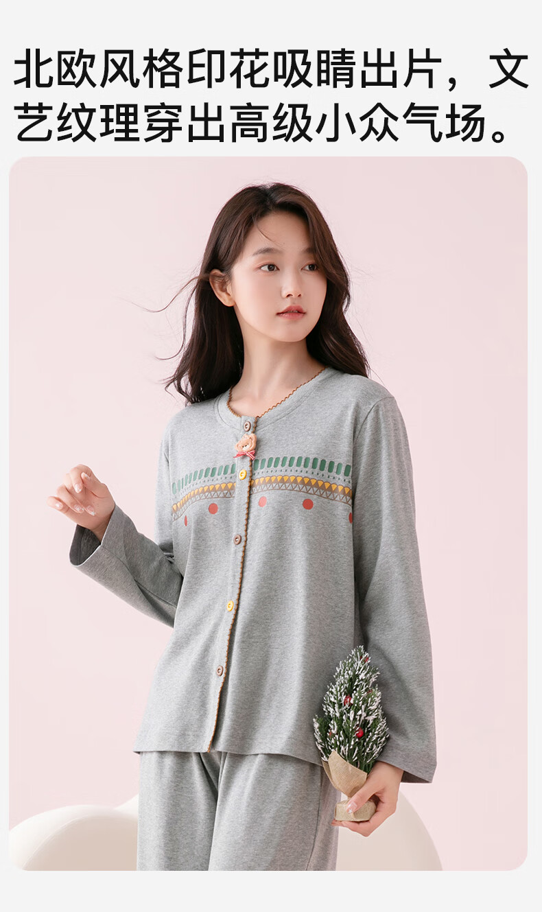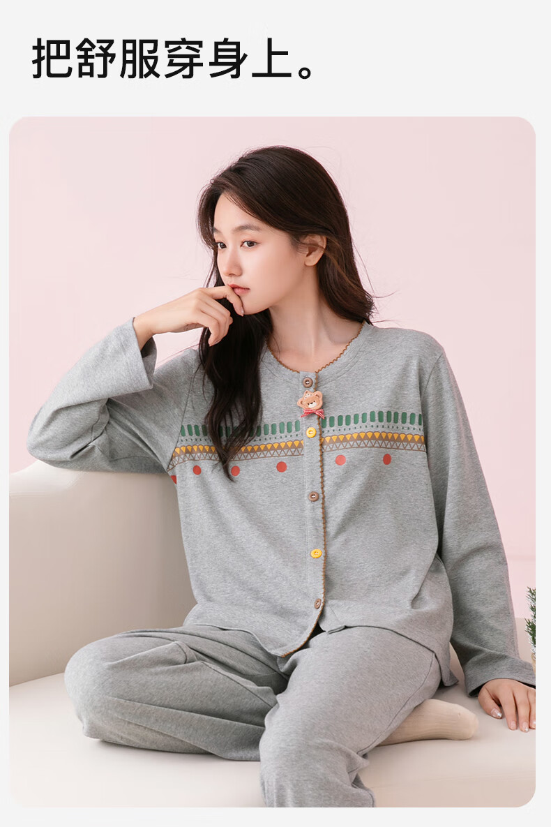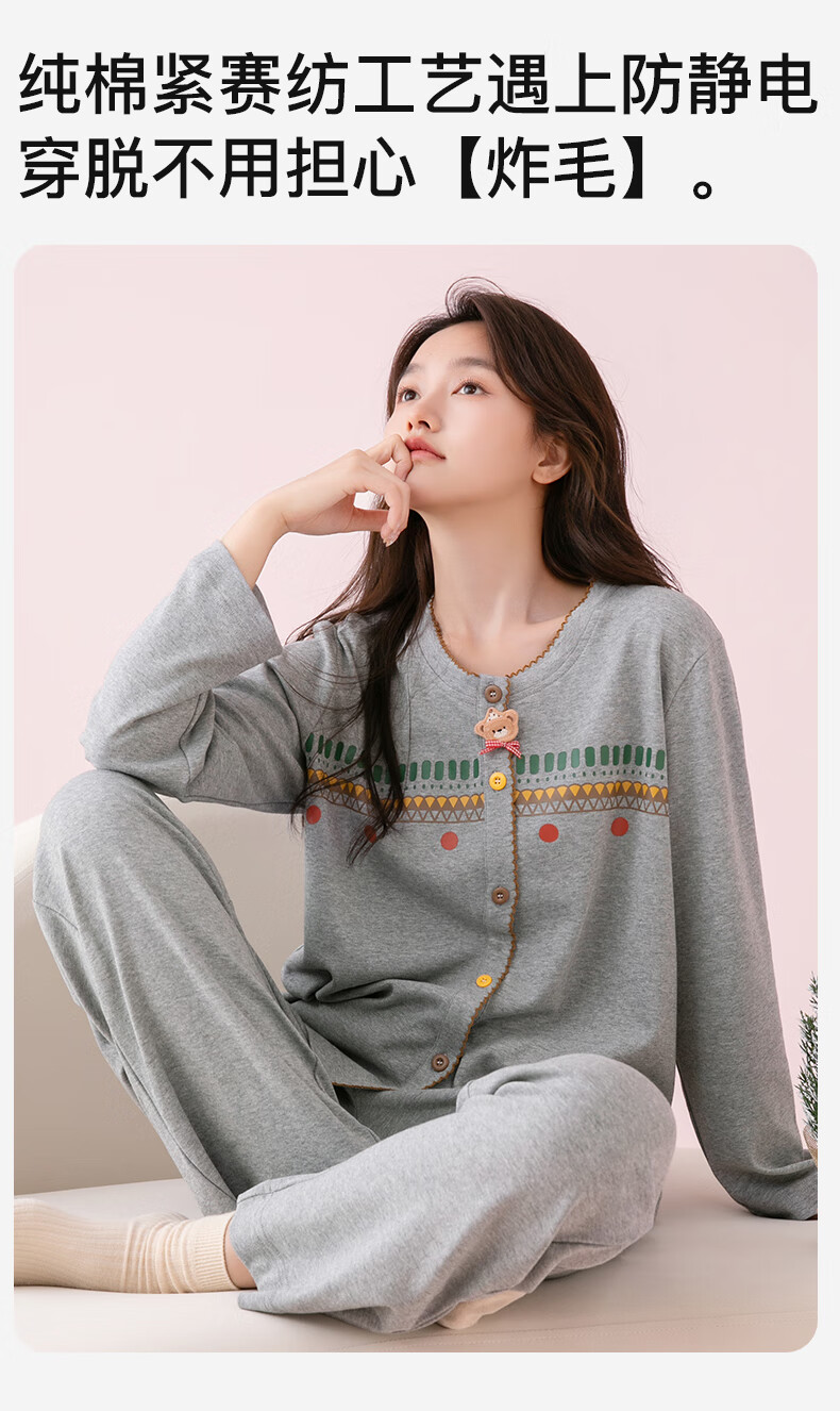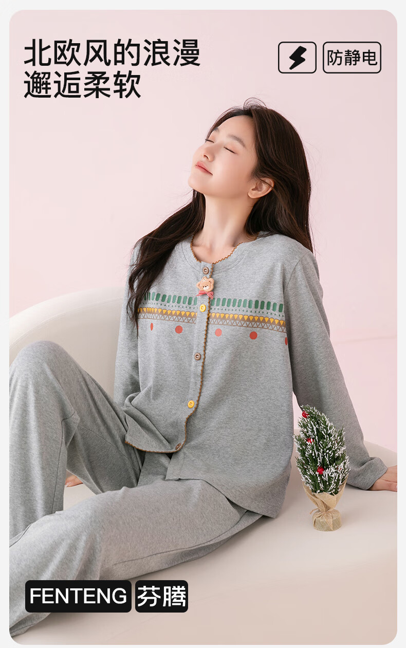 芬腾睡衣女【软棉棉】100%棉2025秋新款防静电家居服费尔岛套装外穿 花灰 M