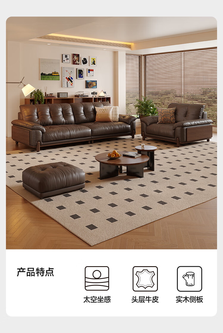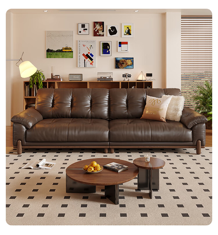 全友家居复古轻奢风头层牛皮沙发客厅家用大黑牛真皮艺一字直排式沙发
