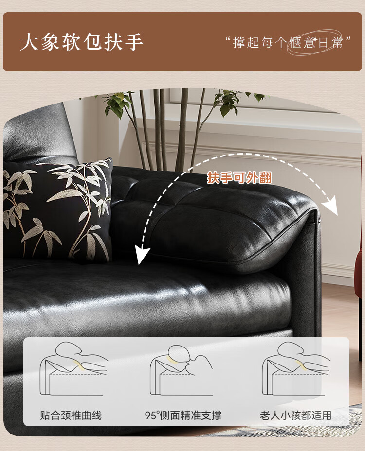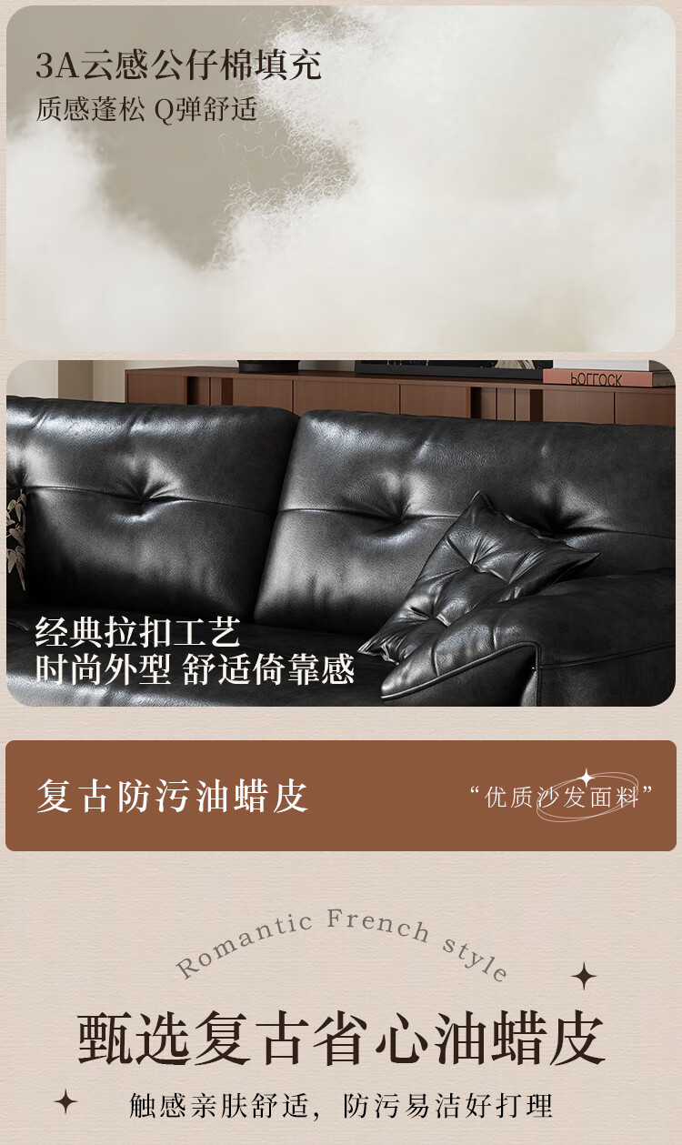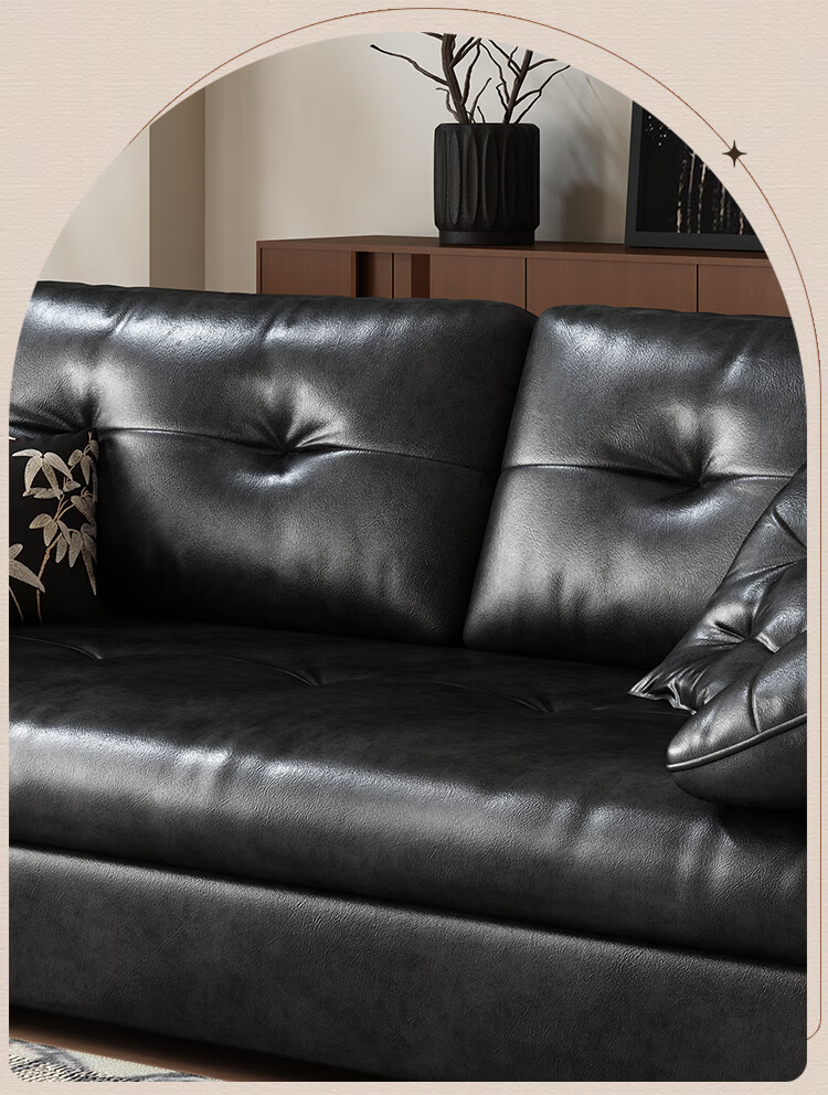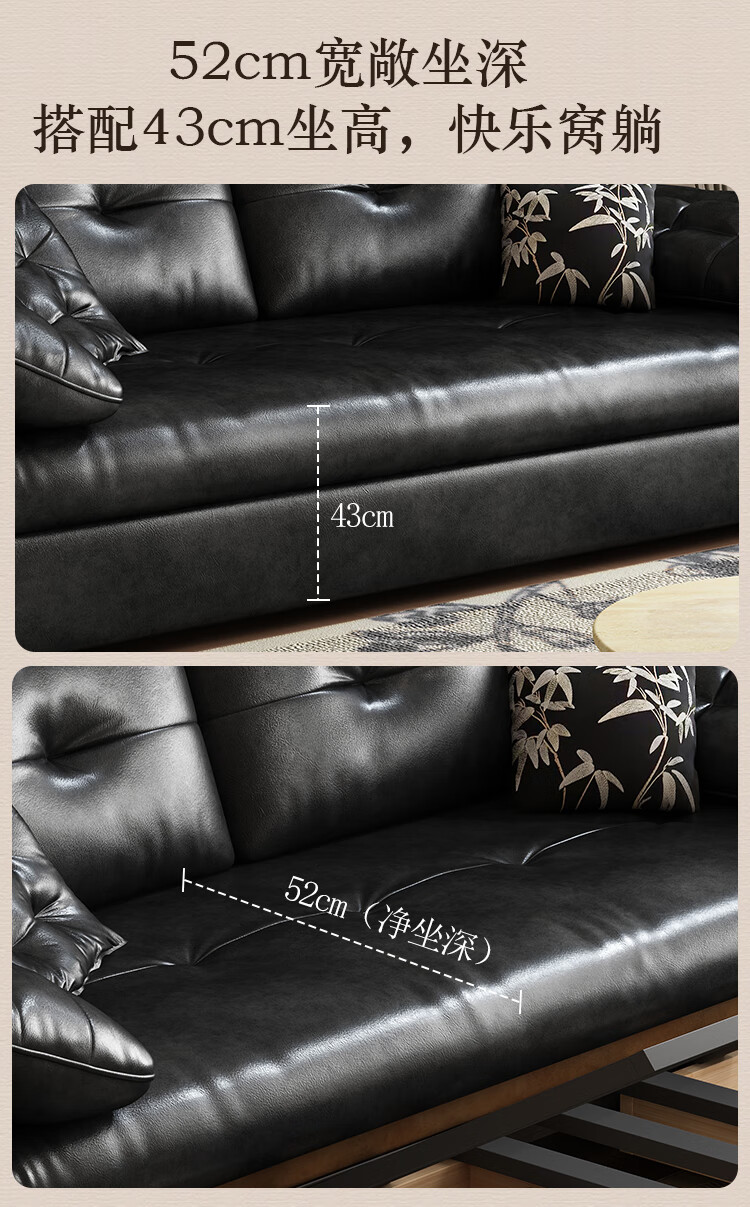 全友家居复古轻奢风头层牛皮沙发客厅家用大黑牛真皮艺一字直排式沙发