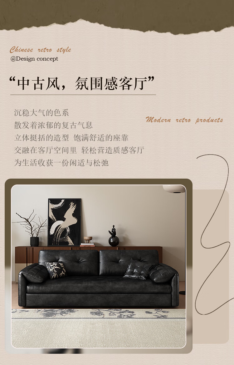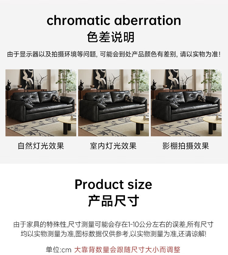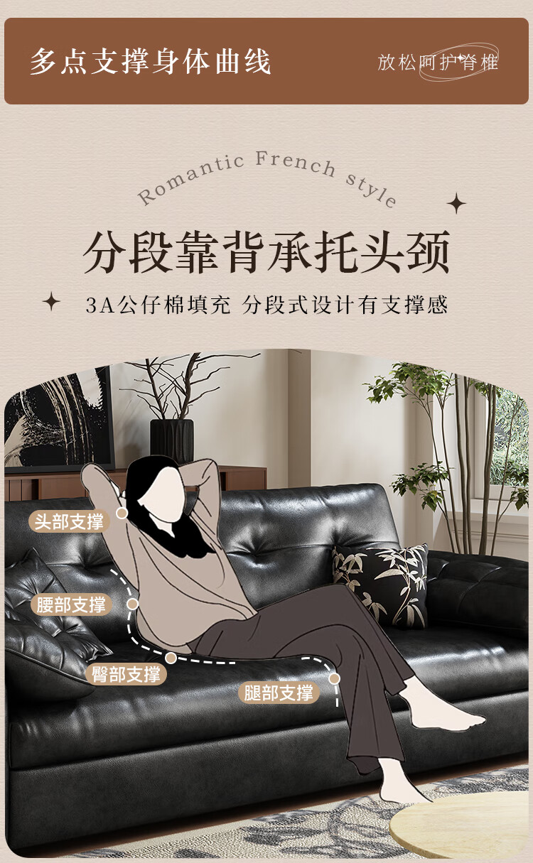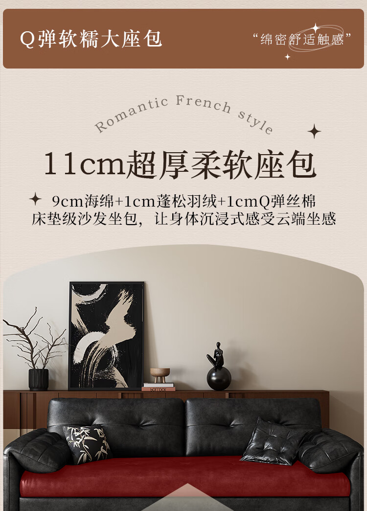 全友家居复古轻奢风头层牛皮沙发客厅家用大黑牛真皮艺一字直排式沙发