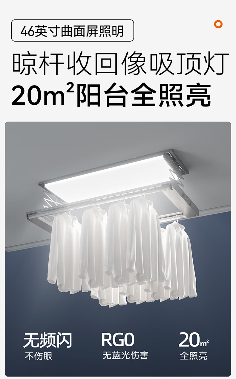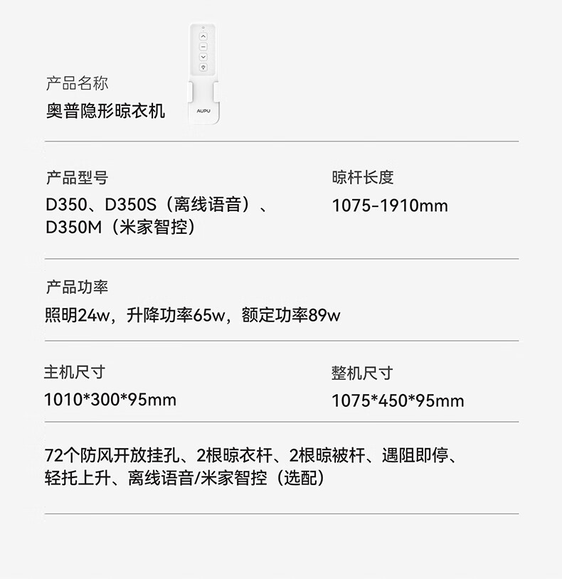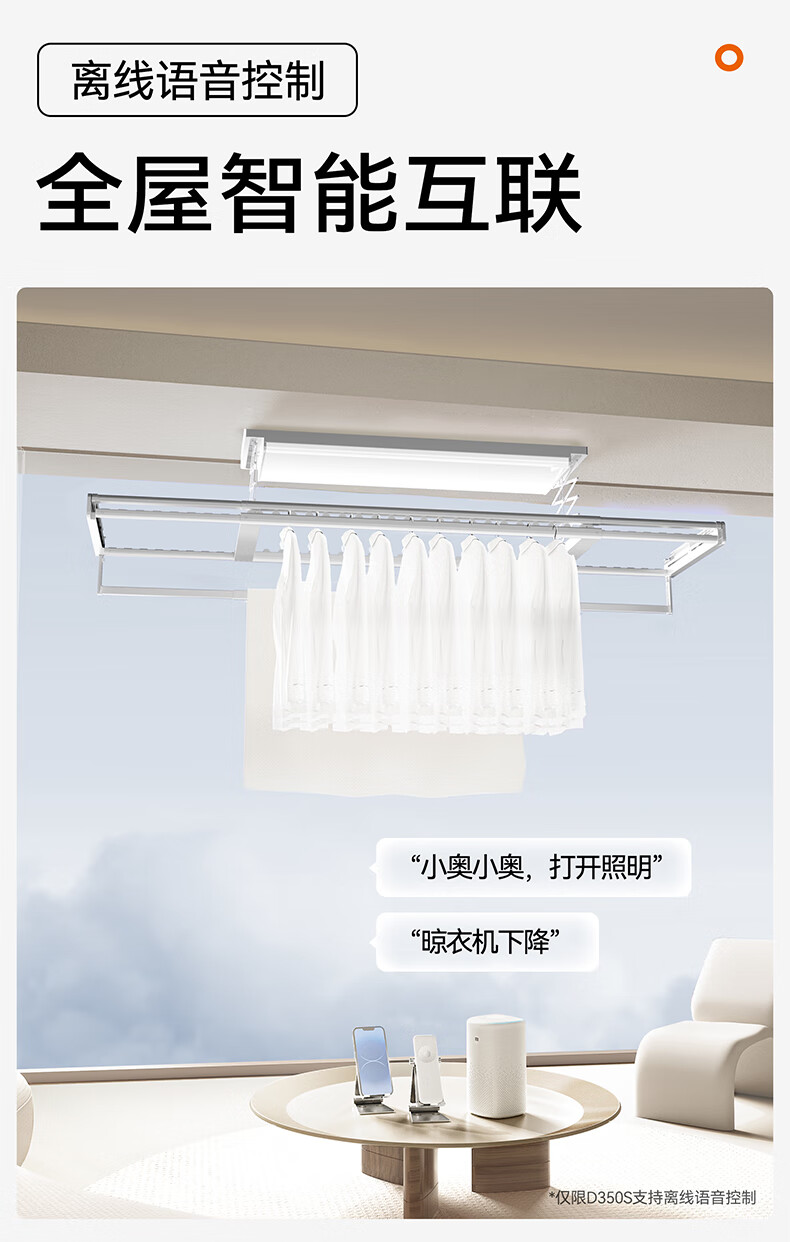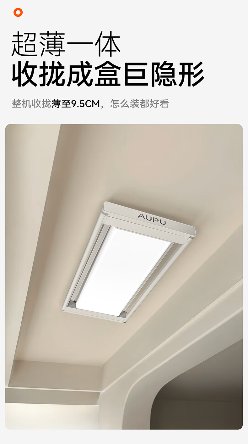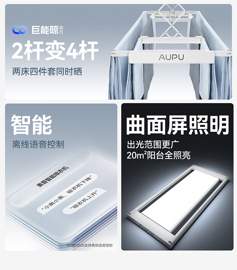 奥普(AUPU)智能晾衣机【政府补贴】电动隐形超薄遥控升降伸缩晾衣杆照明D350 D350S声控款丨伸缩四杆+整机超薄+大屏照明+声控