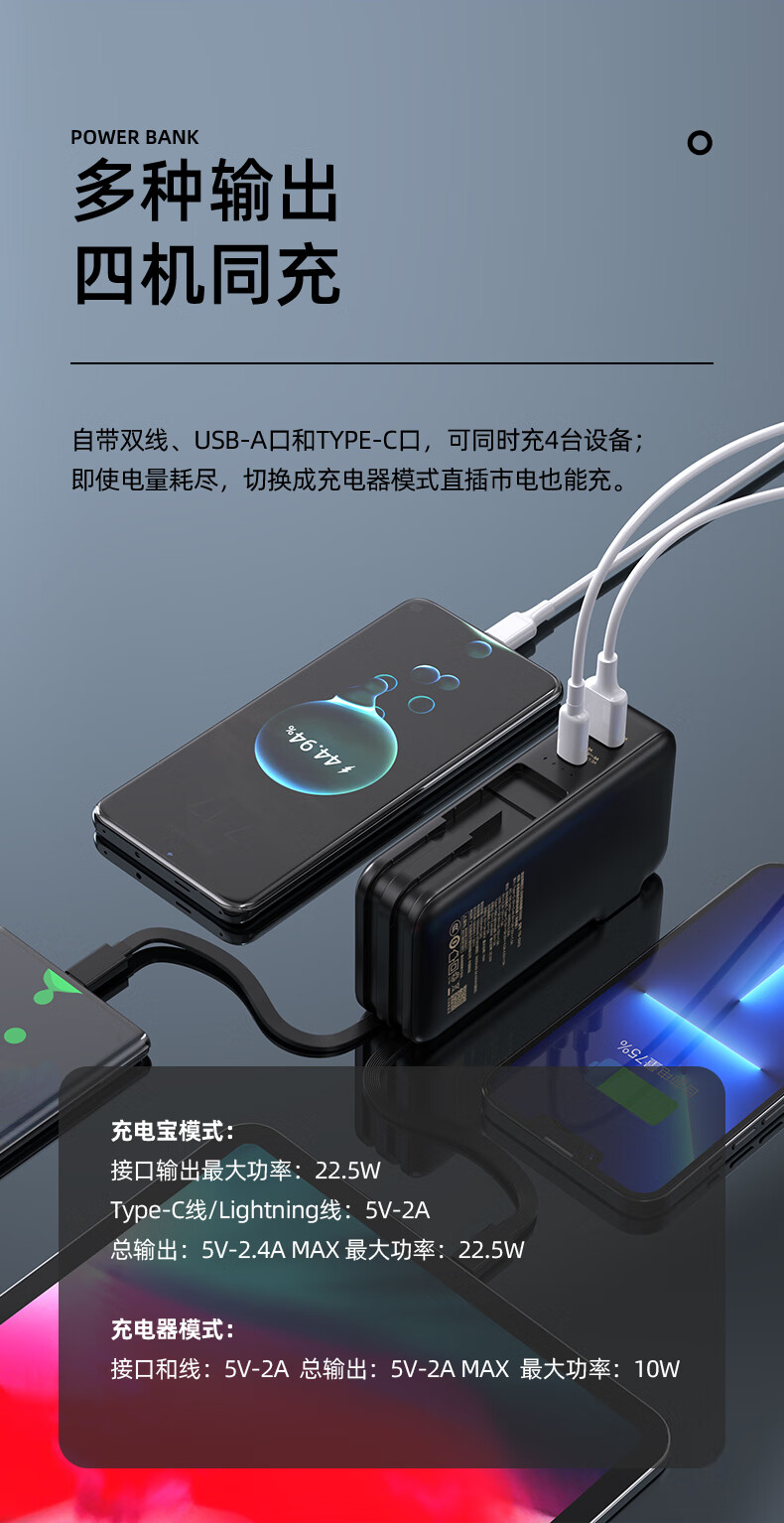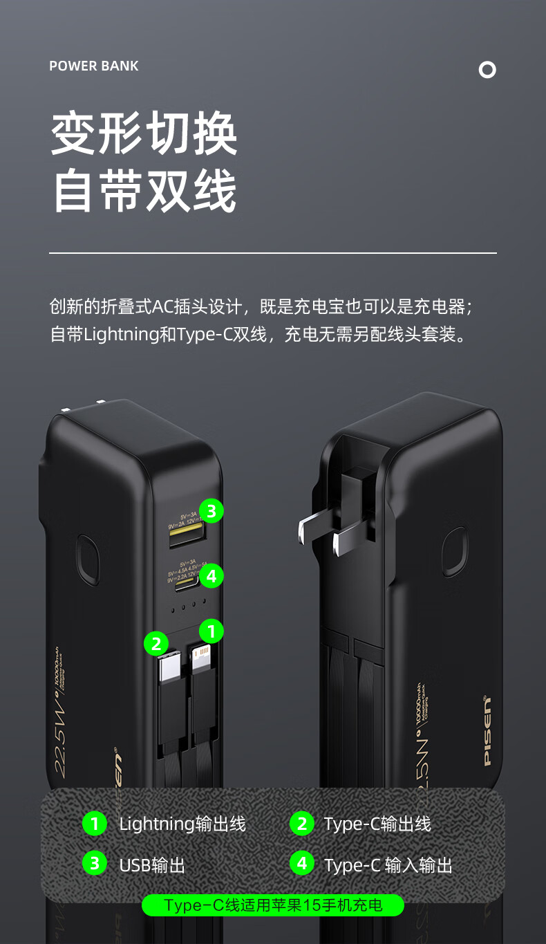 品胜【3C认证】充电宝自带线插头充电器三合一10000毫安可上飞机22.5W快充移动电源适用苹果17promax黑