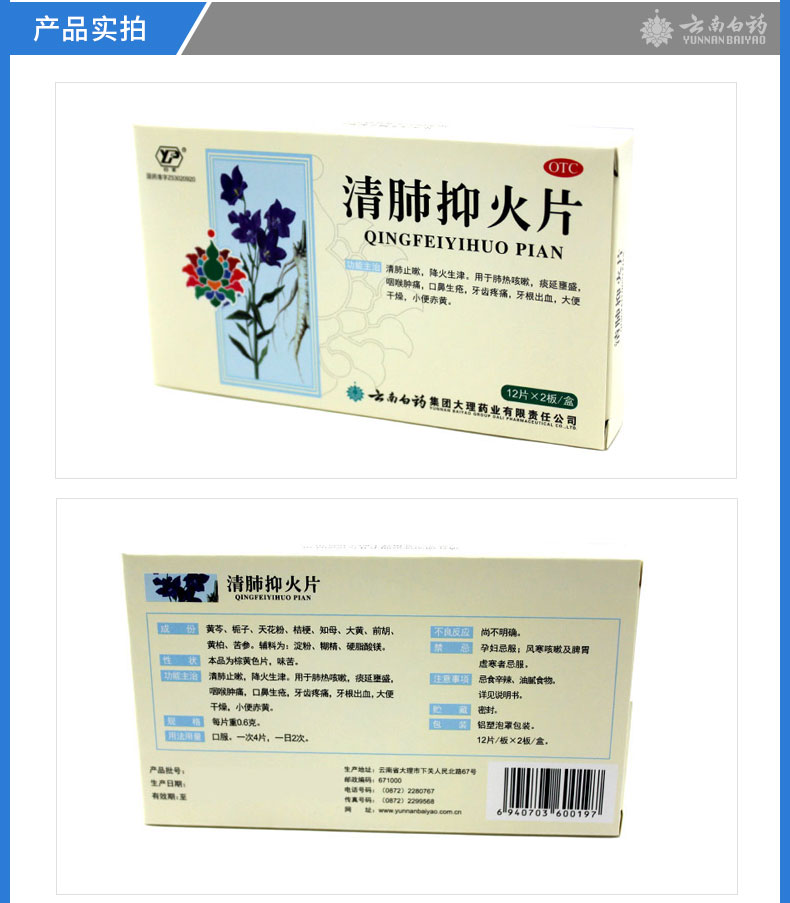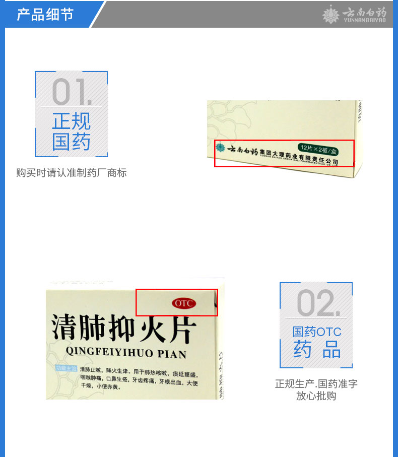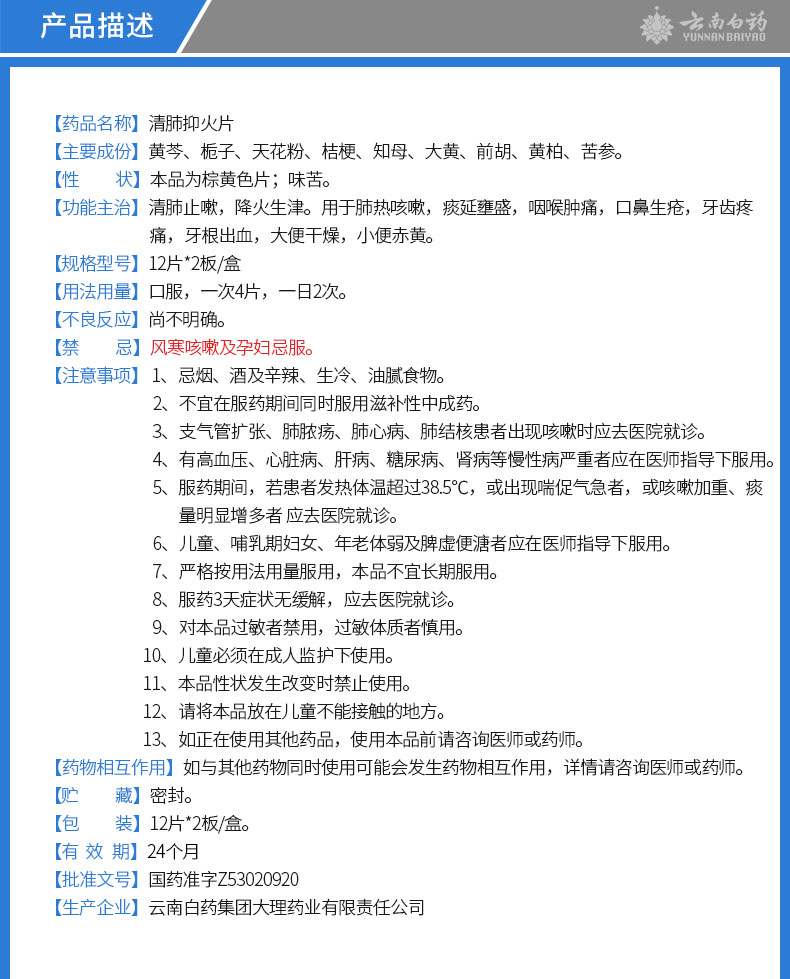 云南白药 清肺抑火片24片/盒清肺止咳 咽喉肿痛 大便干燥 小便赤黄 牙根出血 牙齿疼痛 1盒装