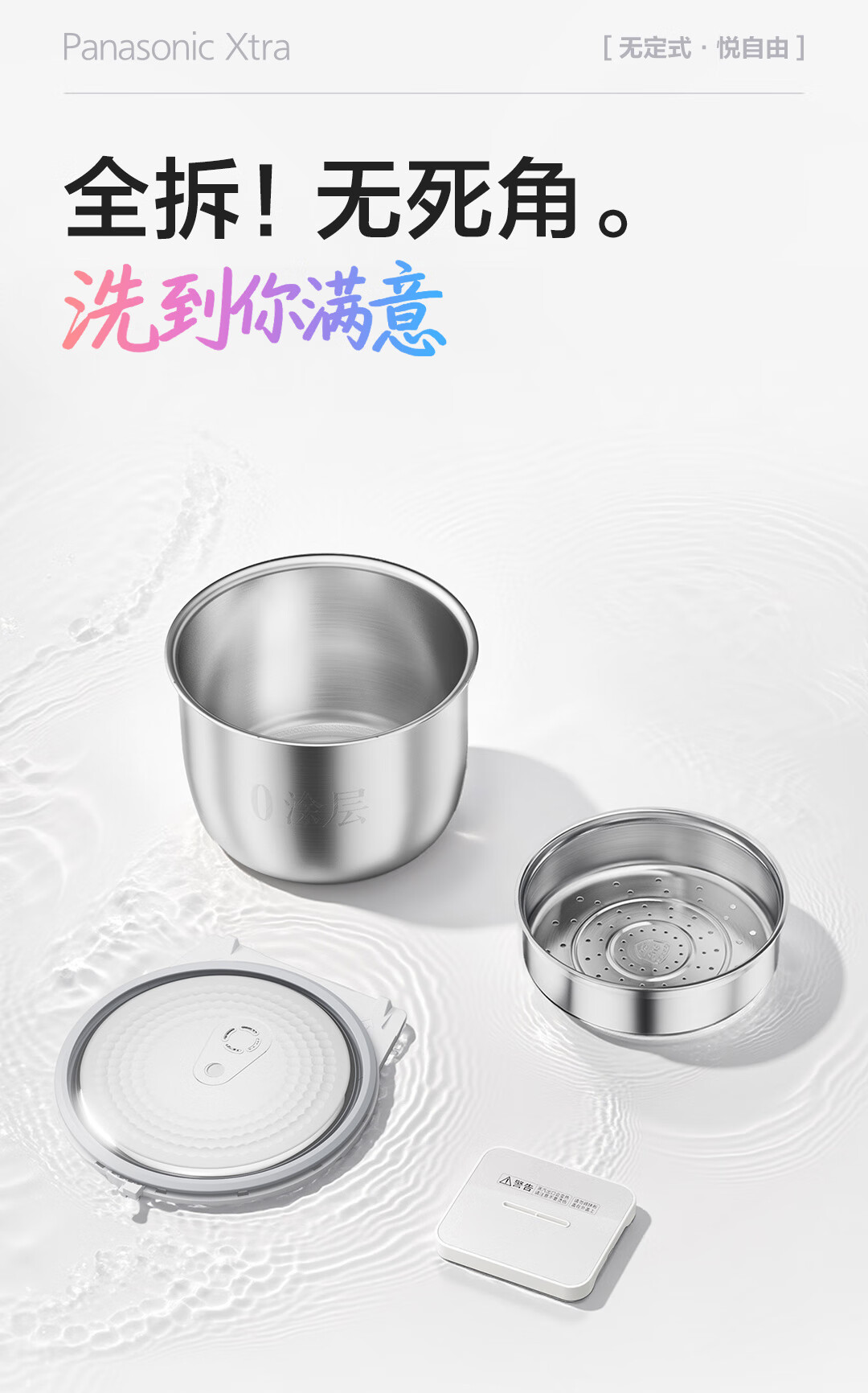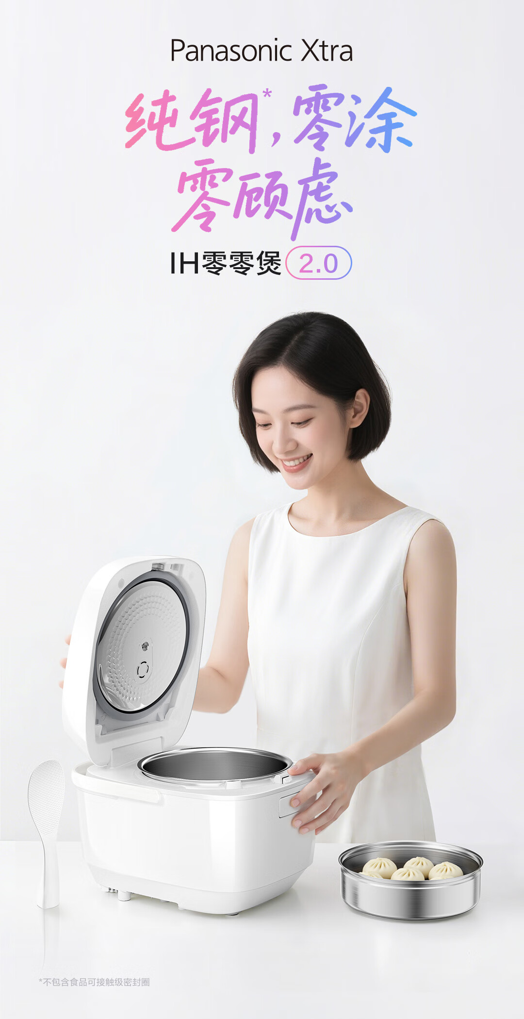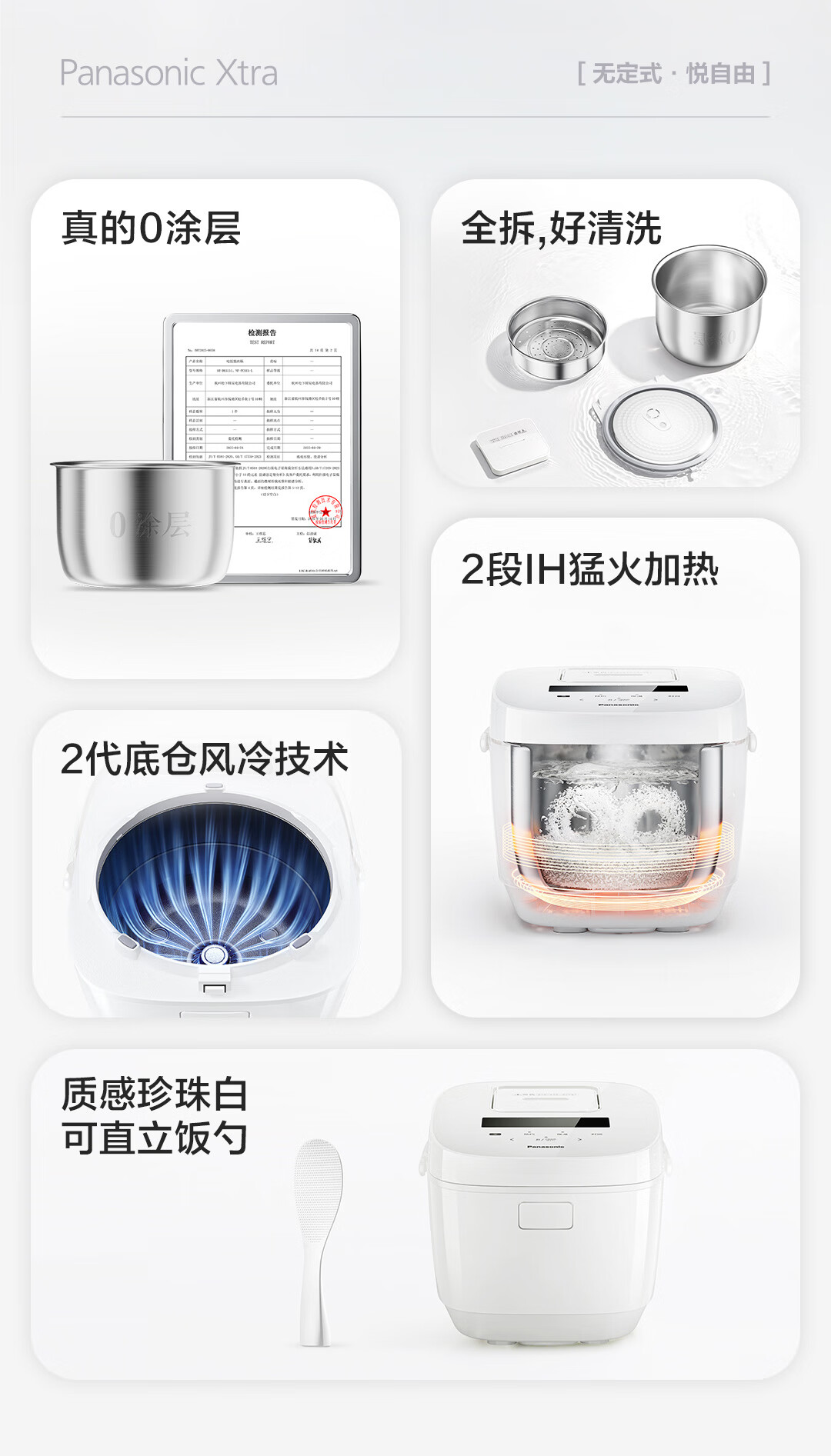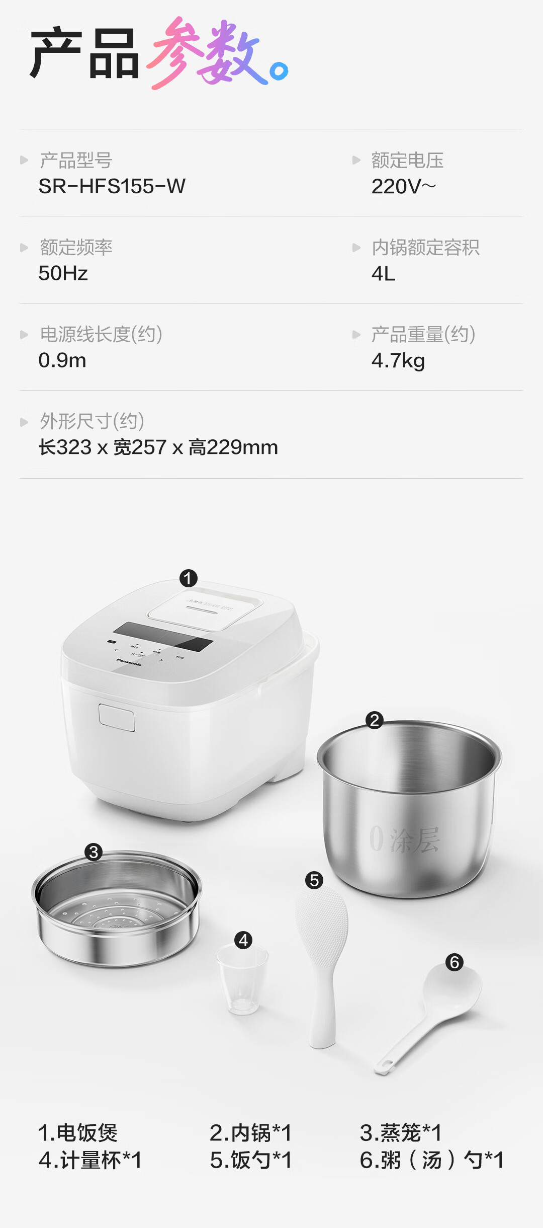 松下(Panasonic)【国家补贴20%】Xtra零零煲2.0电饭煲0涂层家用电饭锅4-5人IH无涂层不锈钢4升一级能效SR-HFS155-W