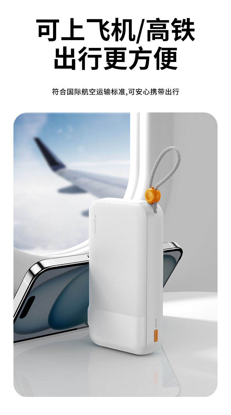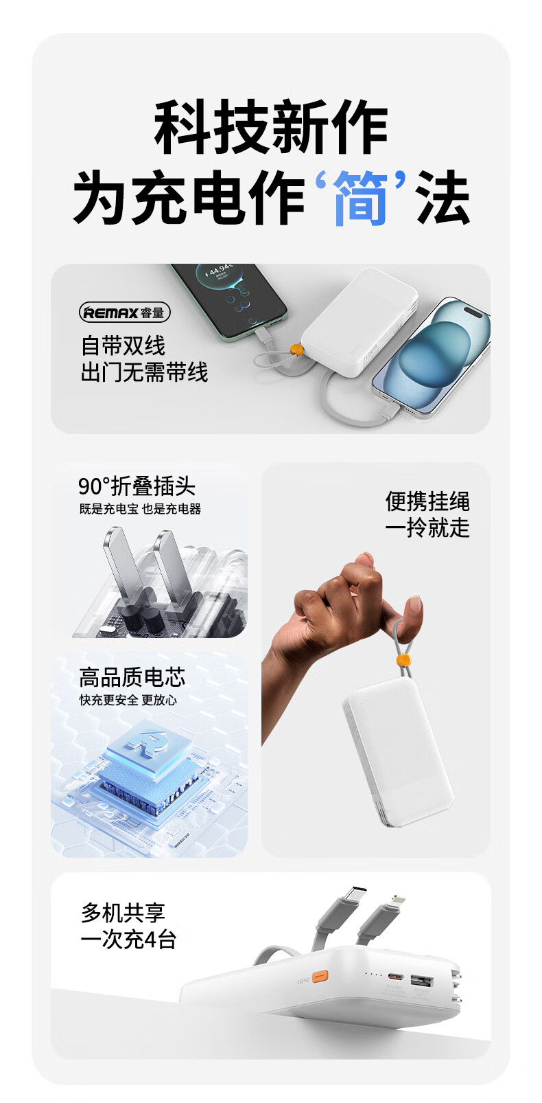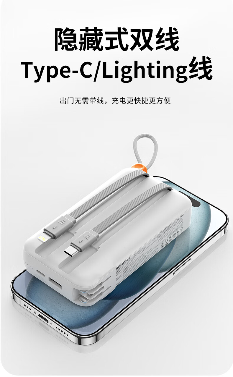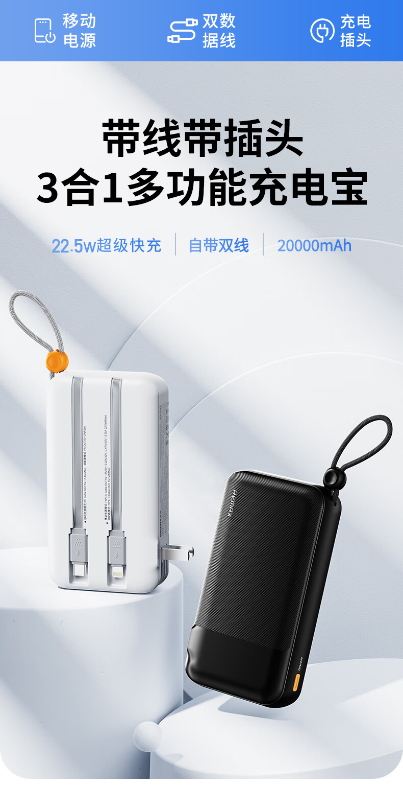 remax睿量3C认证20000mAh自带双线插头充电宝快充三合一便携22.5W移动电源适用苹果17华为小米可上飞机